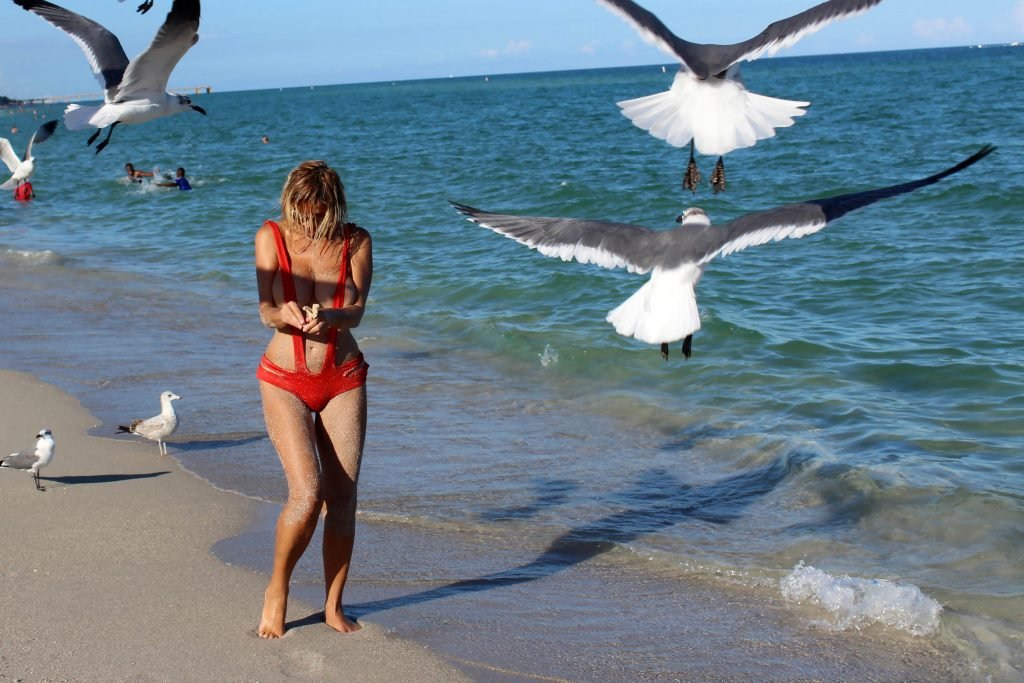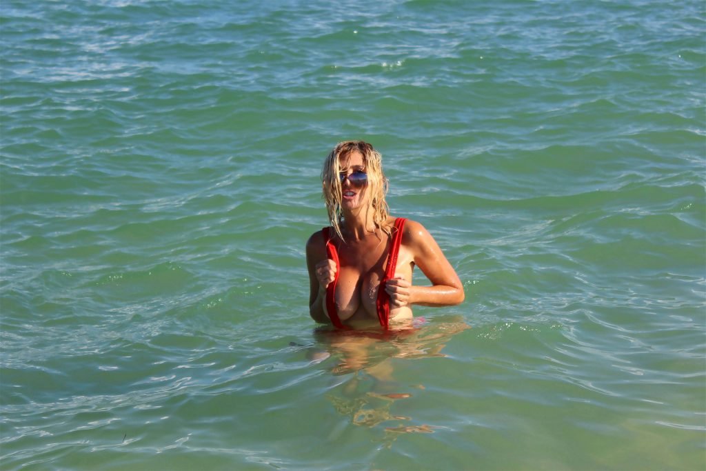 Российская поп-певица и активистка Надея Волиянова запечатлена в откровенном красном бикини на пляже в Каннах, 14.05.2018. Обладательница пышных форм, 31-летняя блондинка, продемонстрировала свои большие груди фотографу.