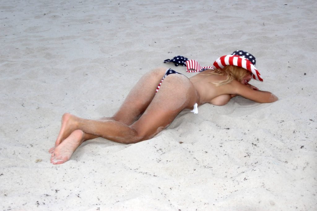 30-летняя российско-французская поп-звезда Надея Волиянова демонстрирует свою приверженность США в эти выходные 4 июля в откровенном бикини в звёздах и полосах, Майами-Бич, 03.07.2017.