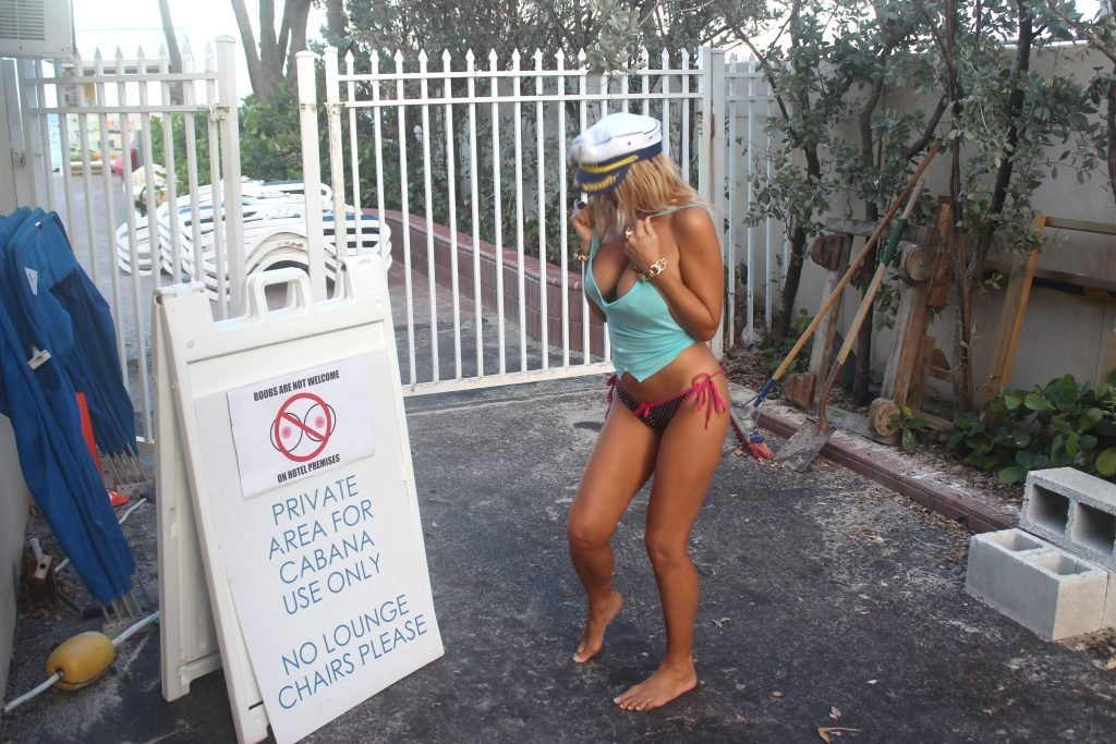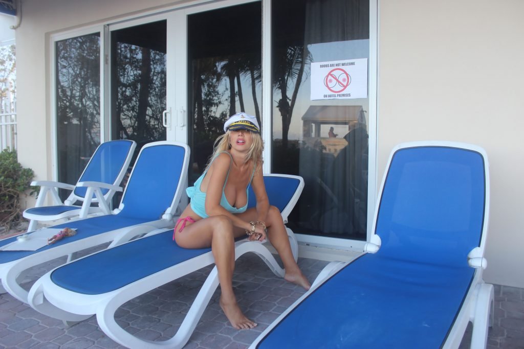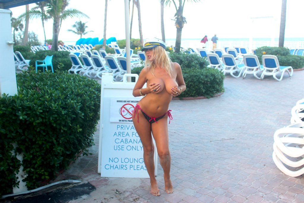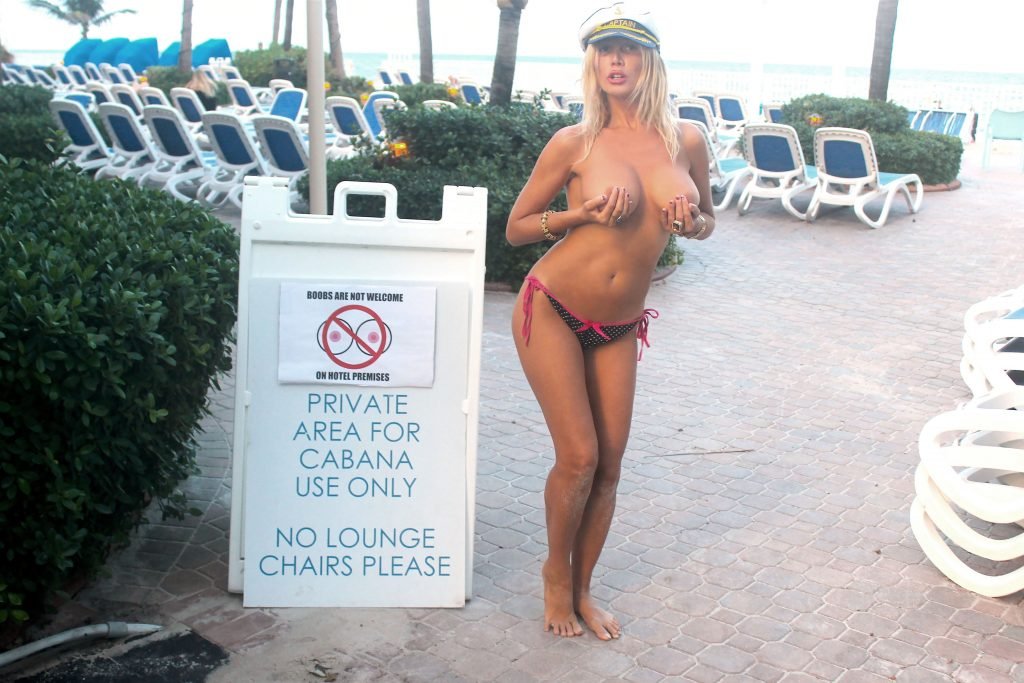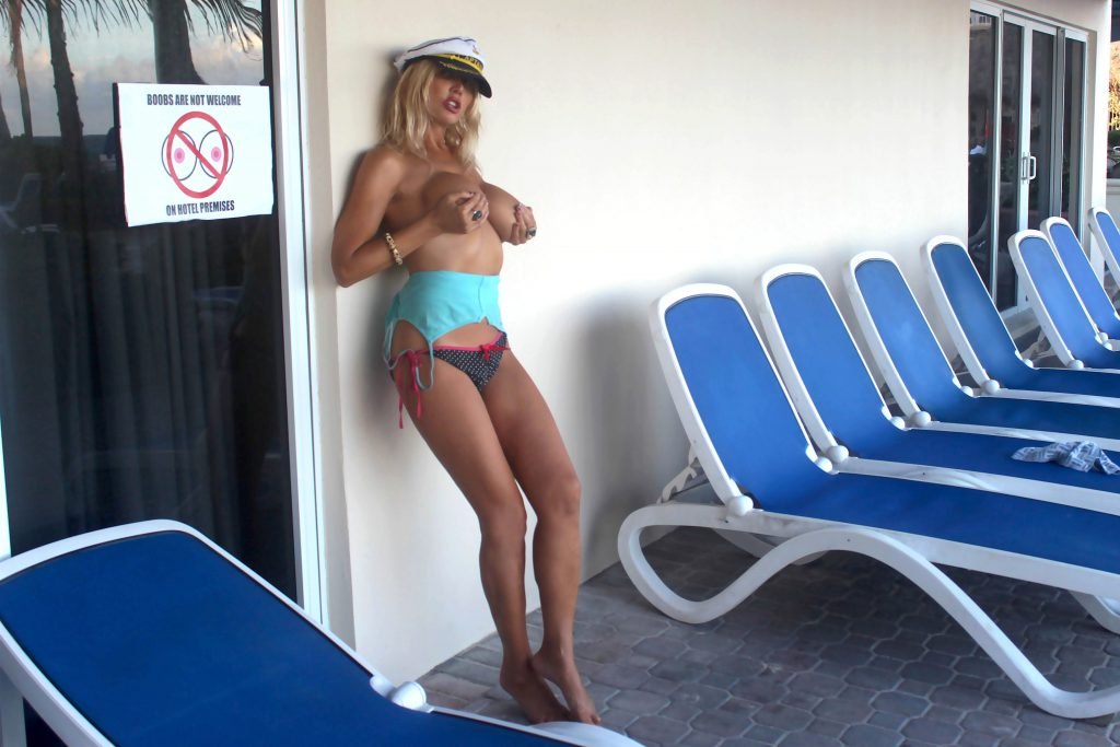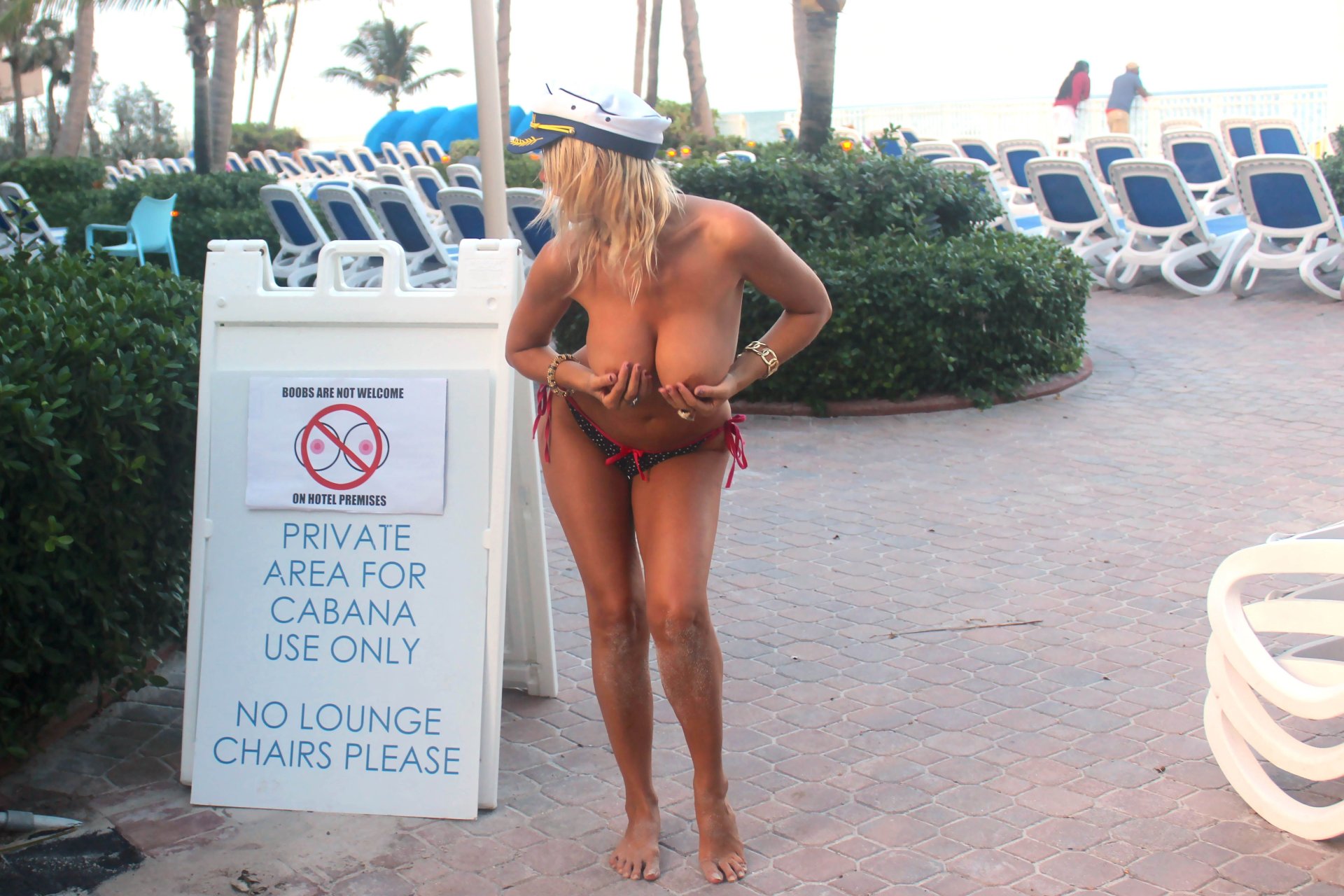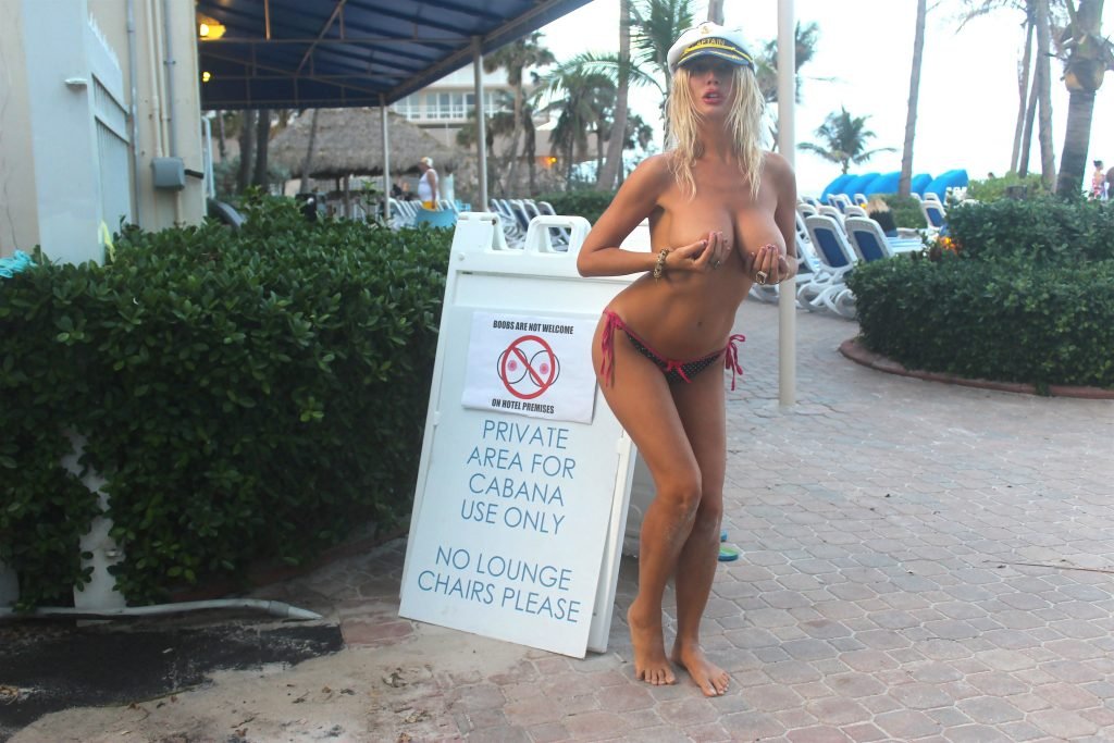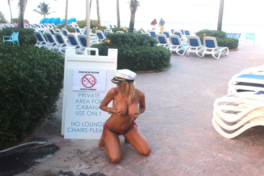 Российская поп-певица Надея Волиянова позирует с фальшивым знаком «Грудь запрещена» в отеле в Майами, 24.10.2017, где персонал на видео потребовал от неё выехать и остановиться в другом месте, потому что она не носила бюстгальтер под рубашкой.