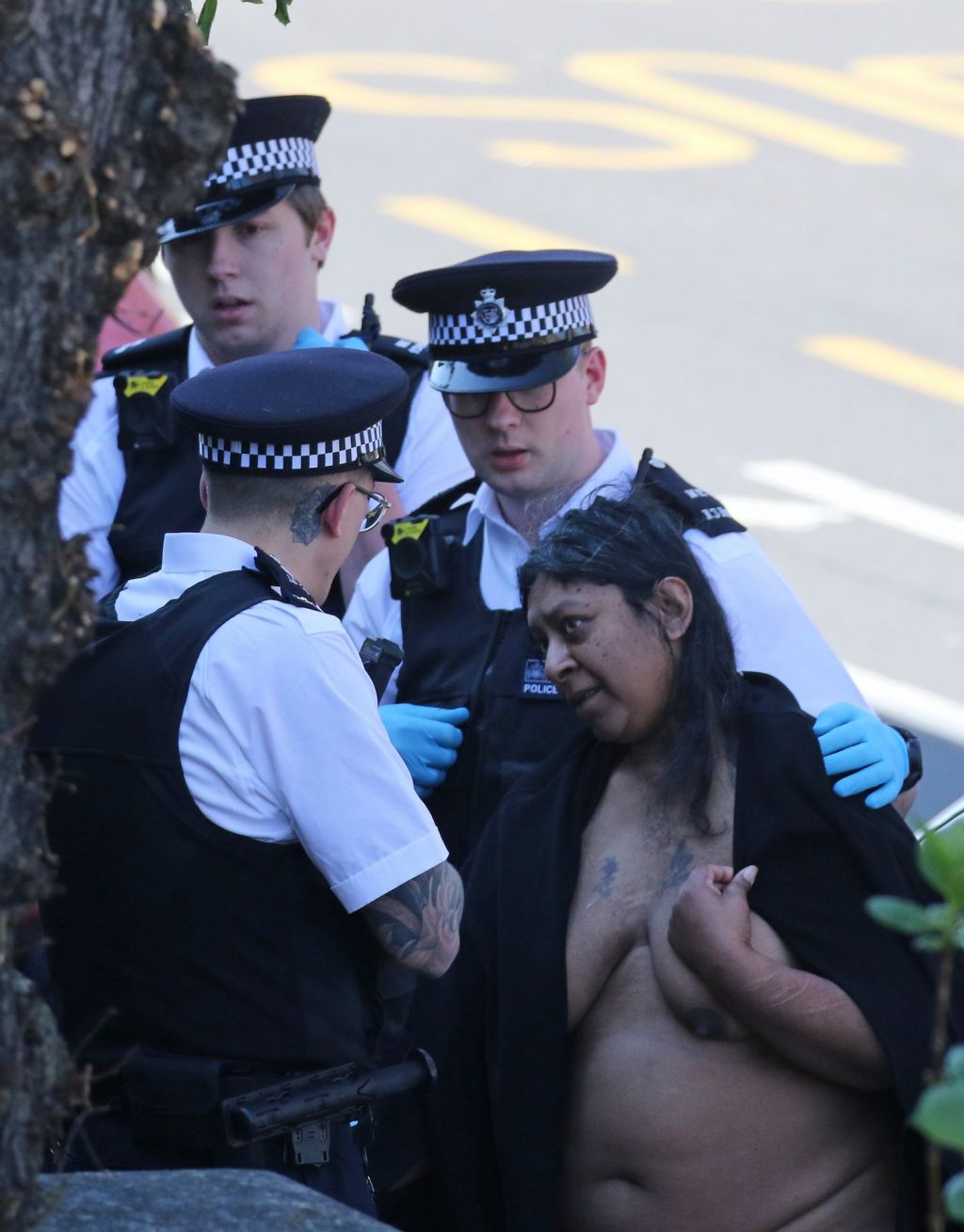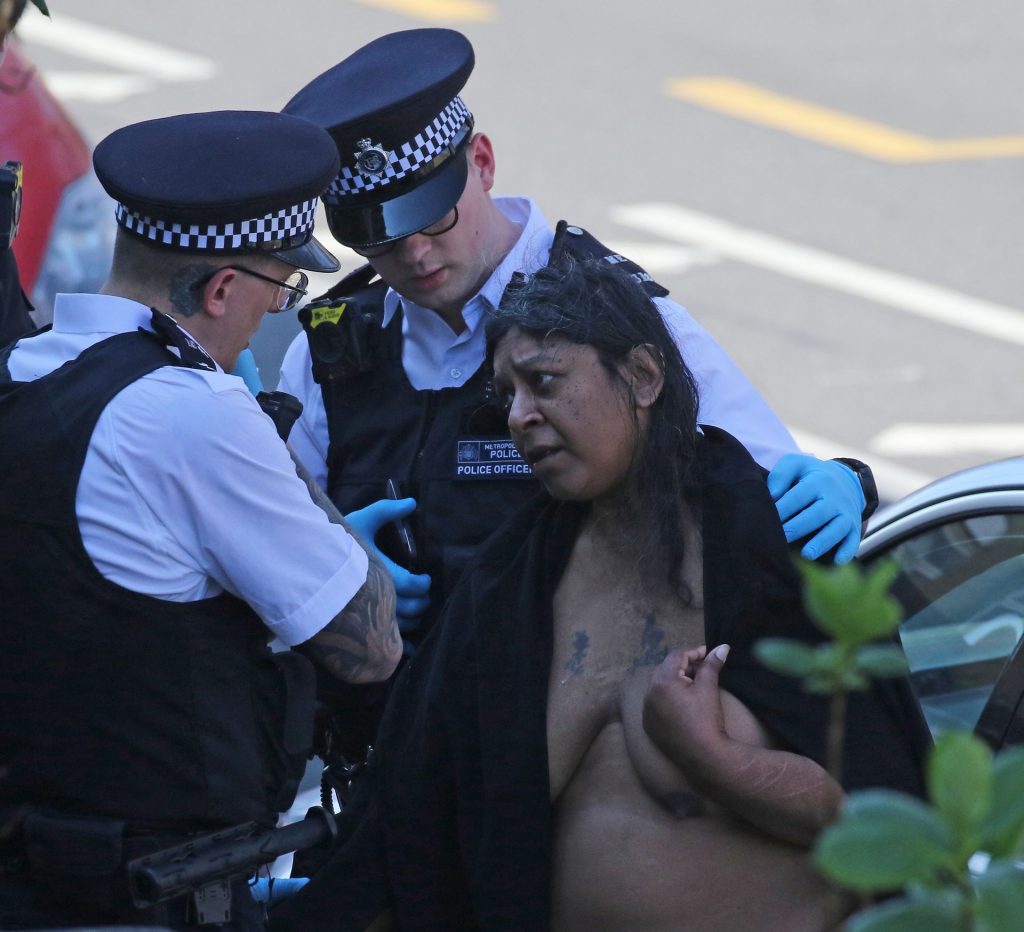 Метрополитенская полиция задерживает обнажённую женщину возле 156 Portway, Стратфорд, на фоне глобальной пандемии коронавируса COVID-19 в Лондоне, Великобритания, 26.03.2020.