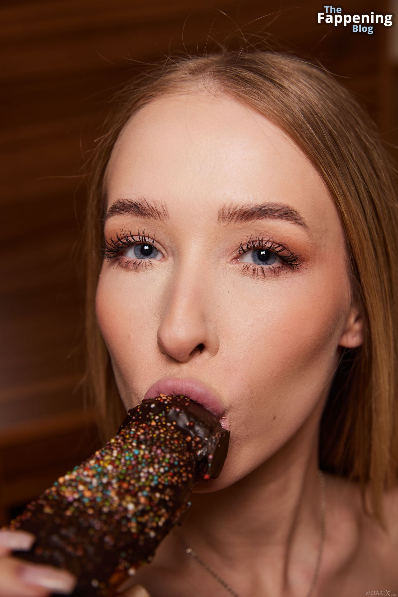 На этих свежих снимках стройная, загорелая блондинка озорно стягивает трусики, полностью обнажаясь перед камерой с видом снизу. Затем она игриво облизывает огромный торт в форме пениса. При росте 160 см она по-прежнему выглядит очень стройной на высоких каблуках, которые остаются на ней на протяжении всей фотосессии.