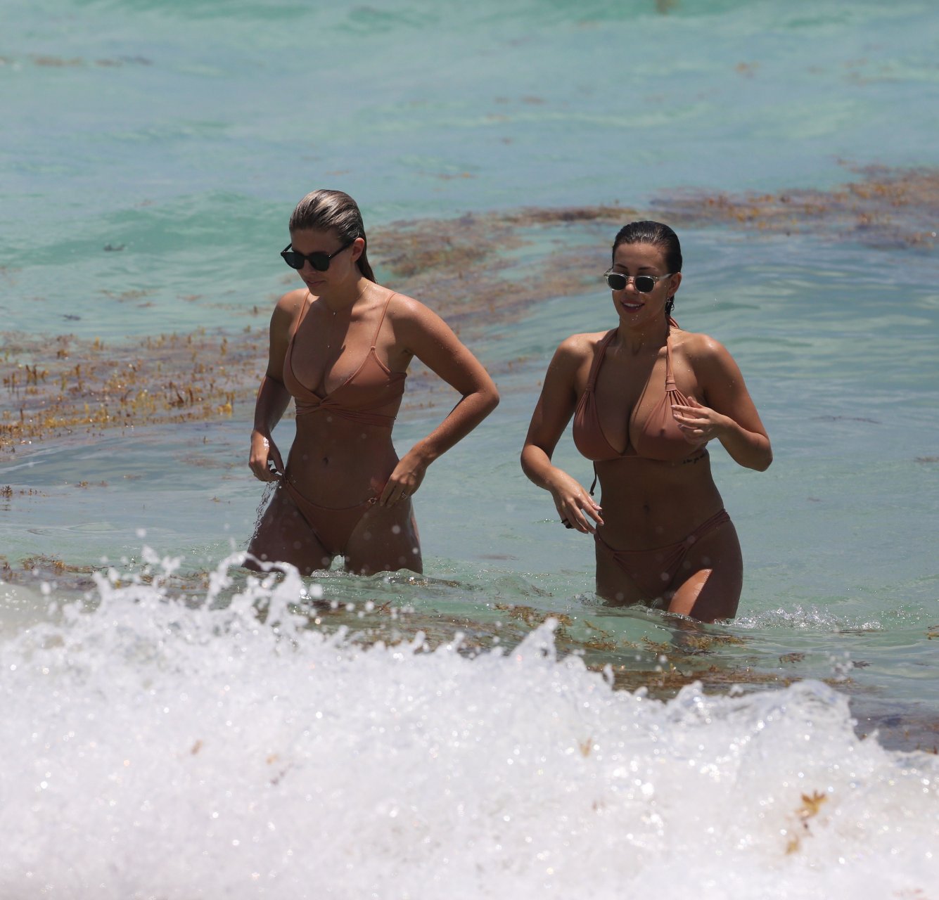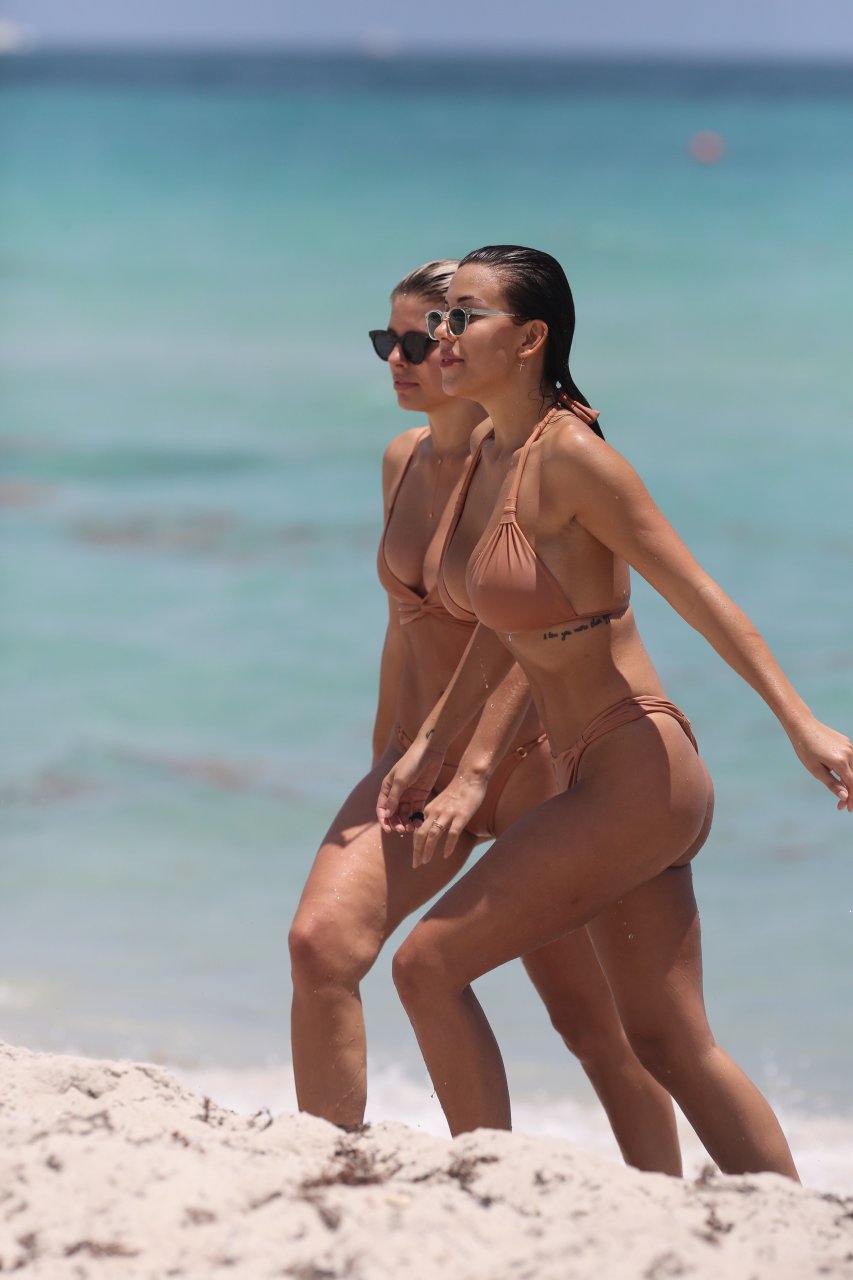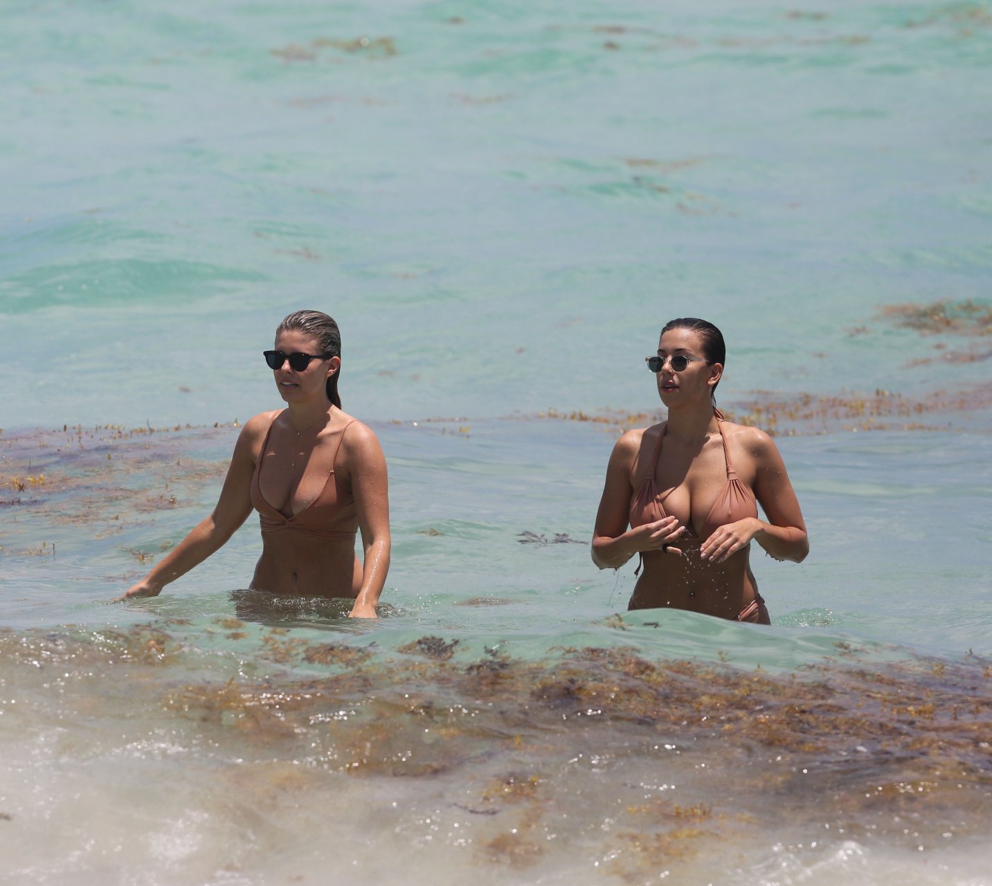 Горячие пышногрудые модели Natasha Oakley и Devin Brugman наслаждаются днем на пляже в купальниках телесного цвета в Майами, 04.05.2017.
