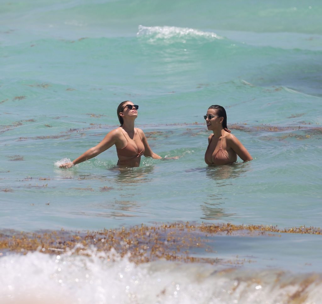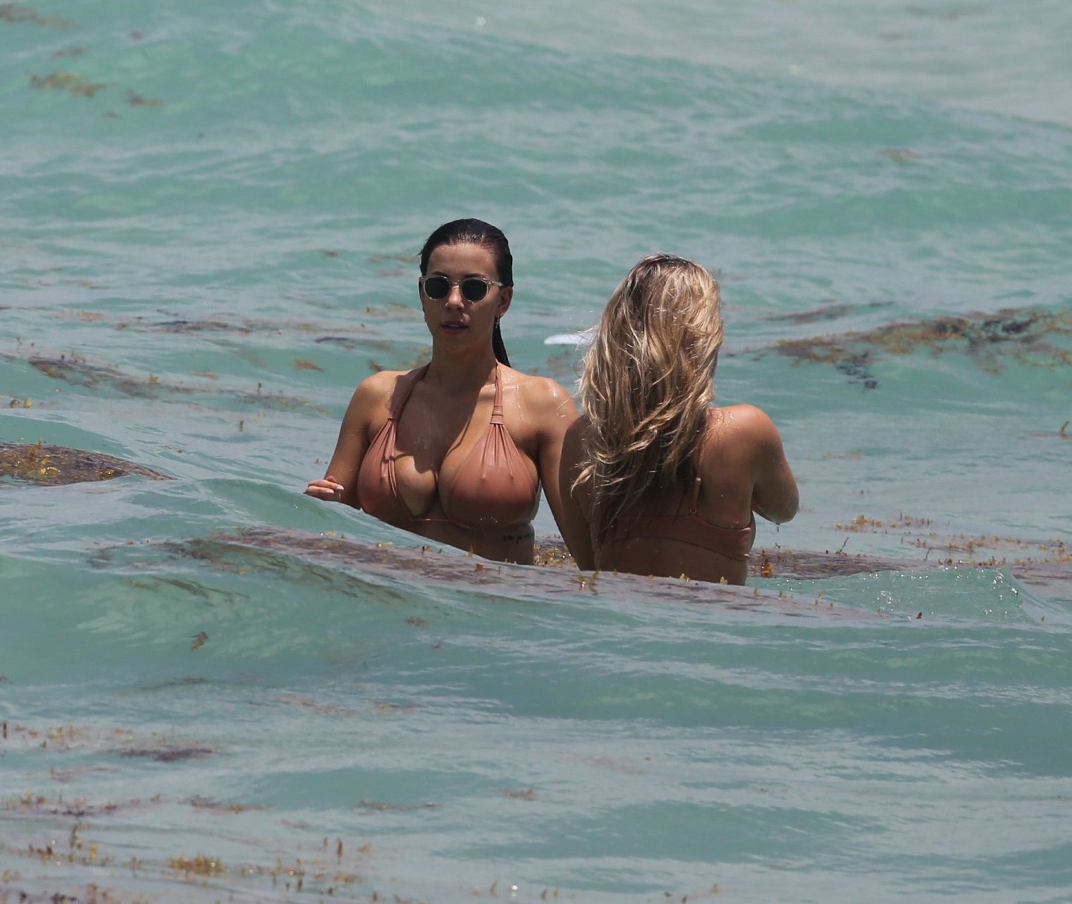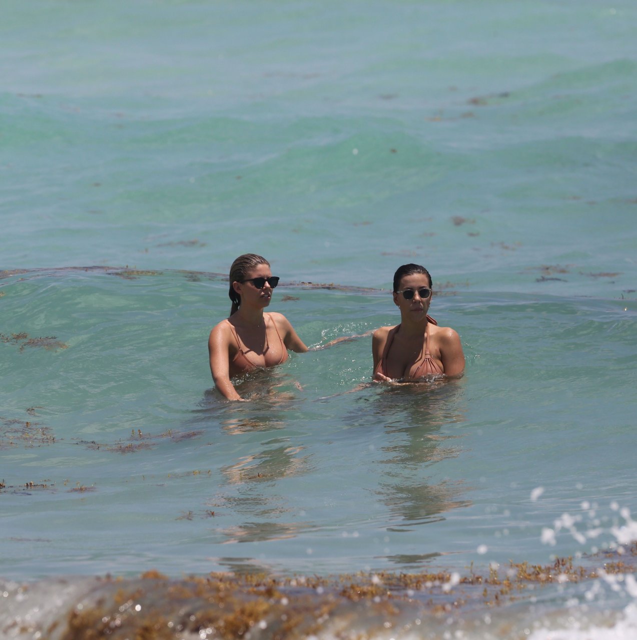 Горячие пышногрудые модели Natasha Oakley и Devin Brugman наслаждаются днем на пляже в купальниках телесного цвета в Майами, 04.05.2017.