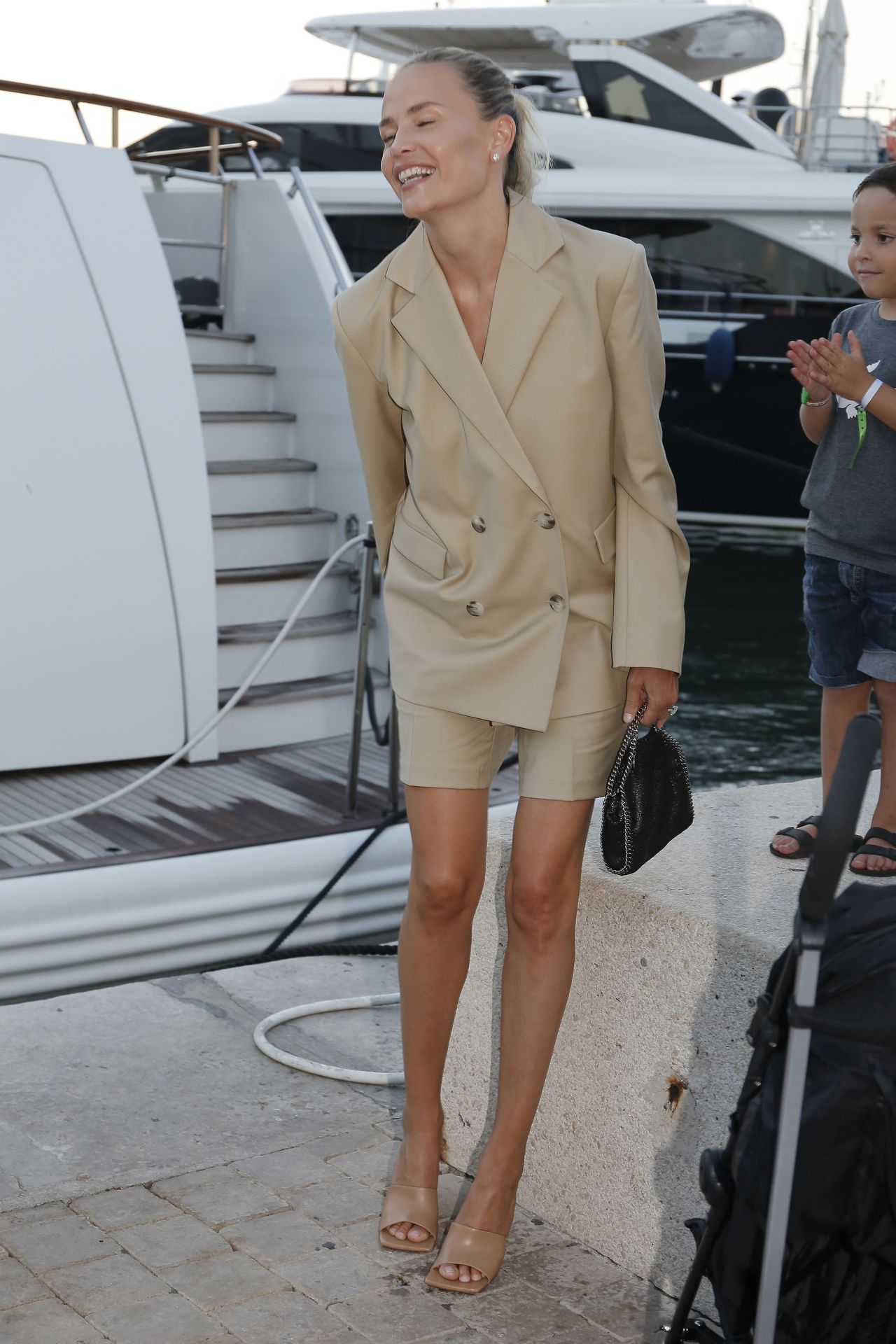 Модель Наташа Поли (34) выходит из своей яхты в ярком пиджаке и подходящих шортах на ужин в Сен-Тропе, 28.06.2020.