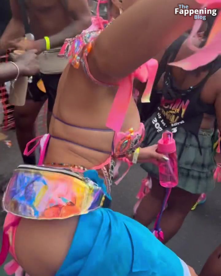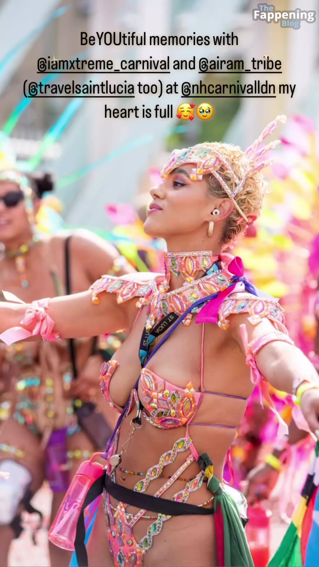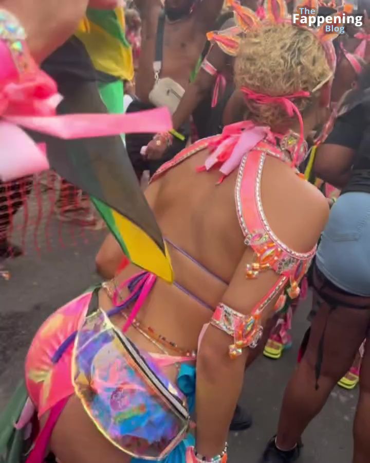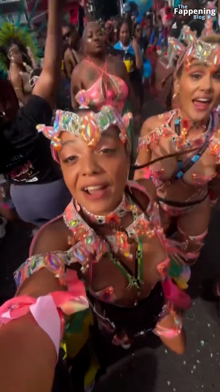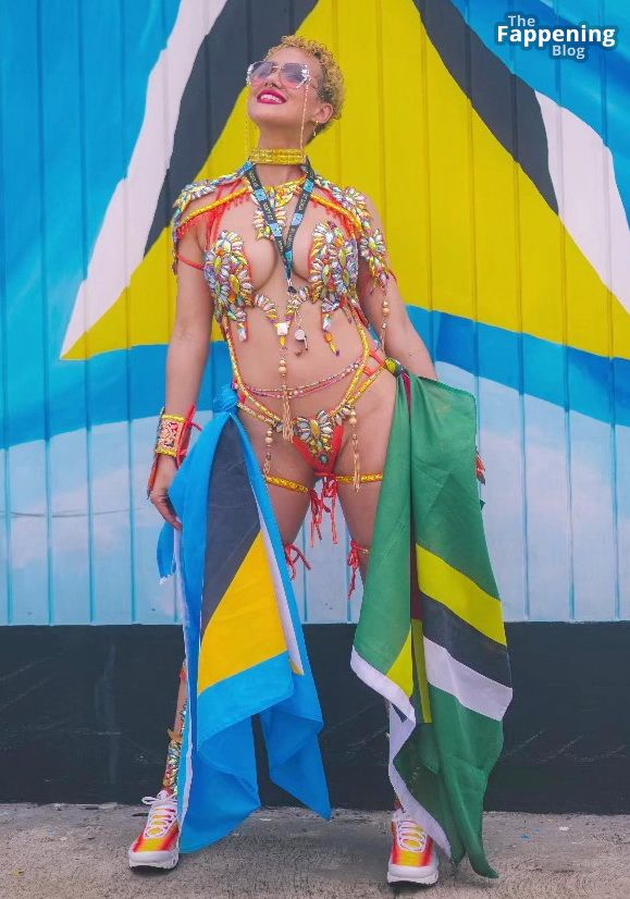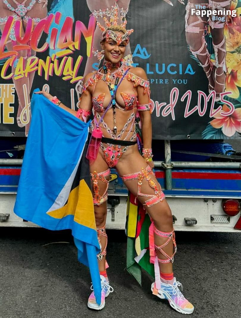 Её «костюм» представлял собой всего лишь несколько кусочков ткани, украшенных сверкающими стразами и блестящими камнями, которые едва прикрывали её тело. Этот образ был настолько дерзким, что можно смело сказать — Натали не оставила простора для воображения. Сочетание откровенности и экзотики вызвало настоящий фурор среди толпы и мгновенно сделало её звездой карнавала.