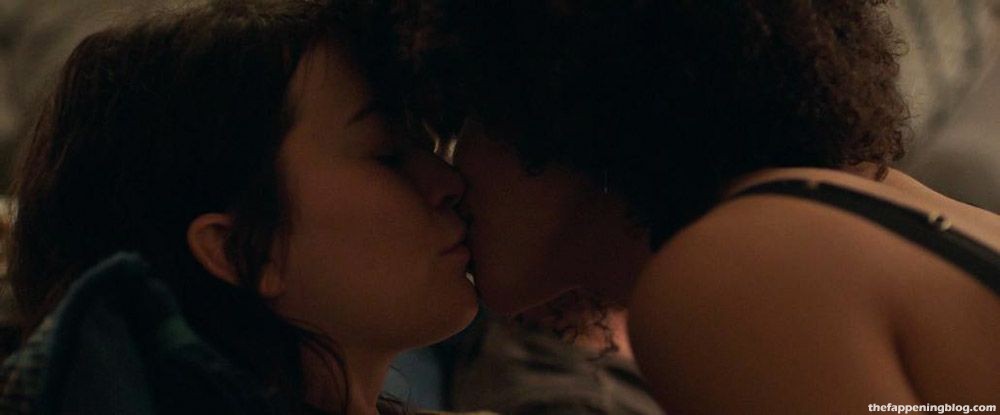 Beautiful Nathalie Emmanuel is leaning in to kiss Britt Lower as Britt sits on a couch beside a guy, and he watches the girls make out.