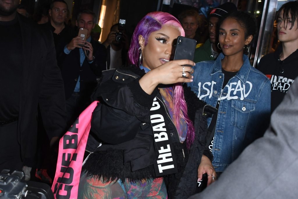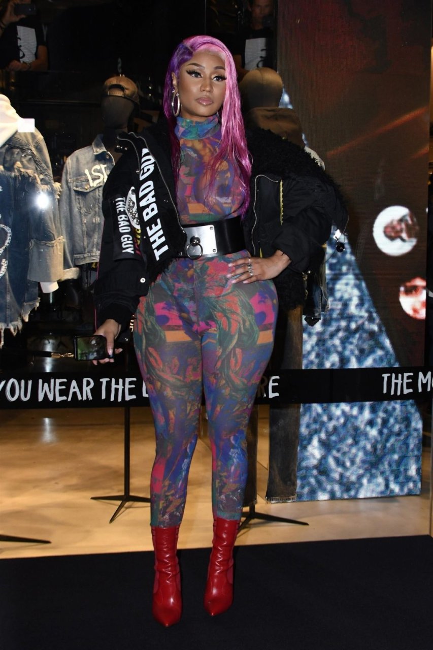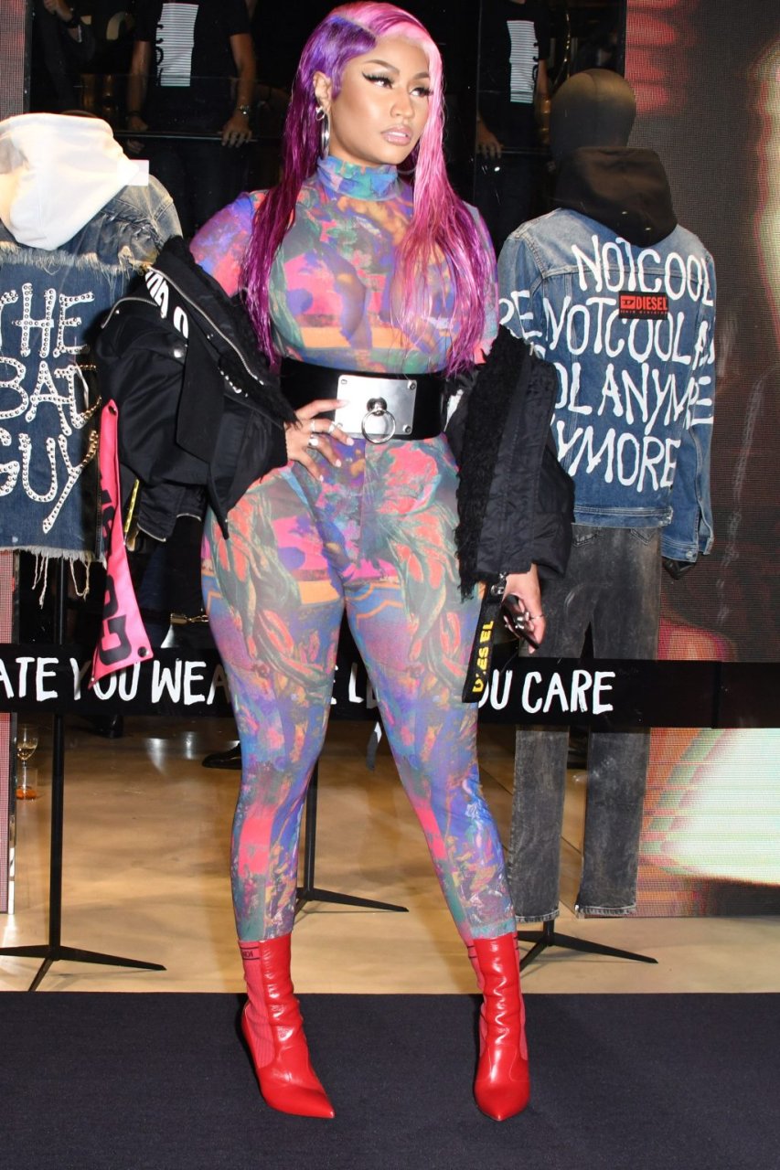 Рэперша Ники Минаж демонстрирует свои цвета в прозрачном многоцветном комбинезоне, позируя для фотографий в магазине Diesel в Милане во время Недели моды в Милане, 19.09.2018.