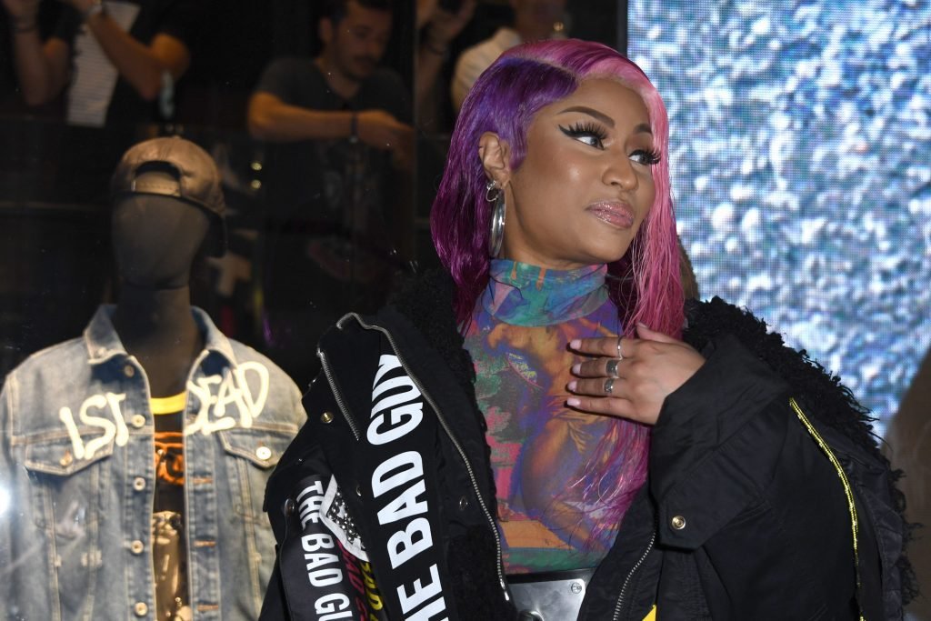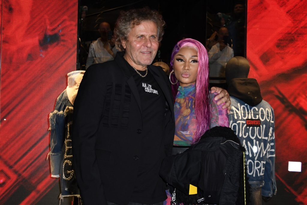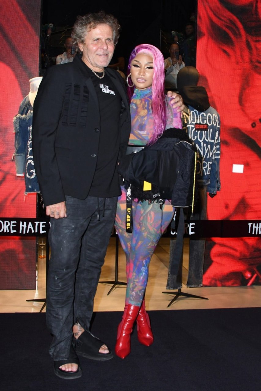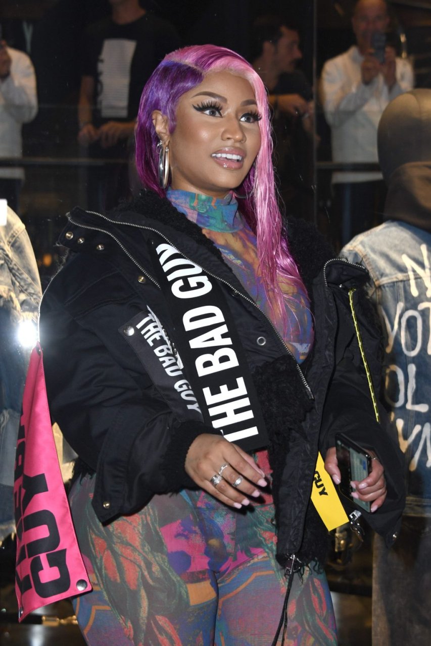 Рэперша Ники Минаж демонстрирует свои цвета в прозрачном многоцветном комбинезоне, позируя для фотографий в магазине Diesel в Милане во время Недели моды в Милане, 19.09.2018.