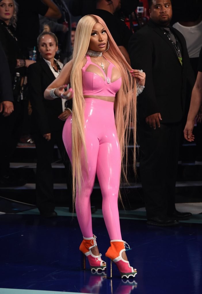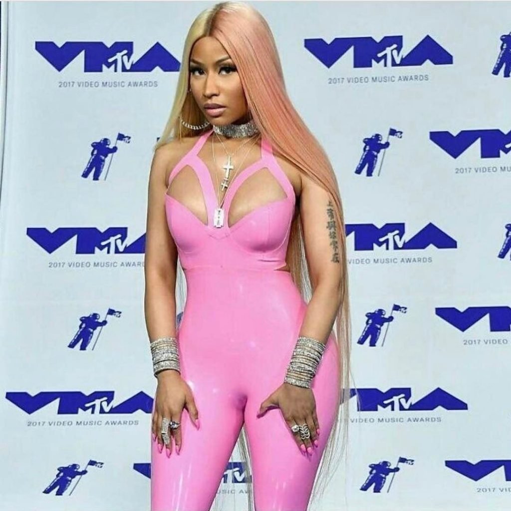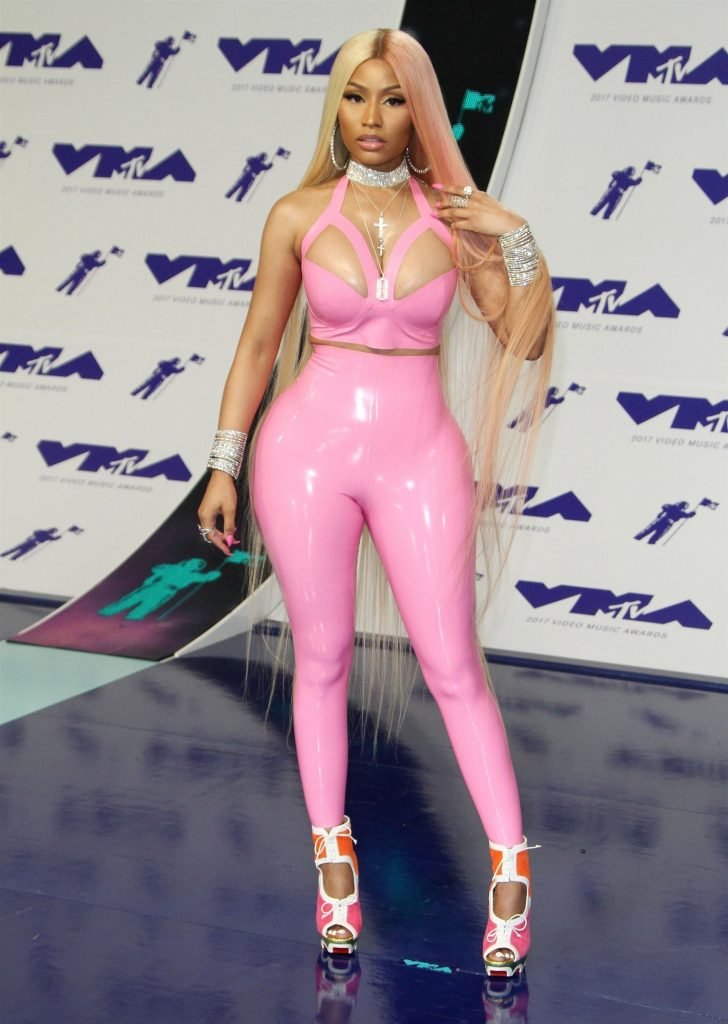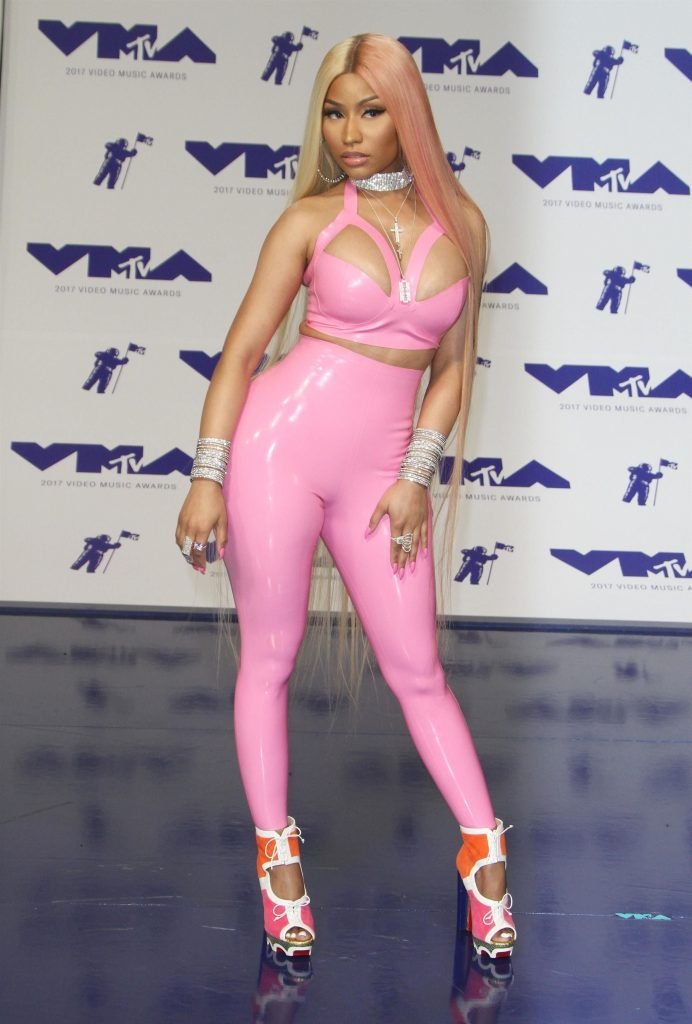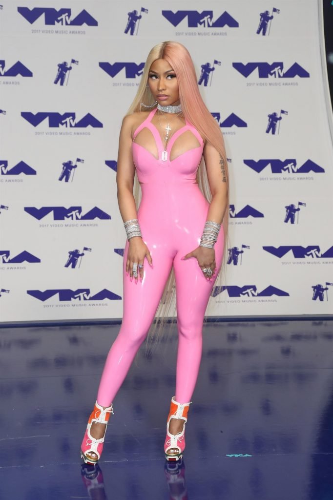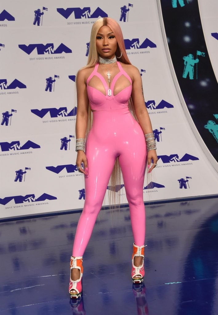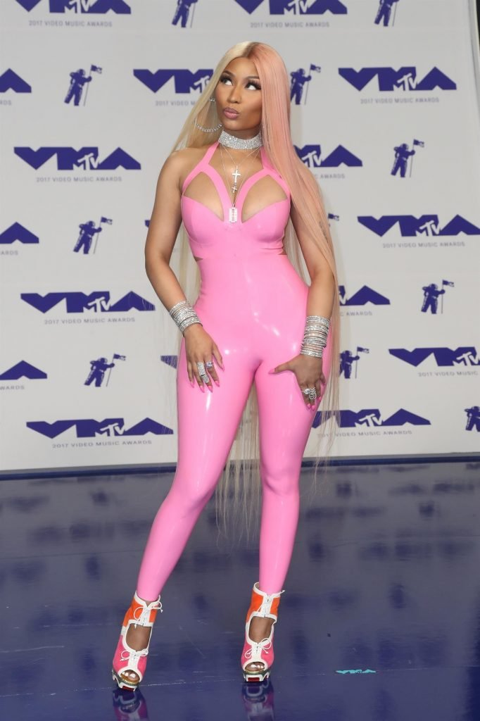 Ники Минаж чуть не вырвалась из розового латексного комбинезона на церемонии MTV Video Music Awards 2017 в Инглвуде, 27.08.2017. Оника Марадж — певица, автор песен и актриса, родившаяся на Тринидаде. Возраст — 34 года.