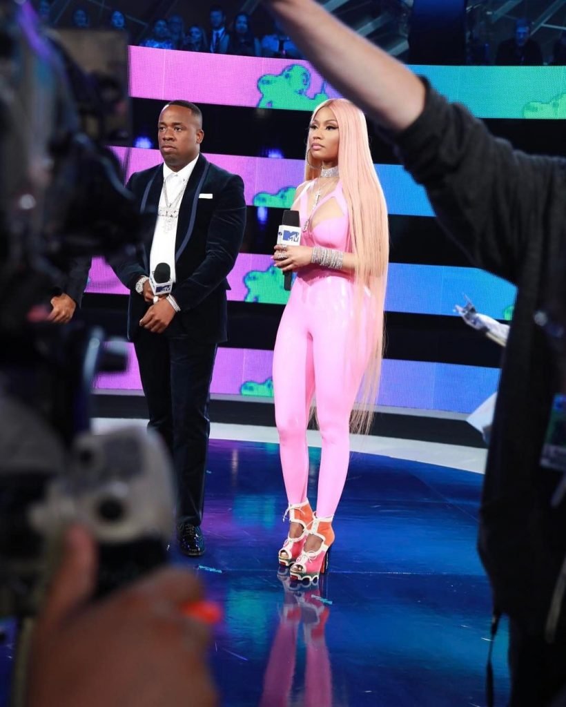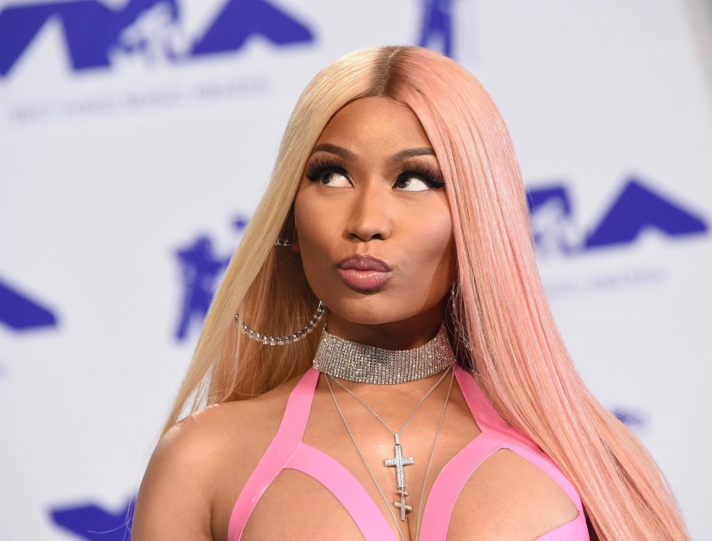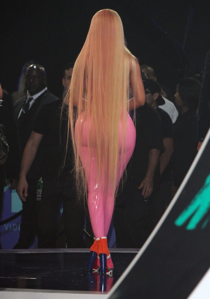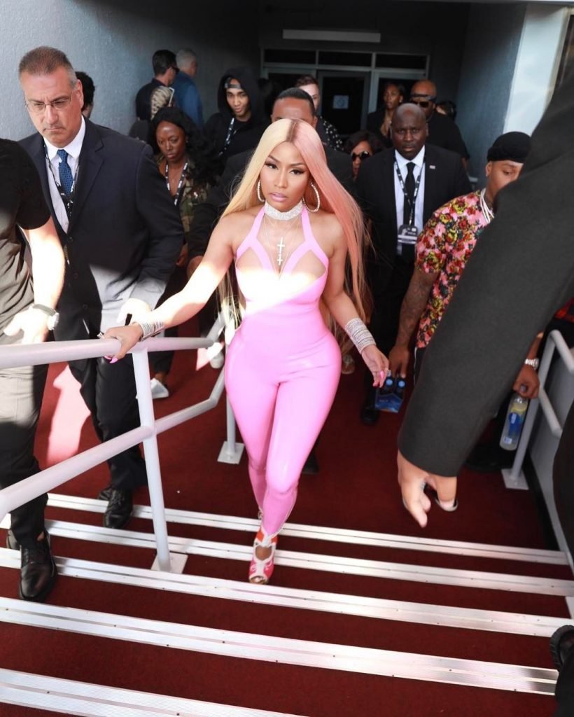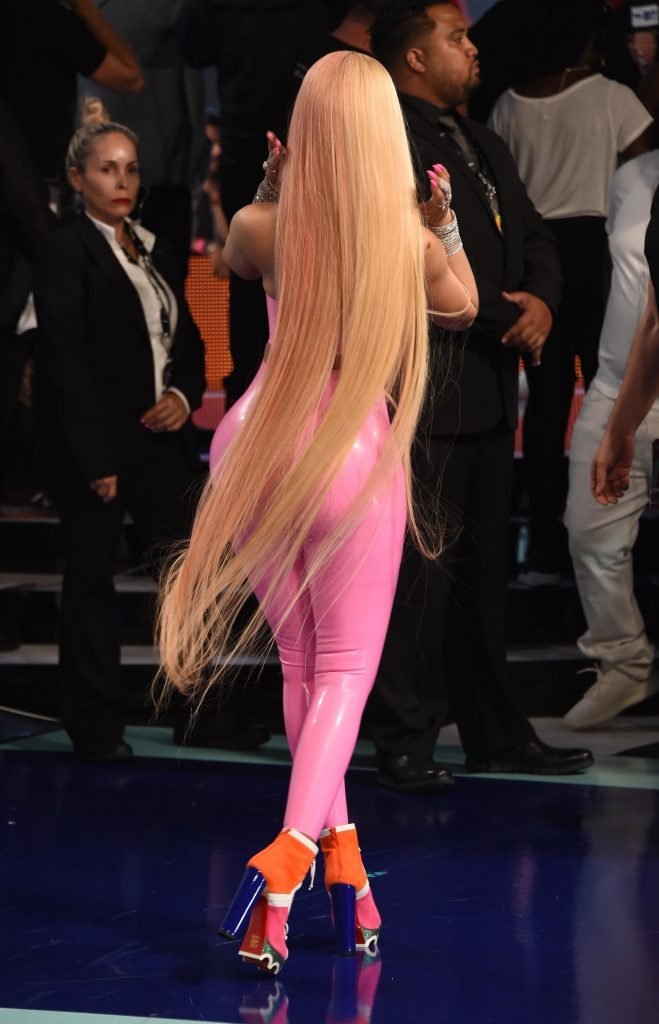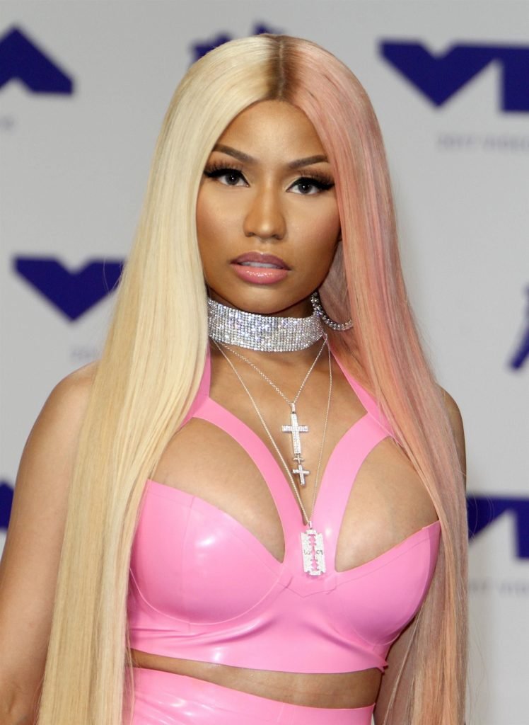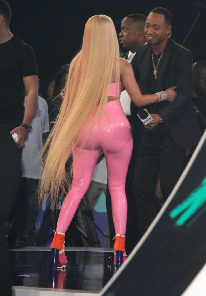 Ники Минаж чуть не вырвалась из розового латексного комбинезона на церемонии MTV Video Music Awards 2017 в Инглвуде, 27.08.2017. Оника Марадж — певица, автор песен и актриса, родившаяся на Тринидаде. Возраст — 34 года.