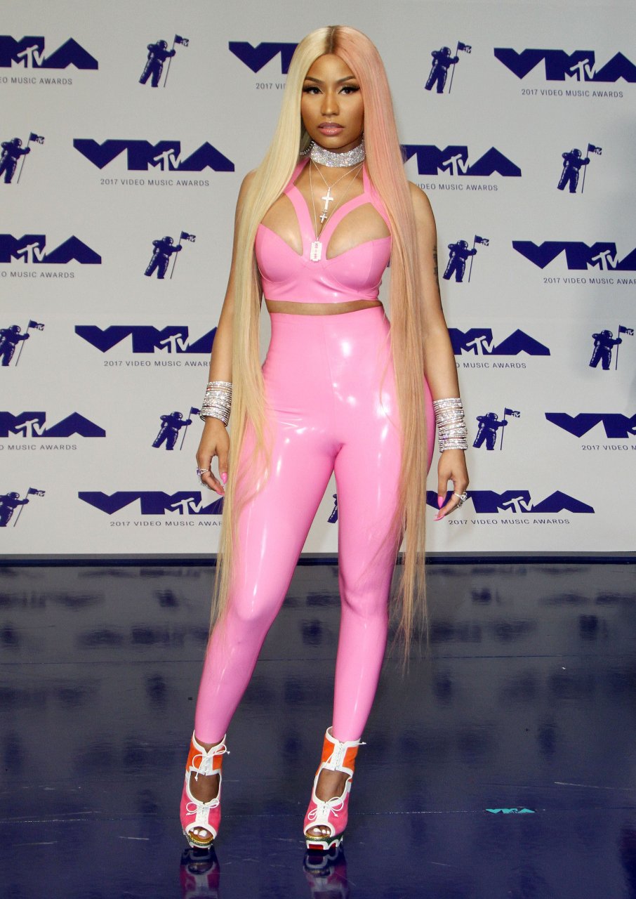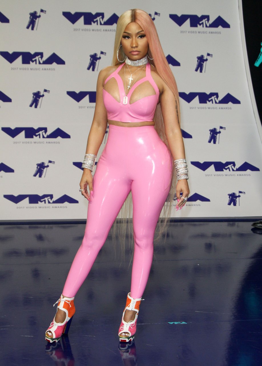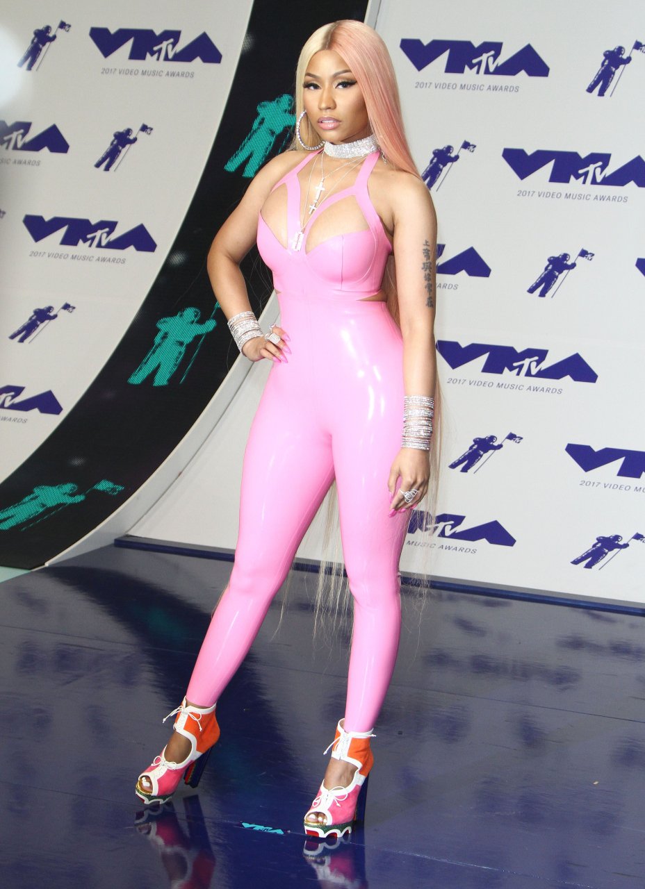 Ники Минаж чуть не вырвалась из розового латексного комбинезона на церемонии MTV Video Music Awards 2017 в Инглвуде, 27.08.2017. Оника Марадж — певица, автор песен и актриса, родившаяся на Тринидаде. Возраст — 34 года.