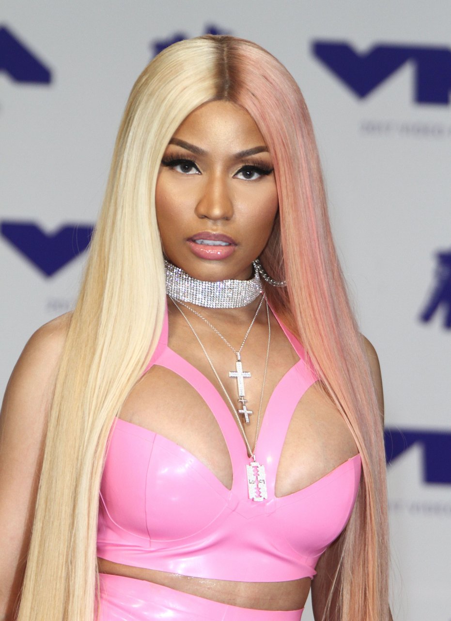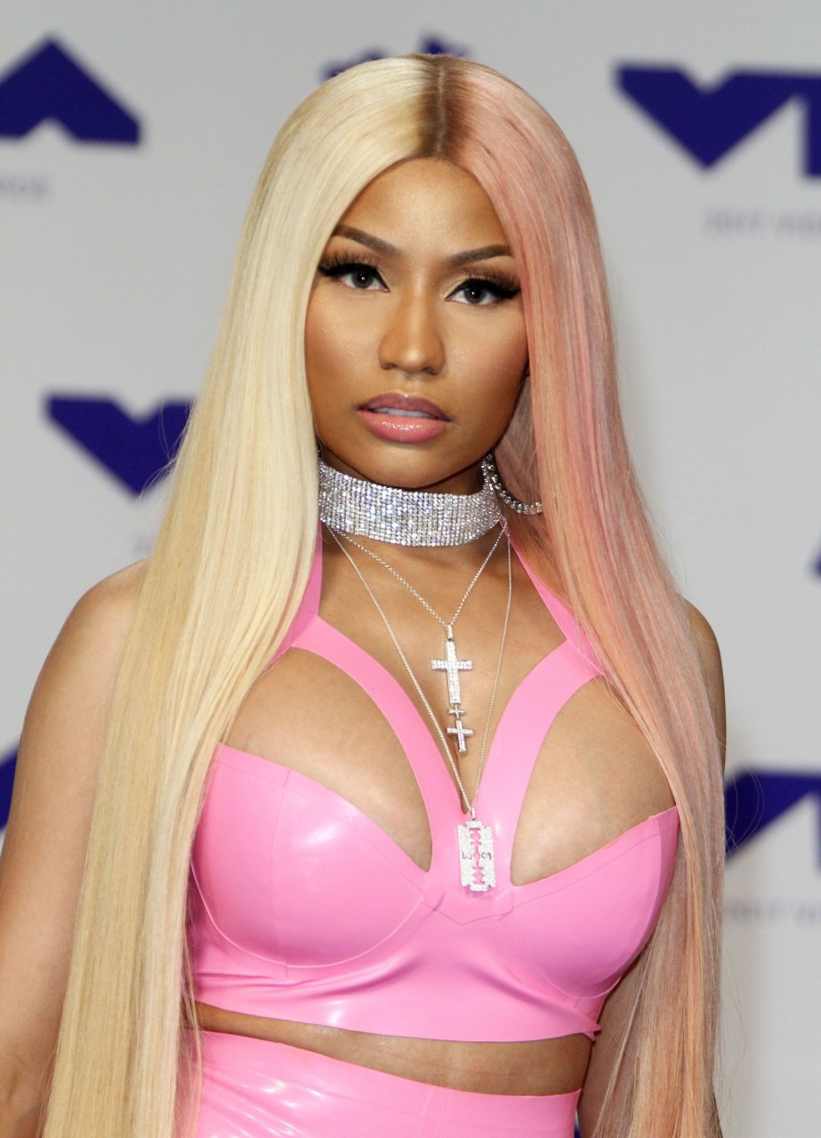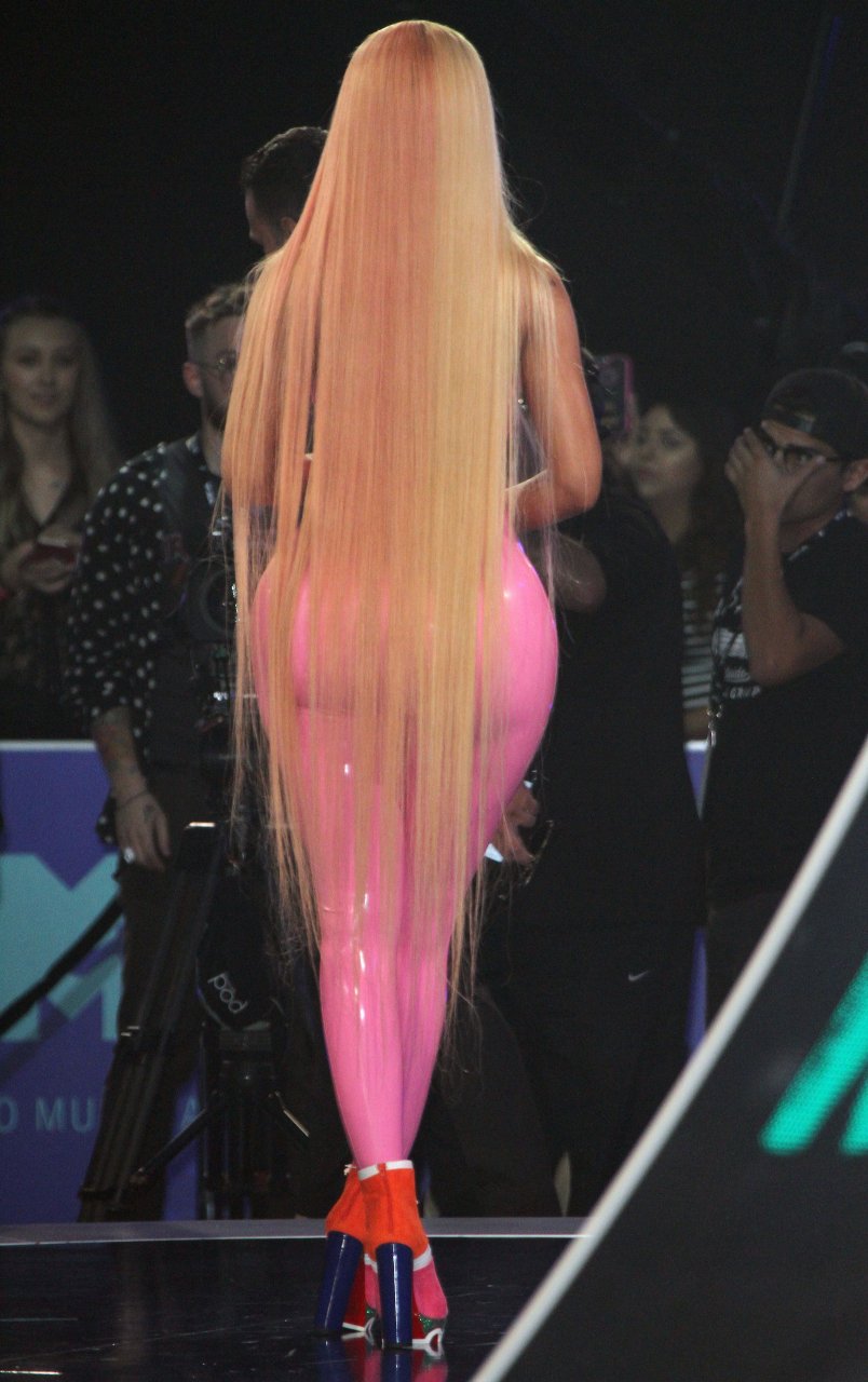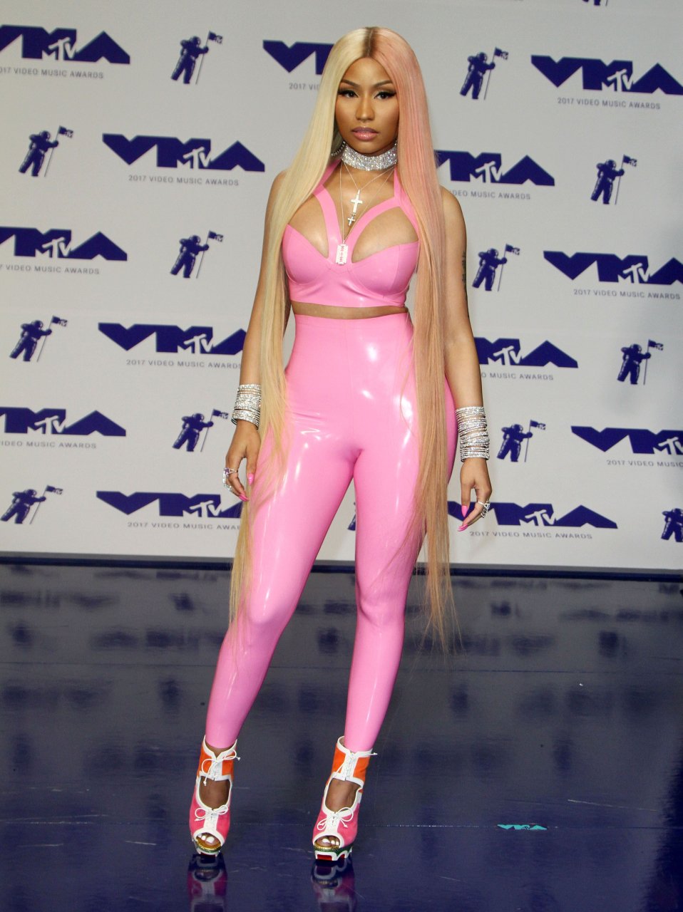 Ники Минаж чуть не вырвалась из розового латексного комбинезона на церемонии MTV Video Music Awards 2017 в Инглвуде, 27.08.2017. Оника Марадж — певица, автор песен и актриса, родившаяся на Тринидаде. Возраст — 34 года.
