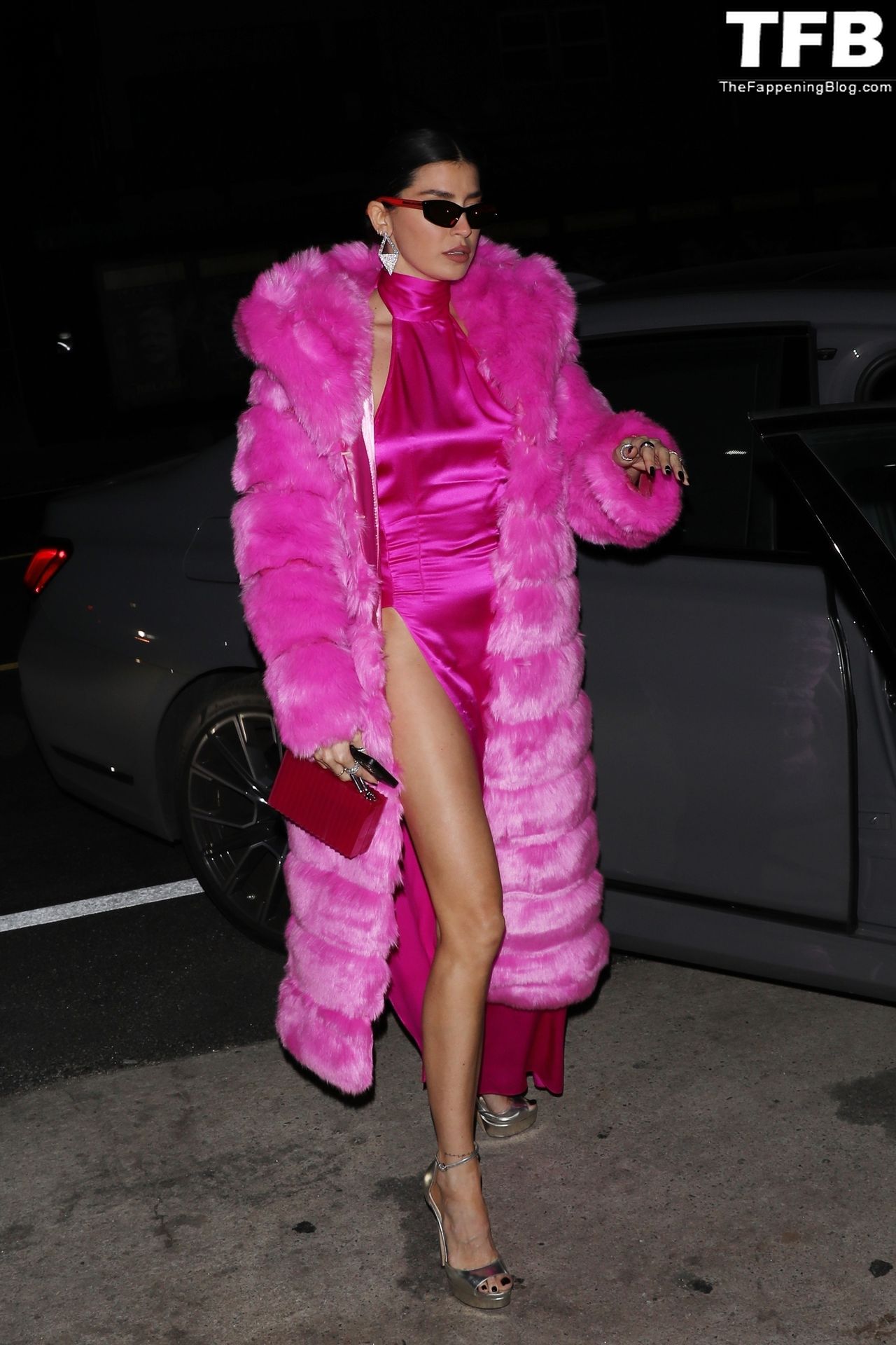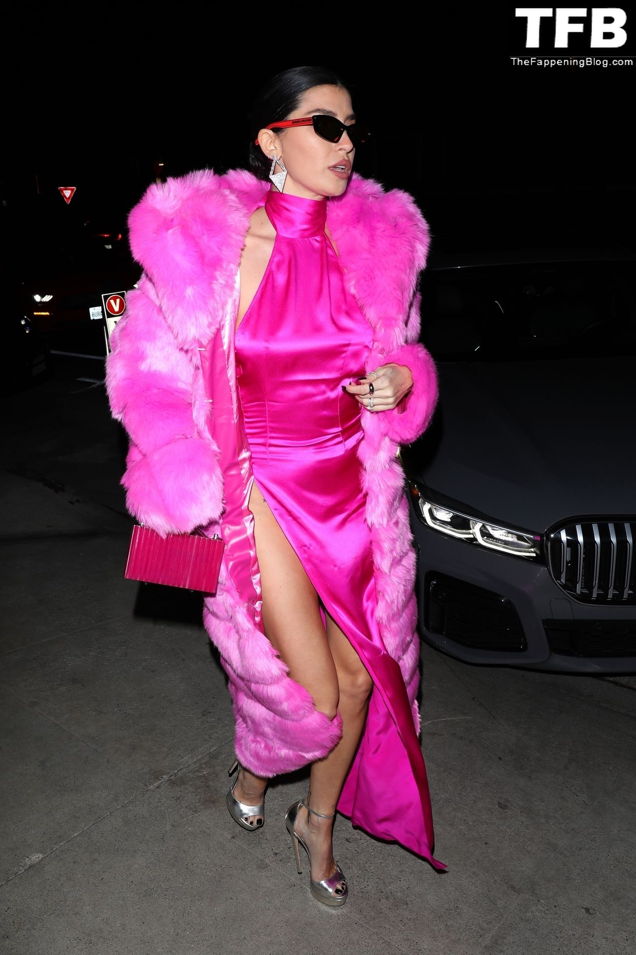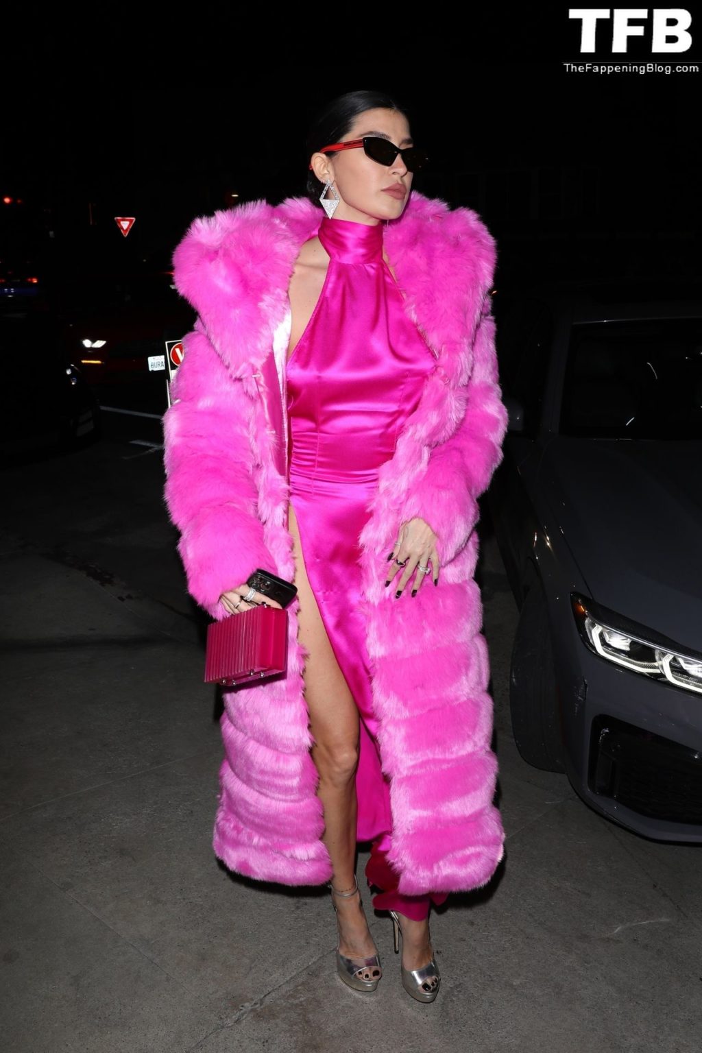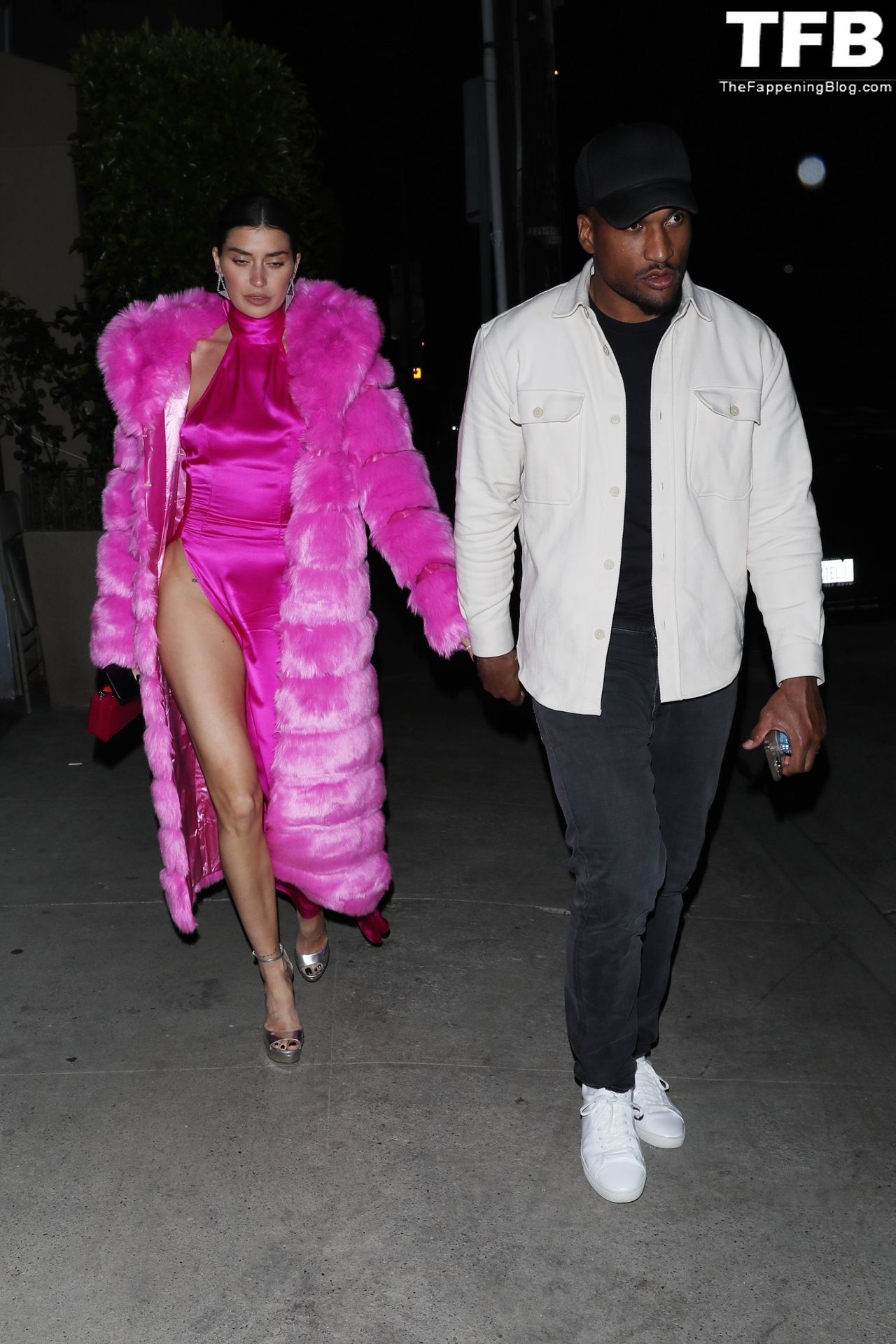 Николь Уильямс Инглиш носит розовое платье с подходящим длинным розовым меховым пальто, направляясь в ресторан Giorgio Baldi на ужин в Санта-Монике, 16.03.2022.