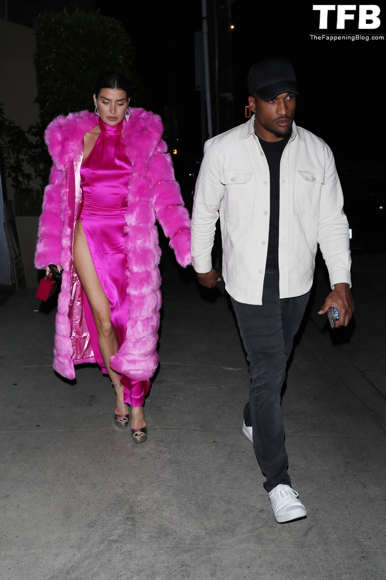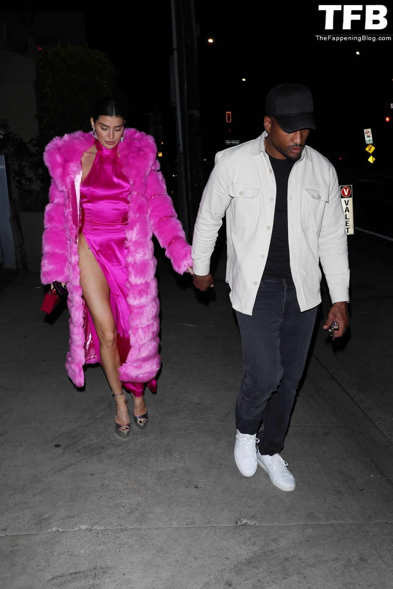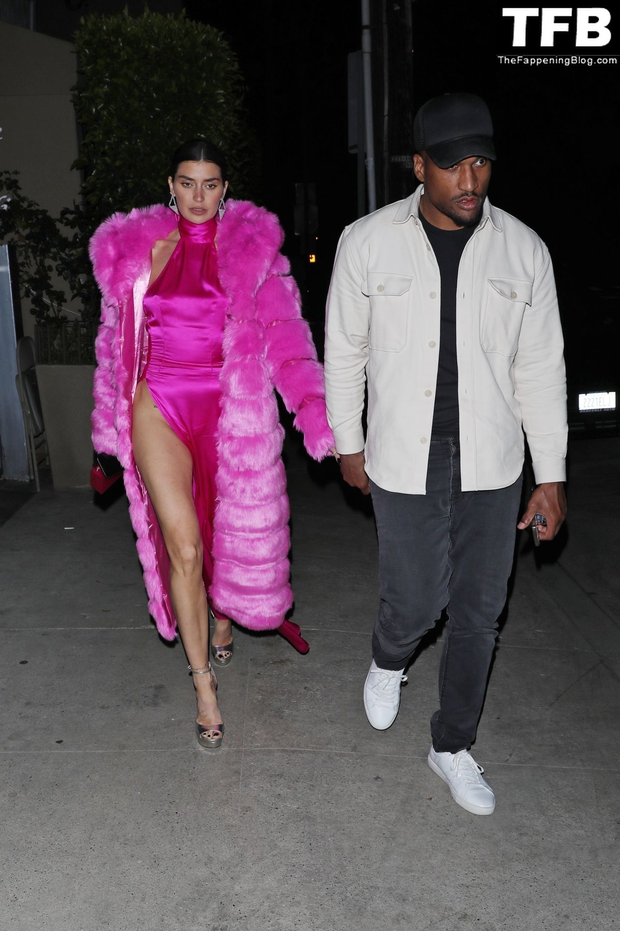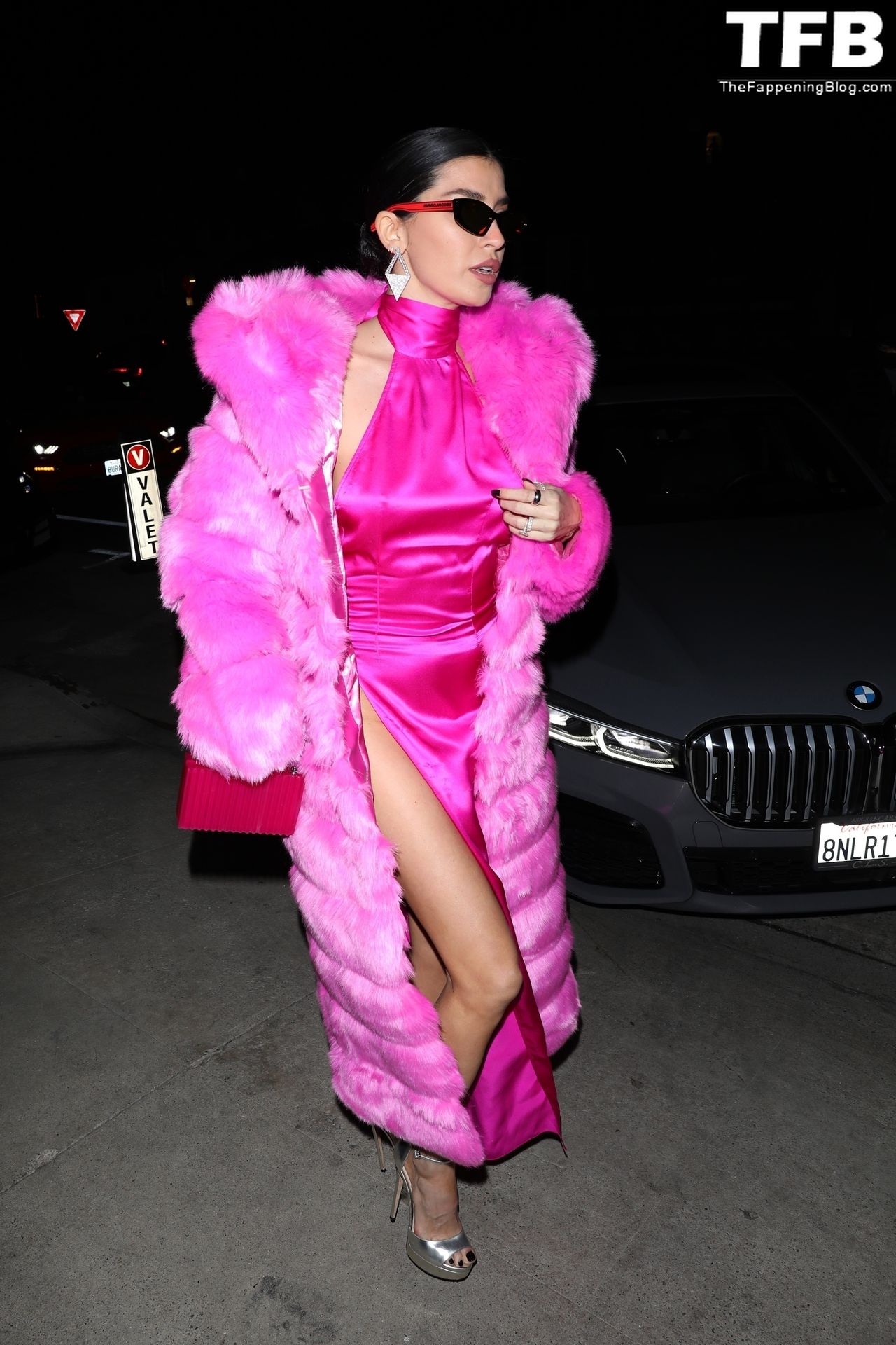 Николь Уильямс Инглиш носит розовое платье с подходящим длинным розовым меховым пальто, направляясь в ресторан Giorgio Baldi на ужин в Санта-Монике, 16.03.2022.