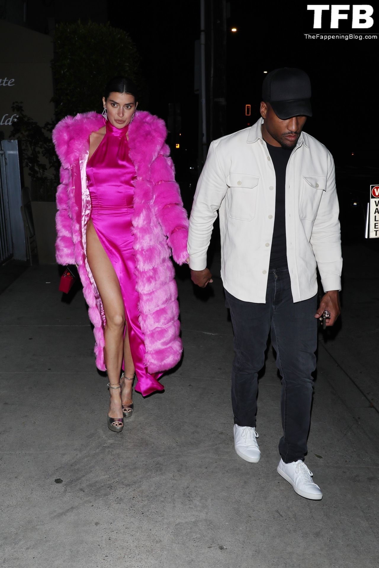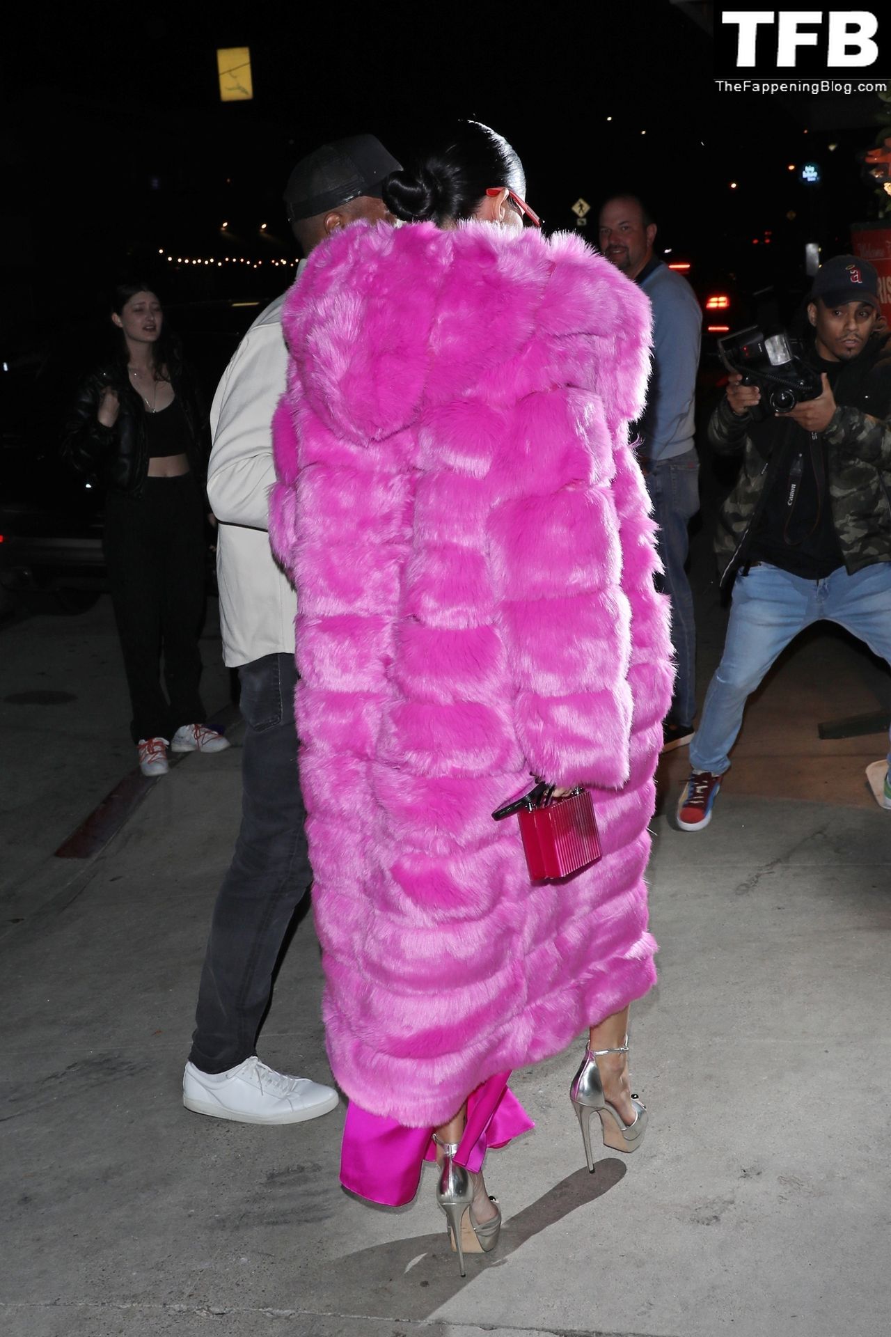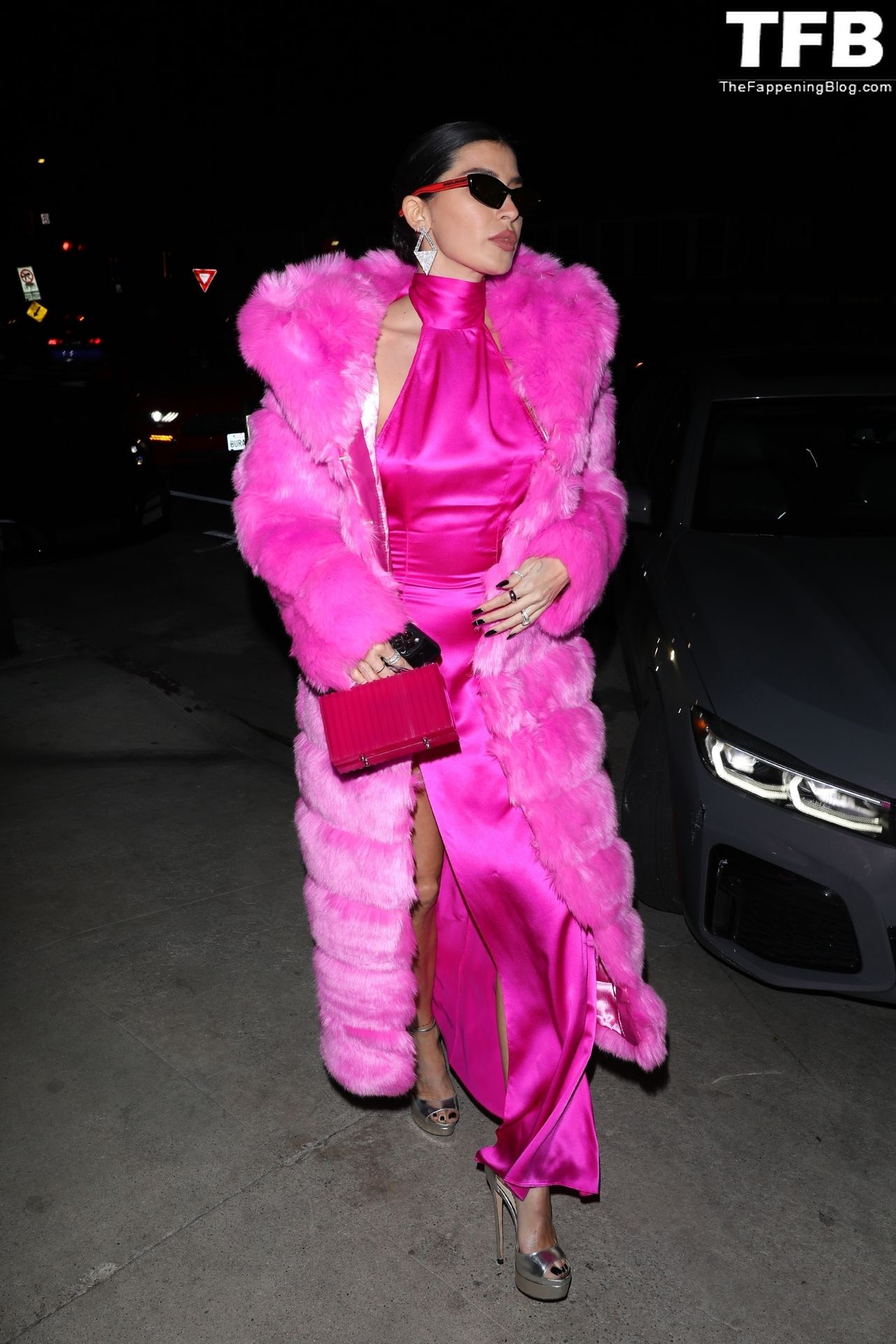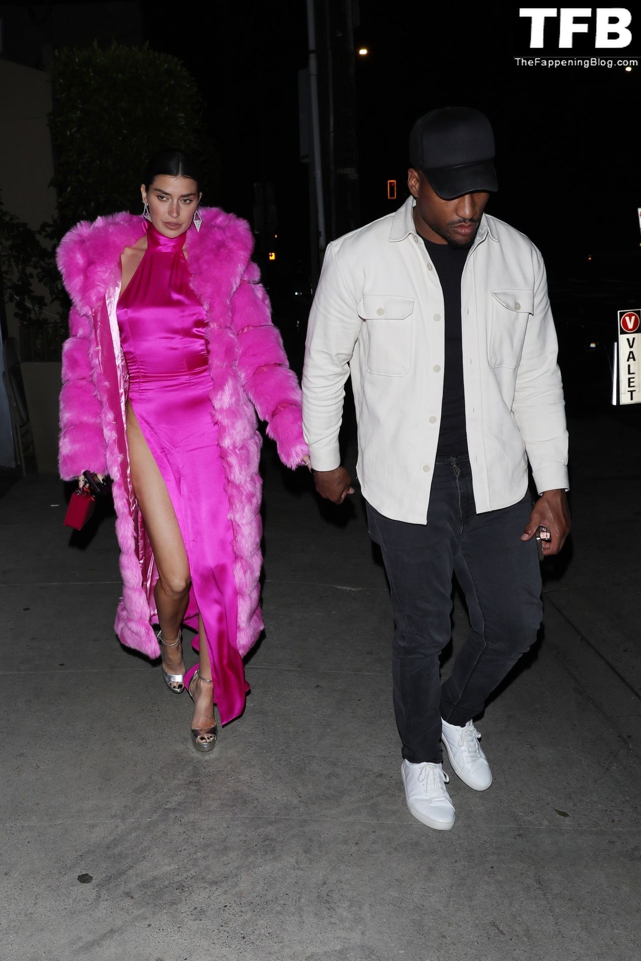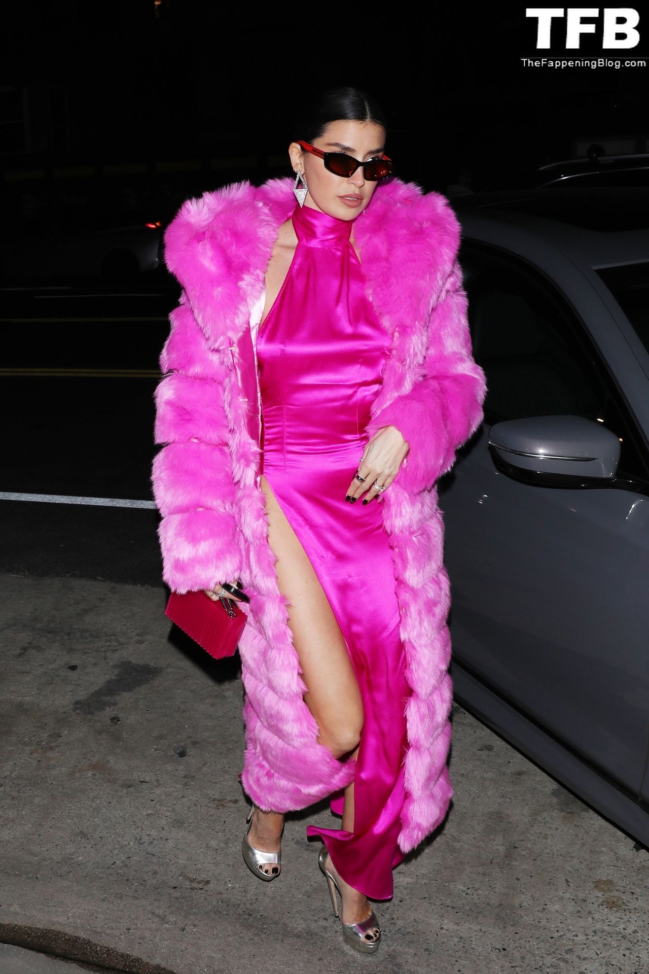 Николь Уильямс Инглиш носит розовое платье с подходящим длинным розовым меховым пальто, направляясь в ресторан Giorgio Baldi на ужин в Санта-Монике, 16.03.2022.