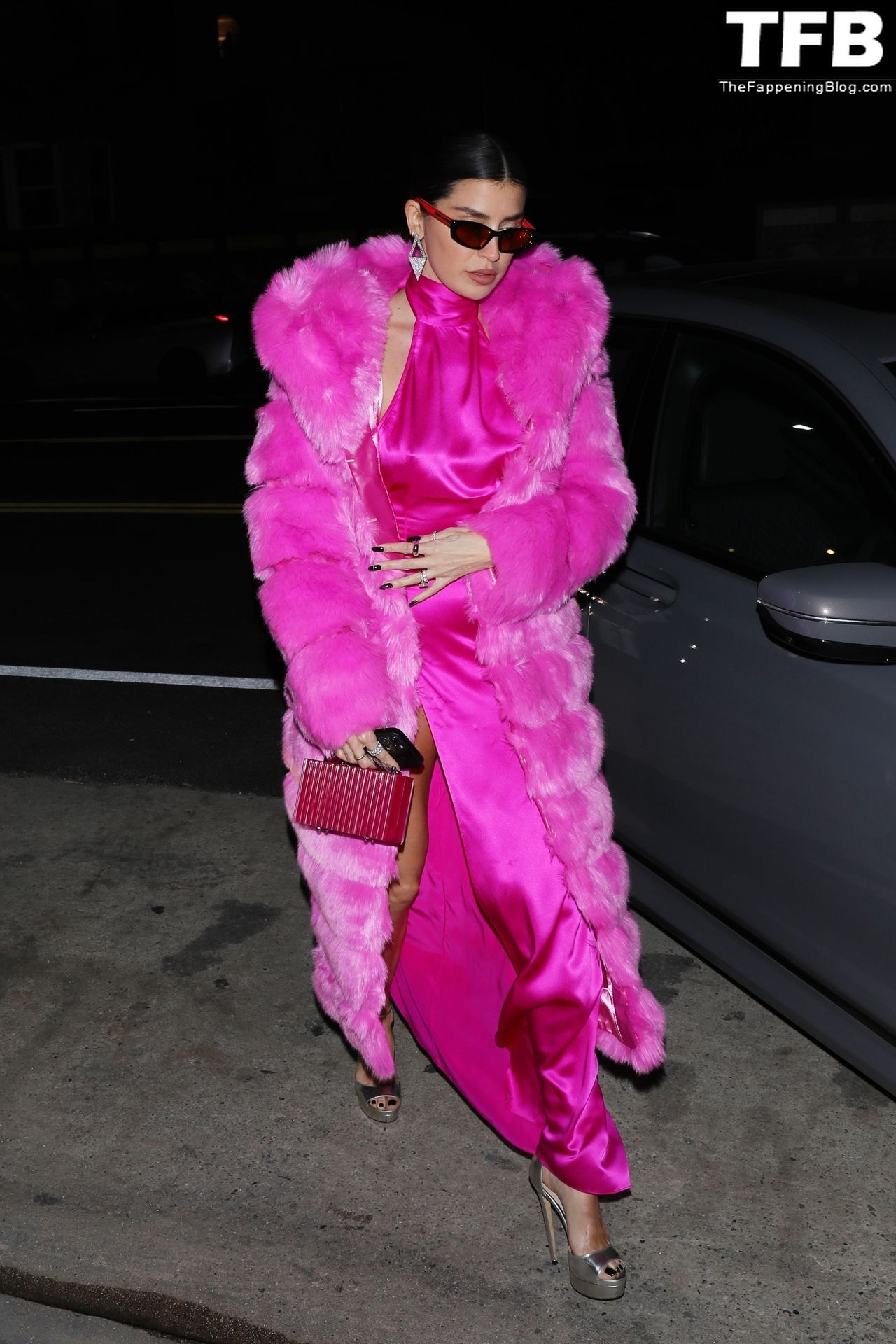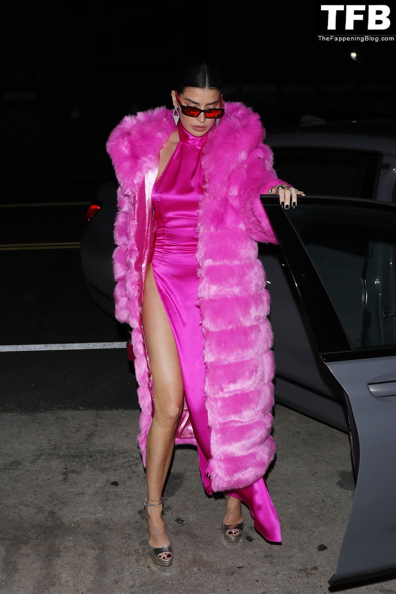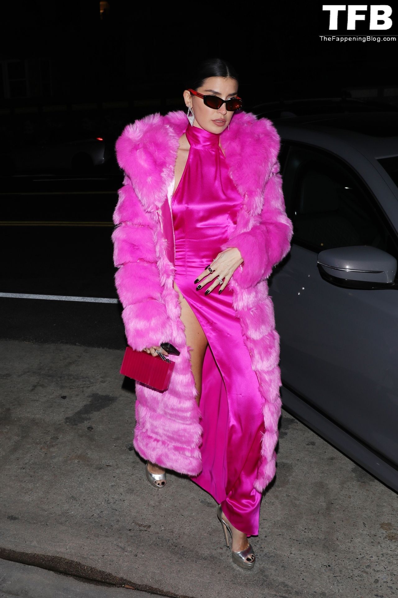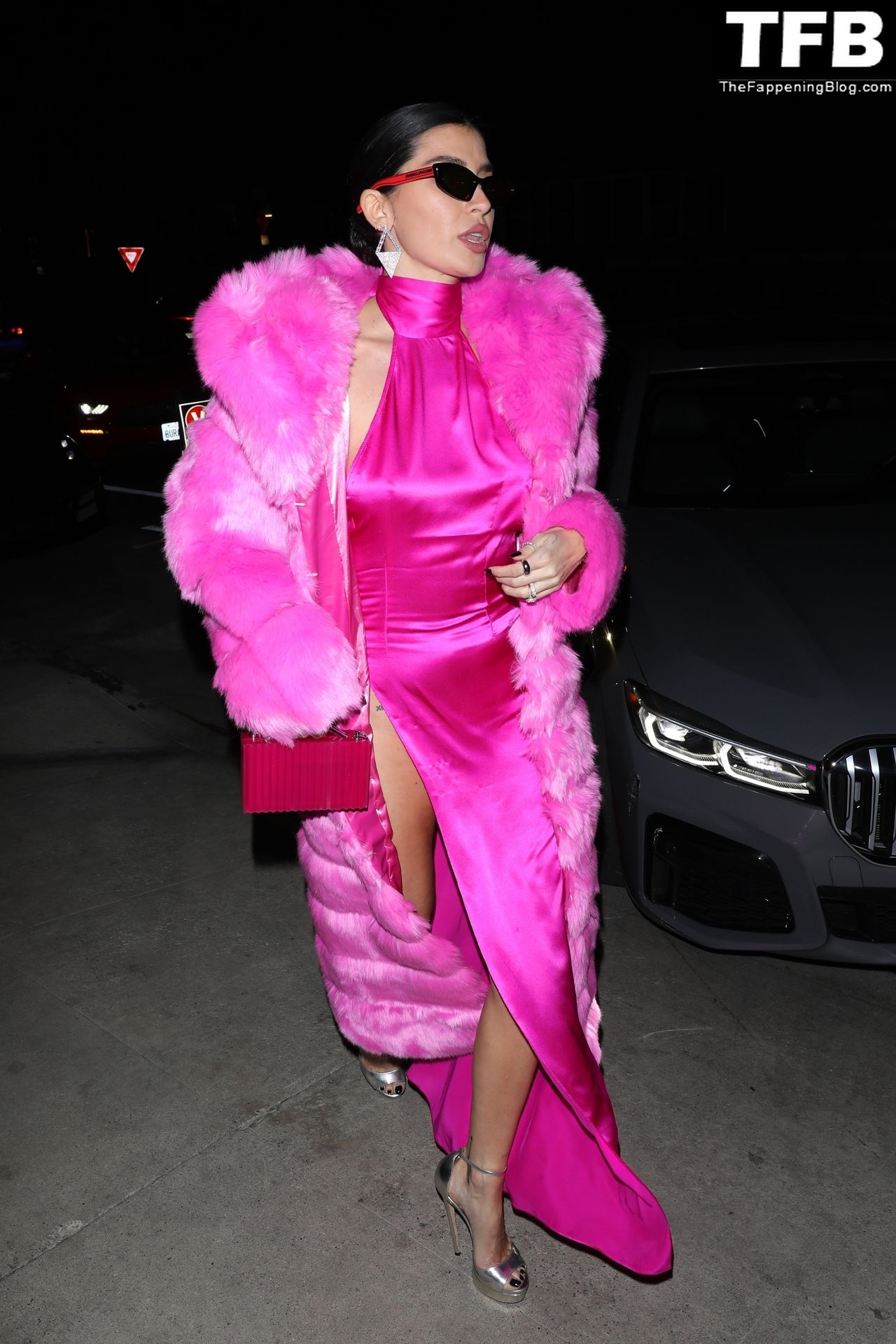 Николь Уильямс Инглиш носит розовое платье с подходящим длинным розовым меховым пальто, направляясь в ресторан Giorgio Baldi на ужин в Санта-Монике, 16.03.2022.