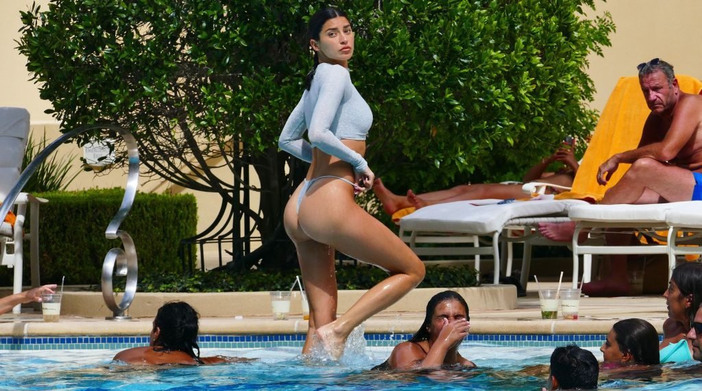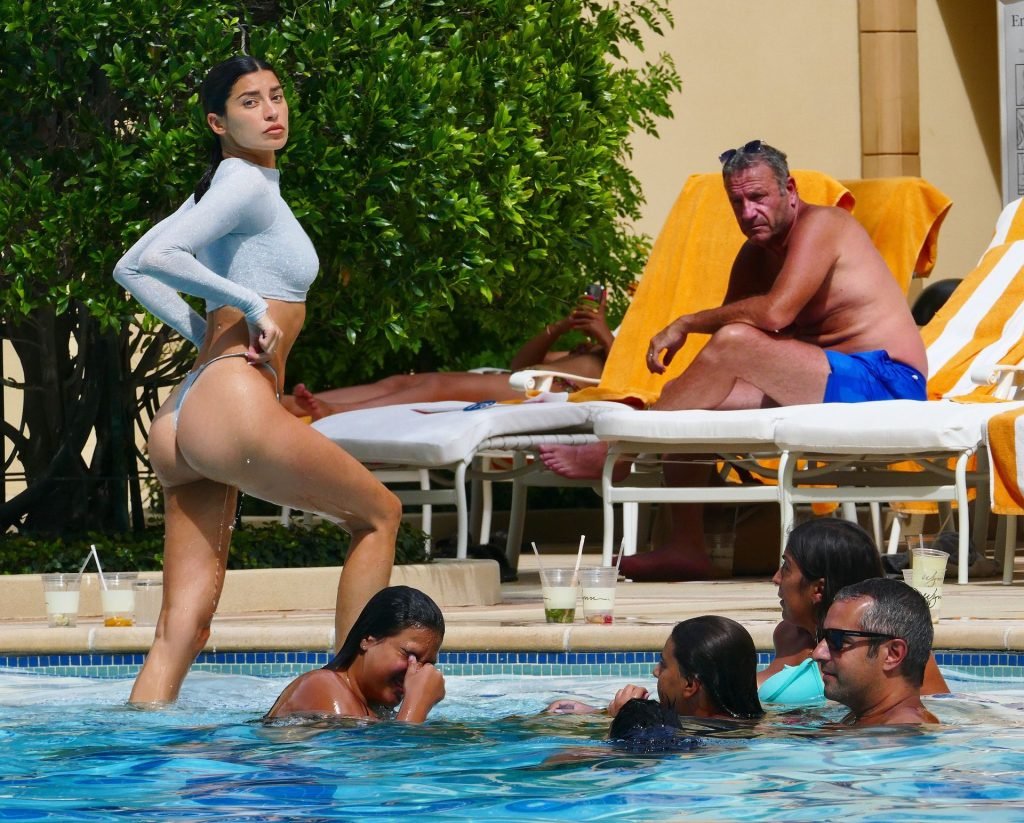 Nicole Williams демонстрирует свои изгибы и переживает момент из фильма 80-х “Быстрые перемены в Риджмонт Хай”, когда она заходит в бассейн, а затем выходит из него, к восторгу гостей бассейна в ее роскошном отеле в Лас-Вегасе, 19.08.2019.