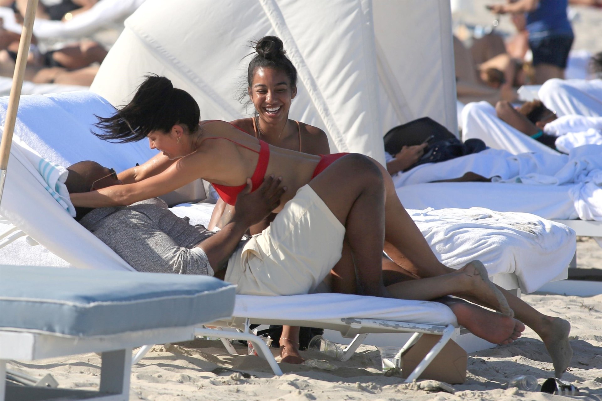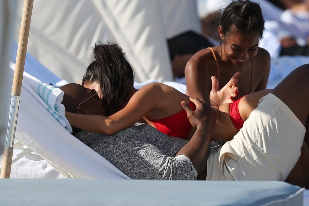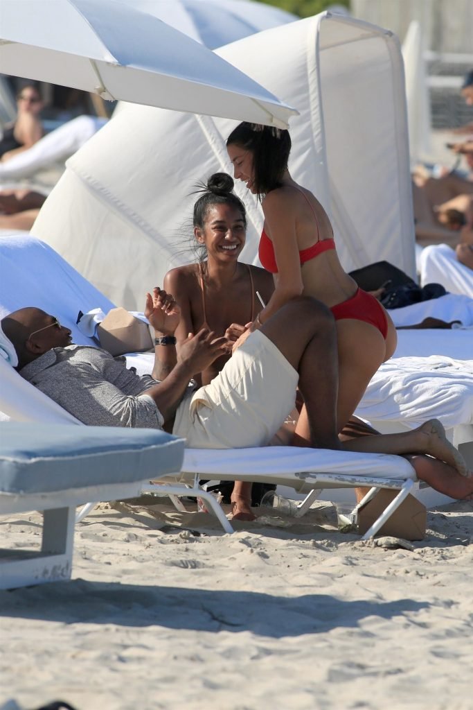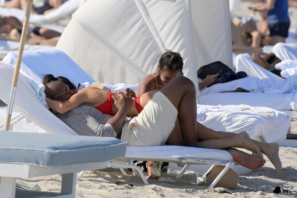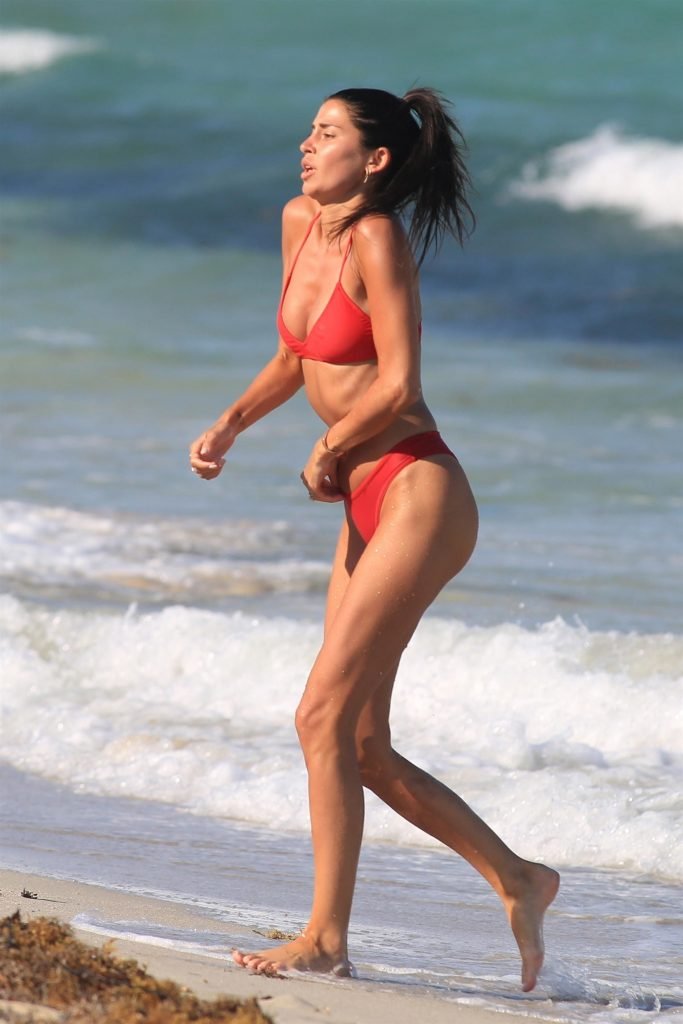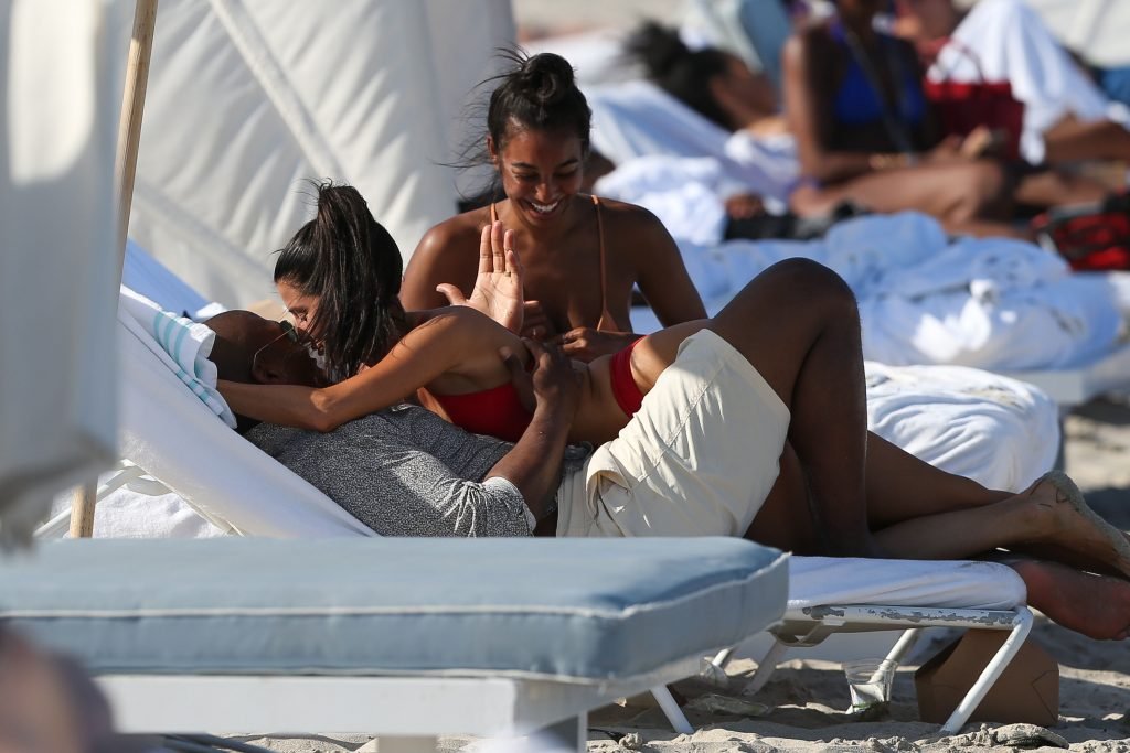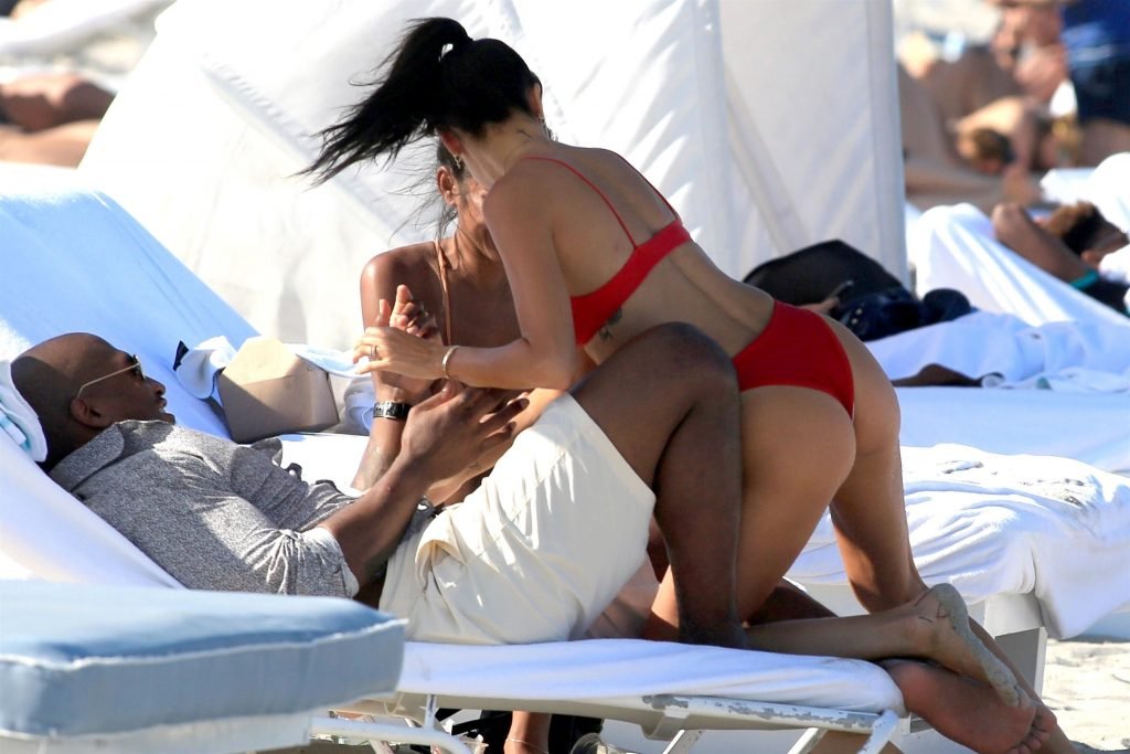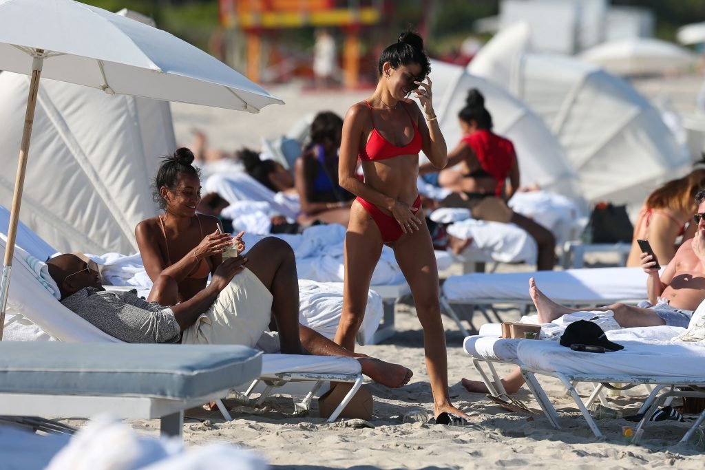 WAGS звезда Николь Уильямс (32) демонстрирует свое великолепное загорелое тело в красном бикини на пляже в Майами-Бич, 30.04.2018. Супер горячая жена Ларри Инглиша была замечена, как она зажигала на пляже с друзьями.
