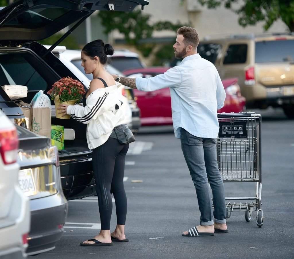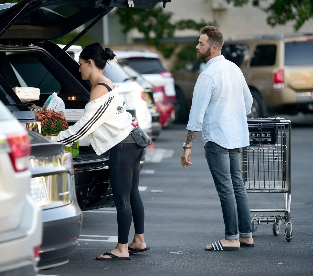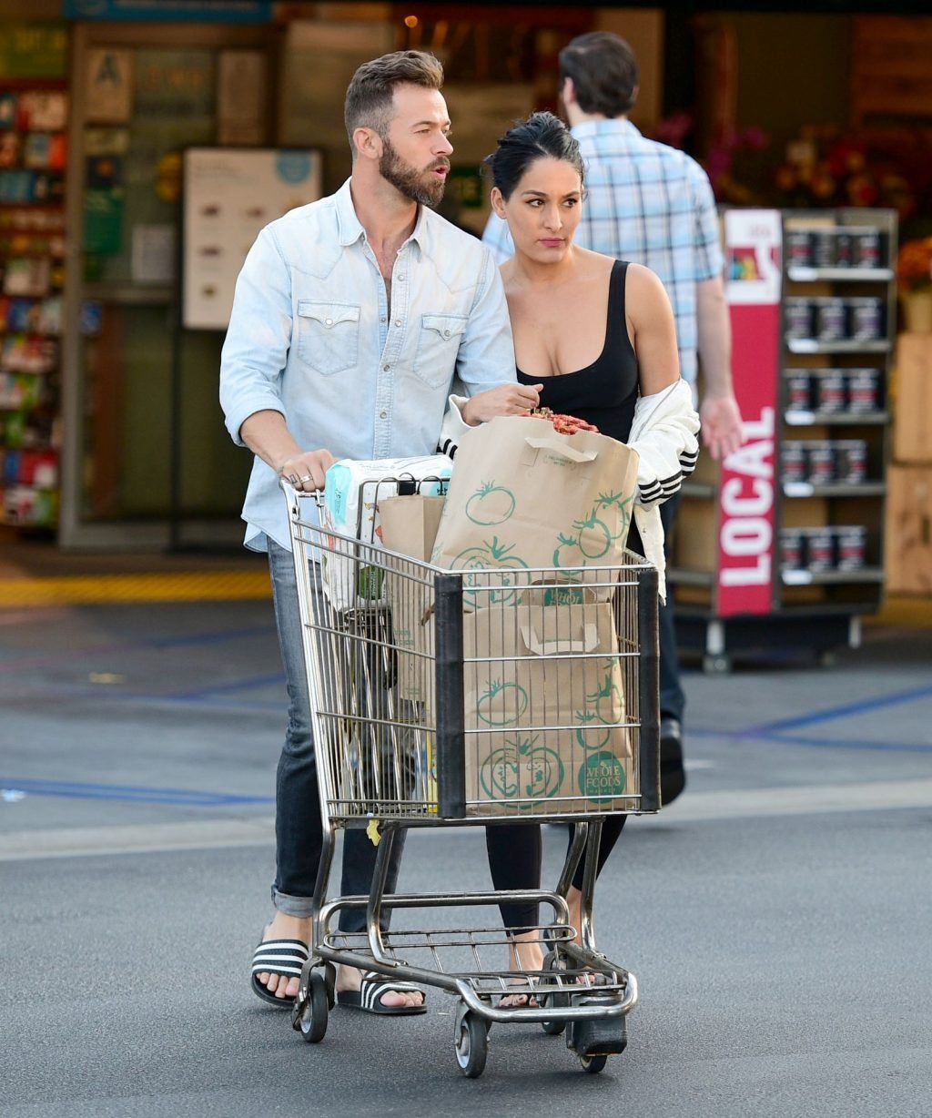 Nikki Bella и Артем Чигвинцев выглядят счастливой парой, делая совместные покупки в магазине Whole Foods в Лос-Анджелесе, 07.10.2019. 35-летняя американская профессиональная рестлерша была одета в укороченный черный топ, подходящие леггинсы, куртку Adidas и сандалии.