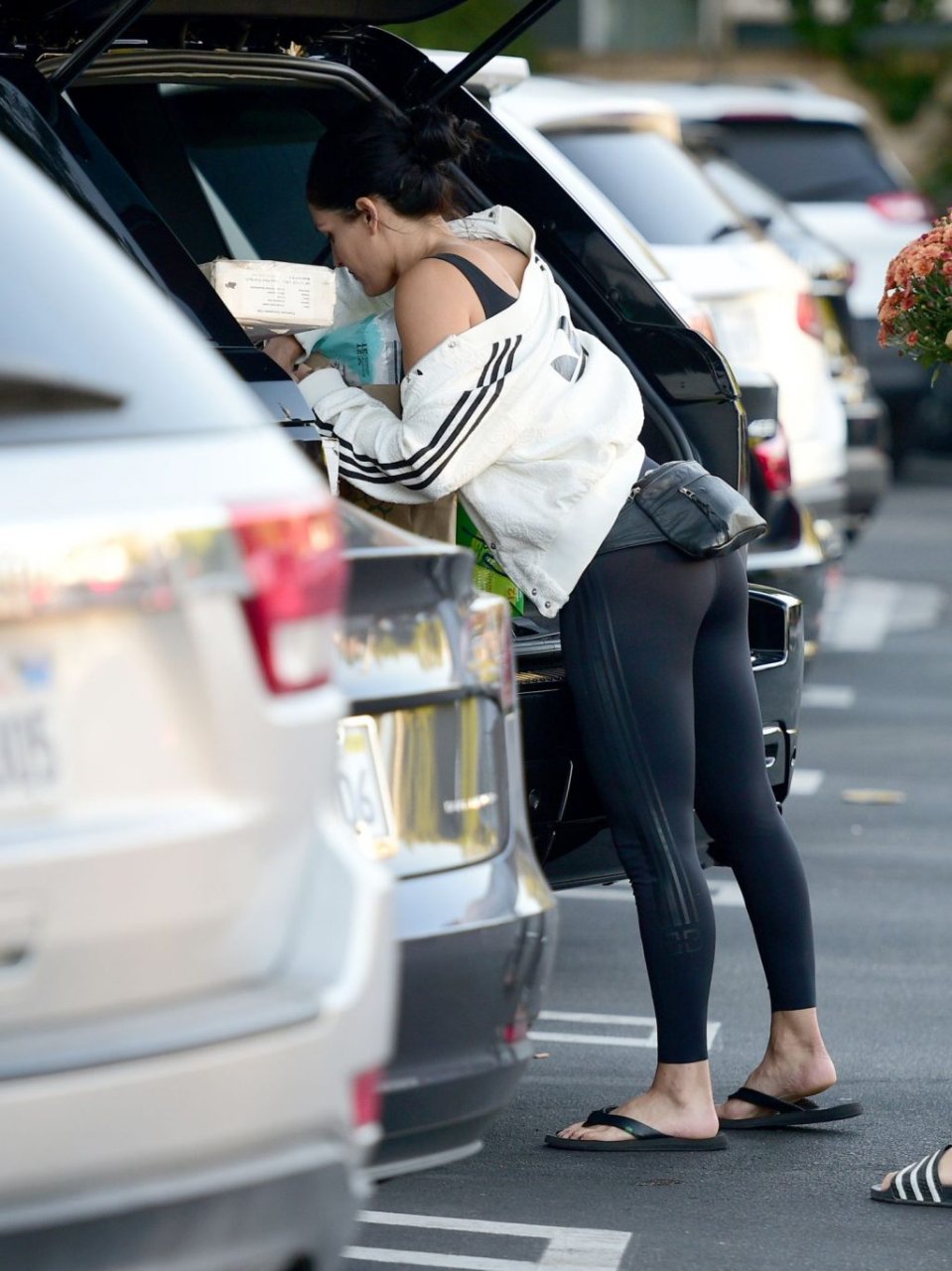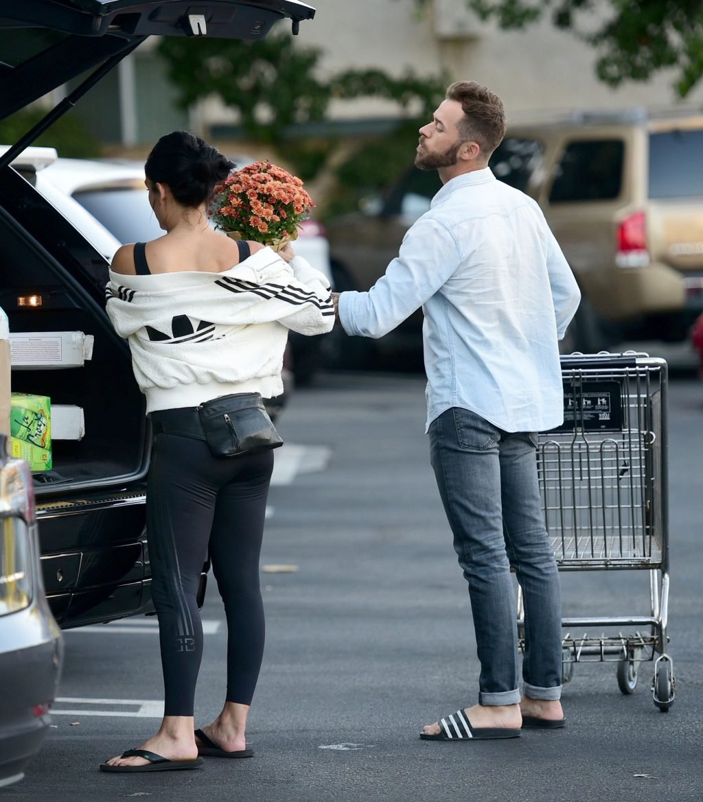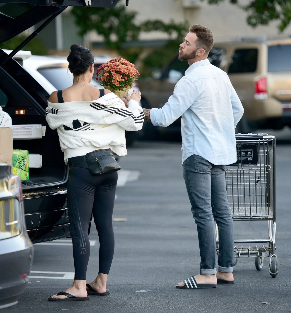 Nikki Bella и Артем Чигвинцев выглядят счастливой парой, делая совместные покупки в магазине Whole Foods в Лос-Анджелесе, 07.10.2019. 35-летняя американская профессиональная рестлерша была одета в укороченный черный топ, подходящие леггинсы, куртку Adidas и сандалии.