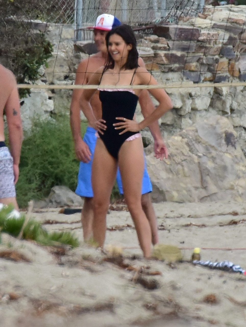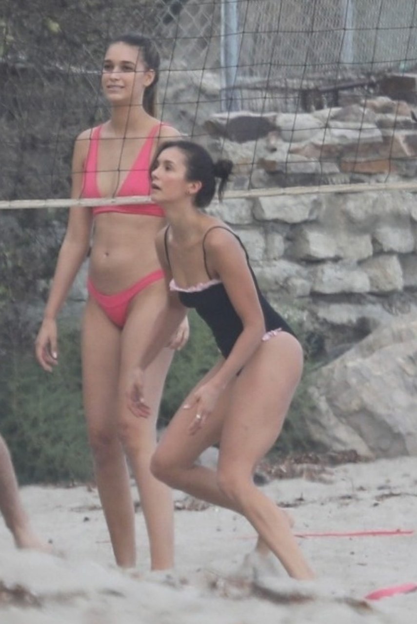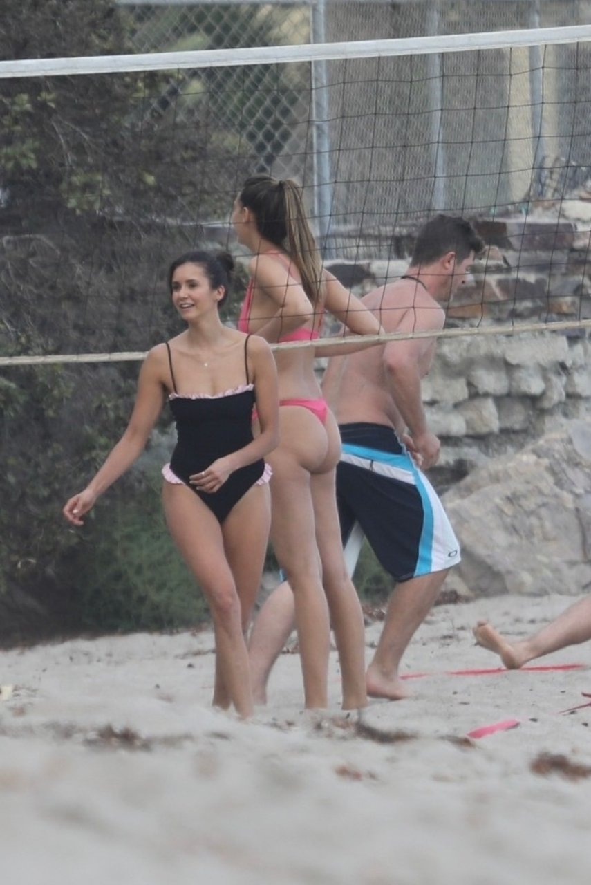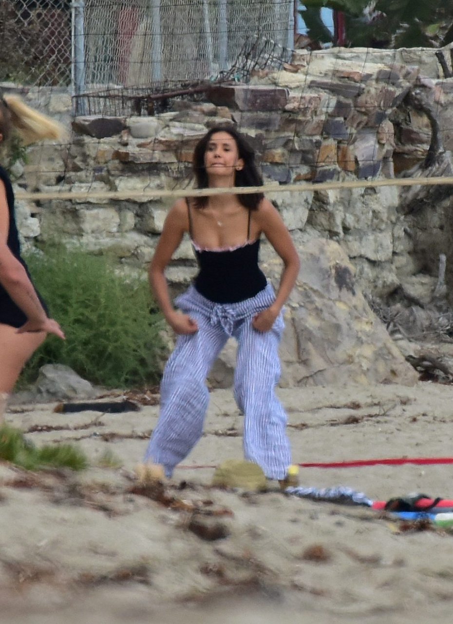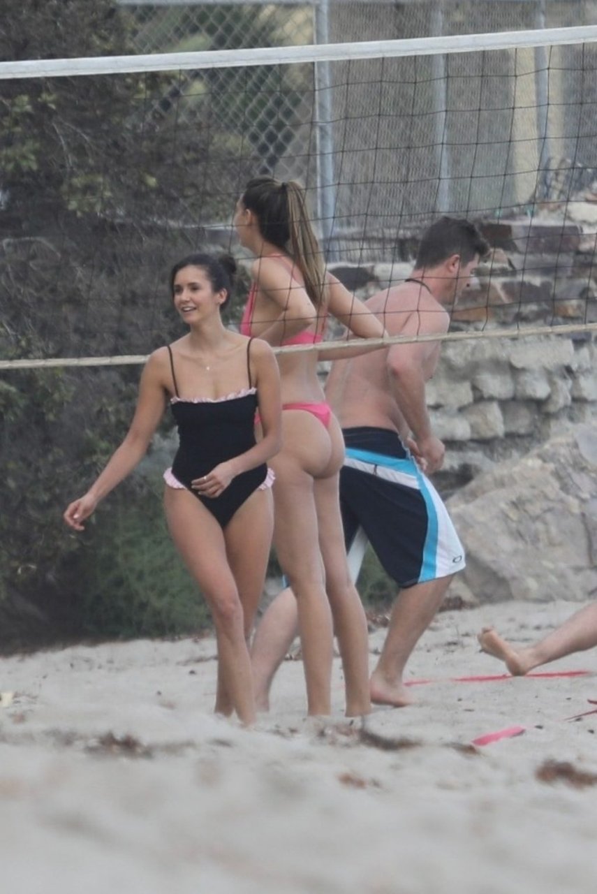 Актриса Нина Добрев была замечена в черном купальнике, играя в волейбол с друзьями на пляже в Малибу, 02.09.2018.