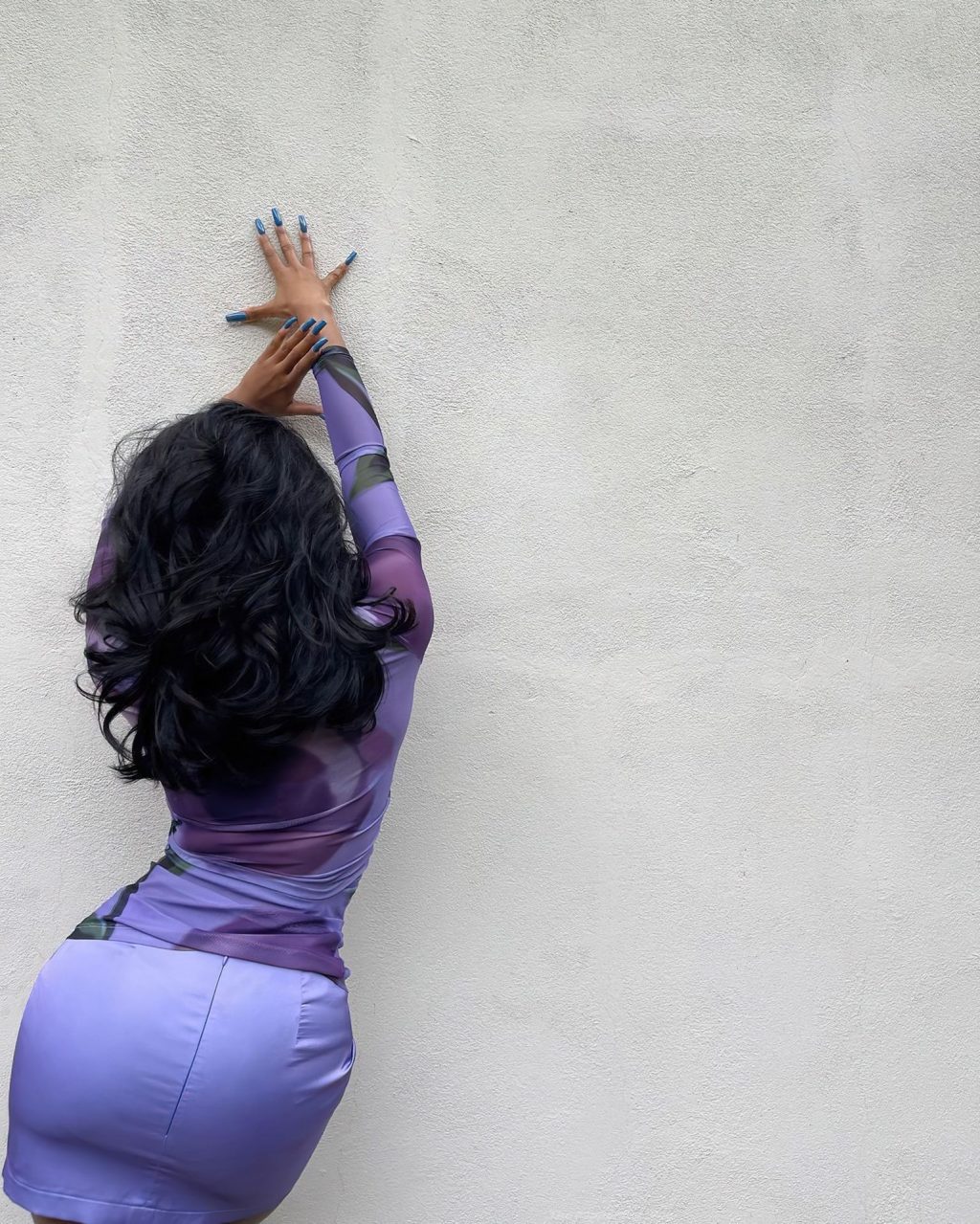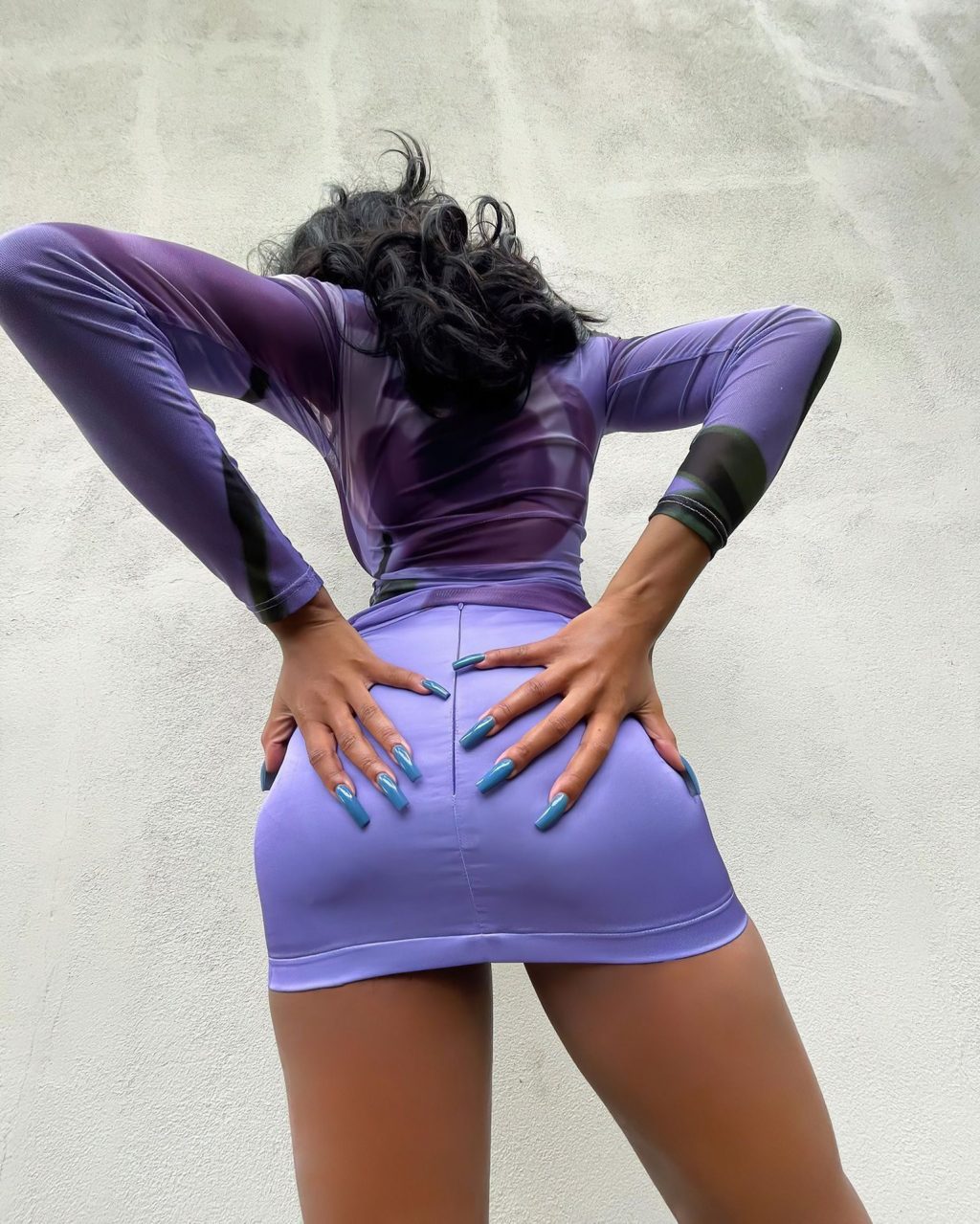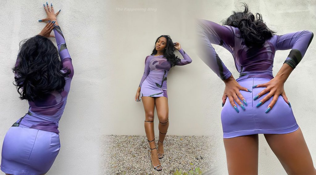 Normani Kordei показывает свою красивую фигуру и ноги, позируя в фиолетовой мини-юбке и прозрачной блузке для своих подписчиков в Instagram, 02/11/2021.