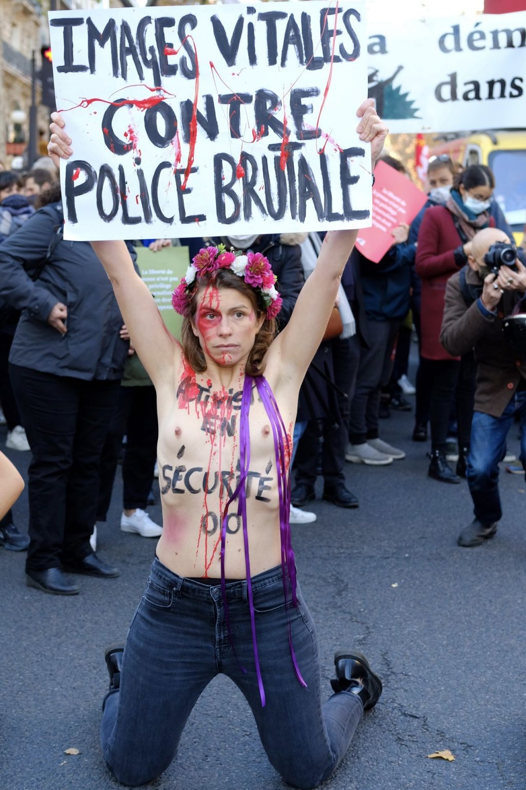Голые девушки запечатлены в Париже 28 ноября 2020 года во время протеста против законопроекта «глобальная безопасность», статья 24 которого криминализирует публикацию изображений полицейских при исполнении служебных обязанностей с целью нанесения вреда их «физической или психологической целостности».