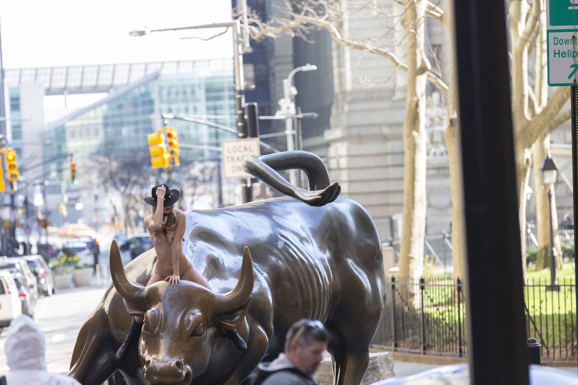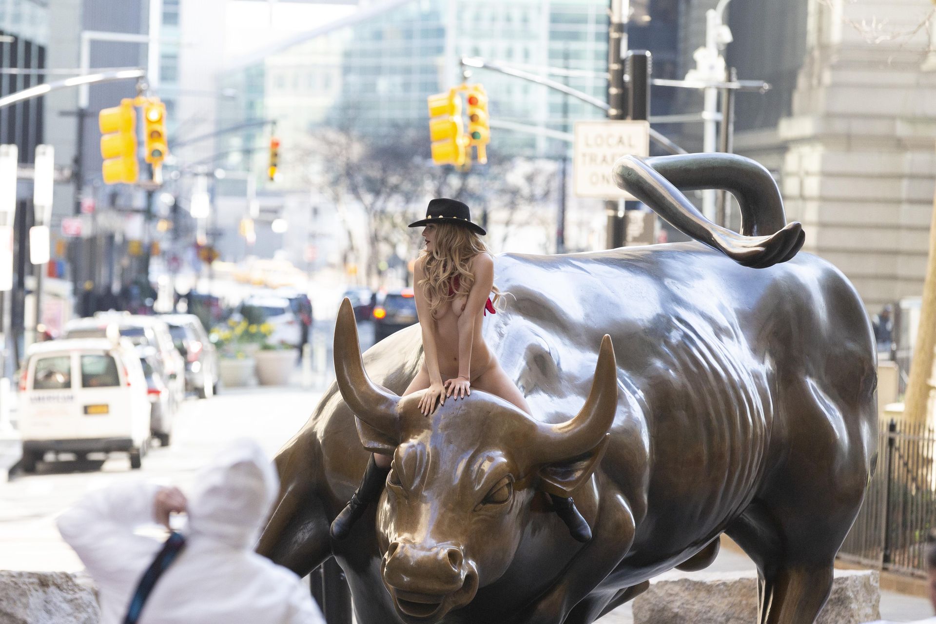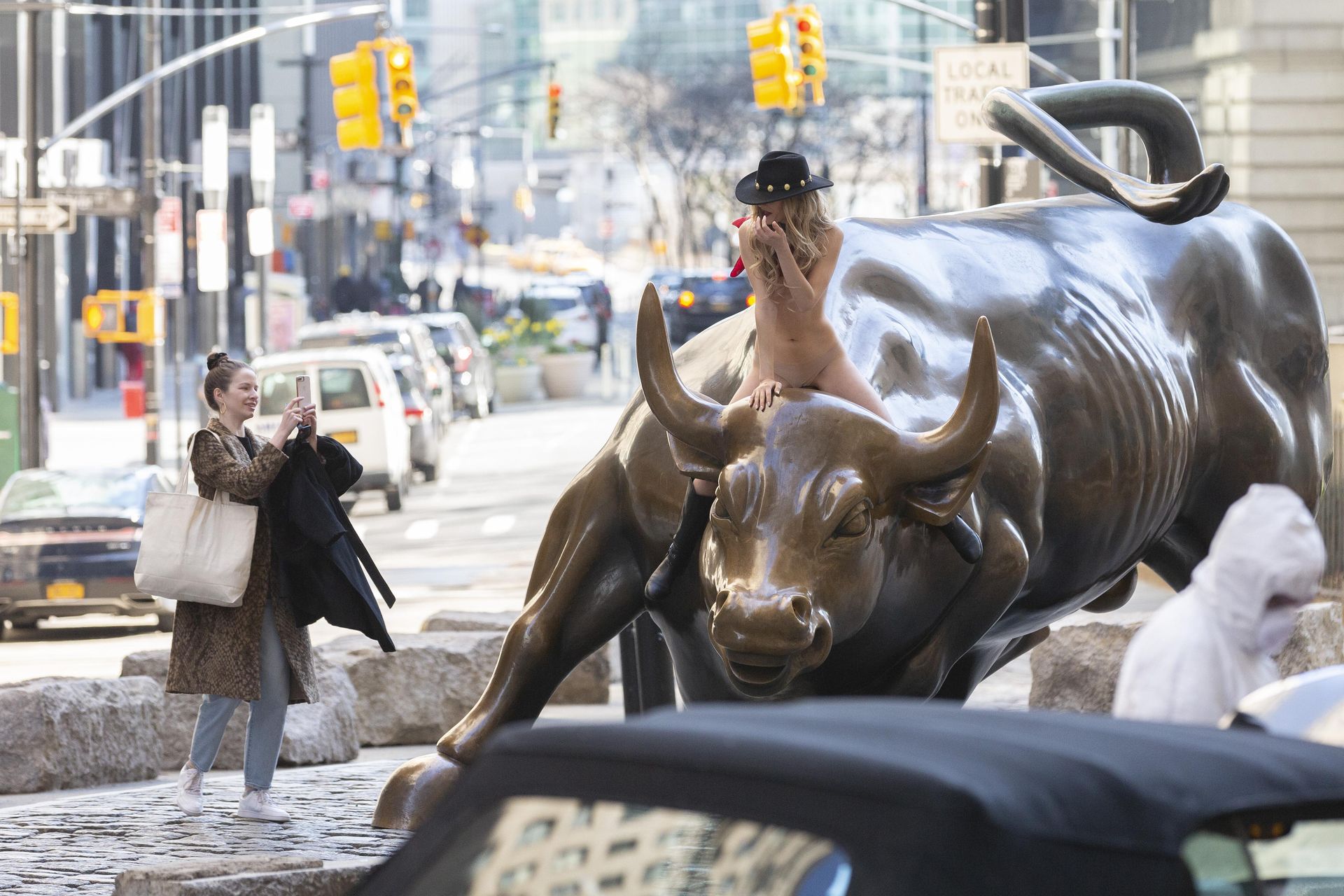 Обнажённая женщина игнорирует предупреждения о коронавирусе и сидит верхом на статуе Быка (14 фото)