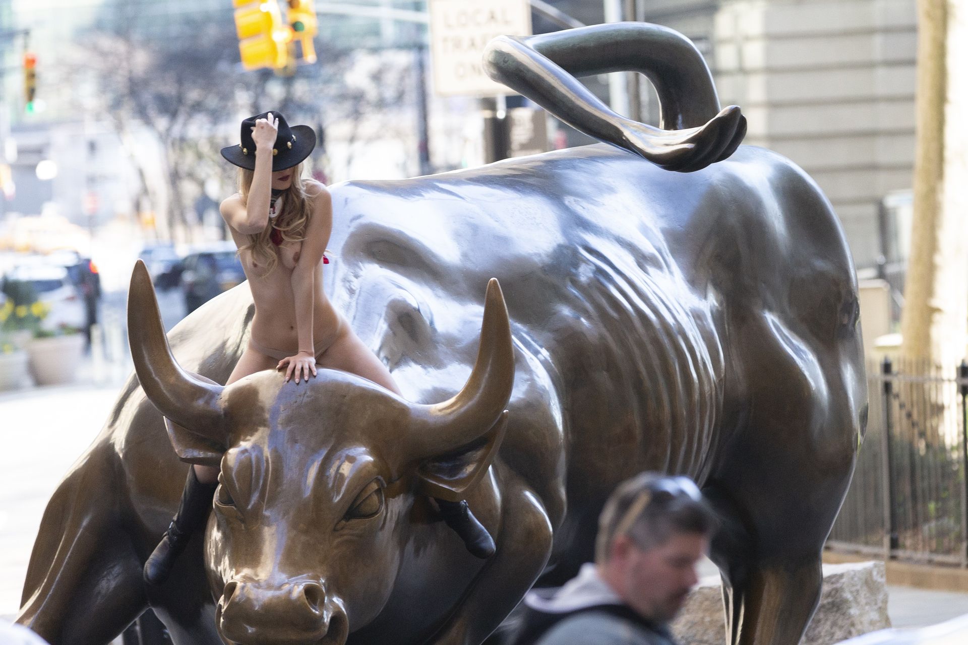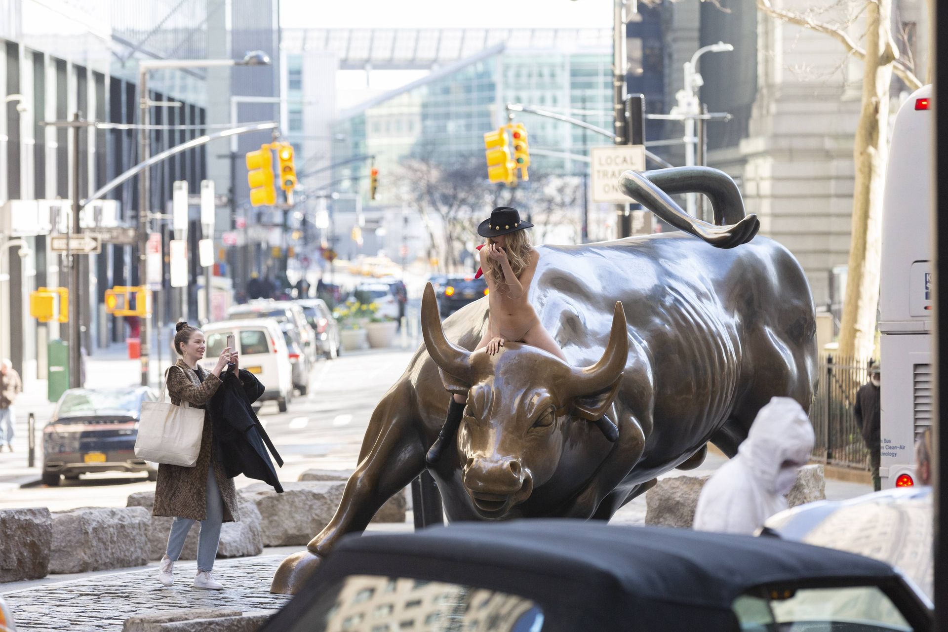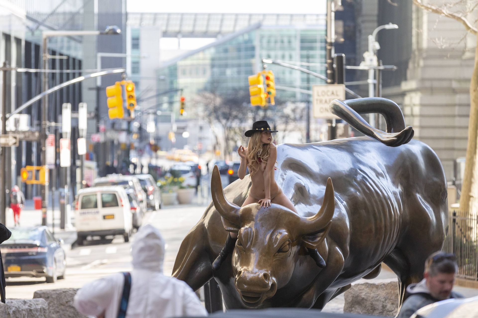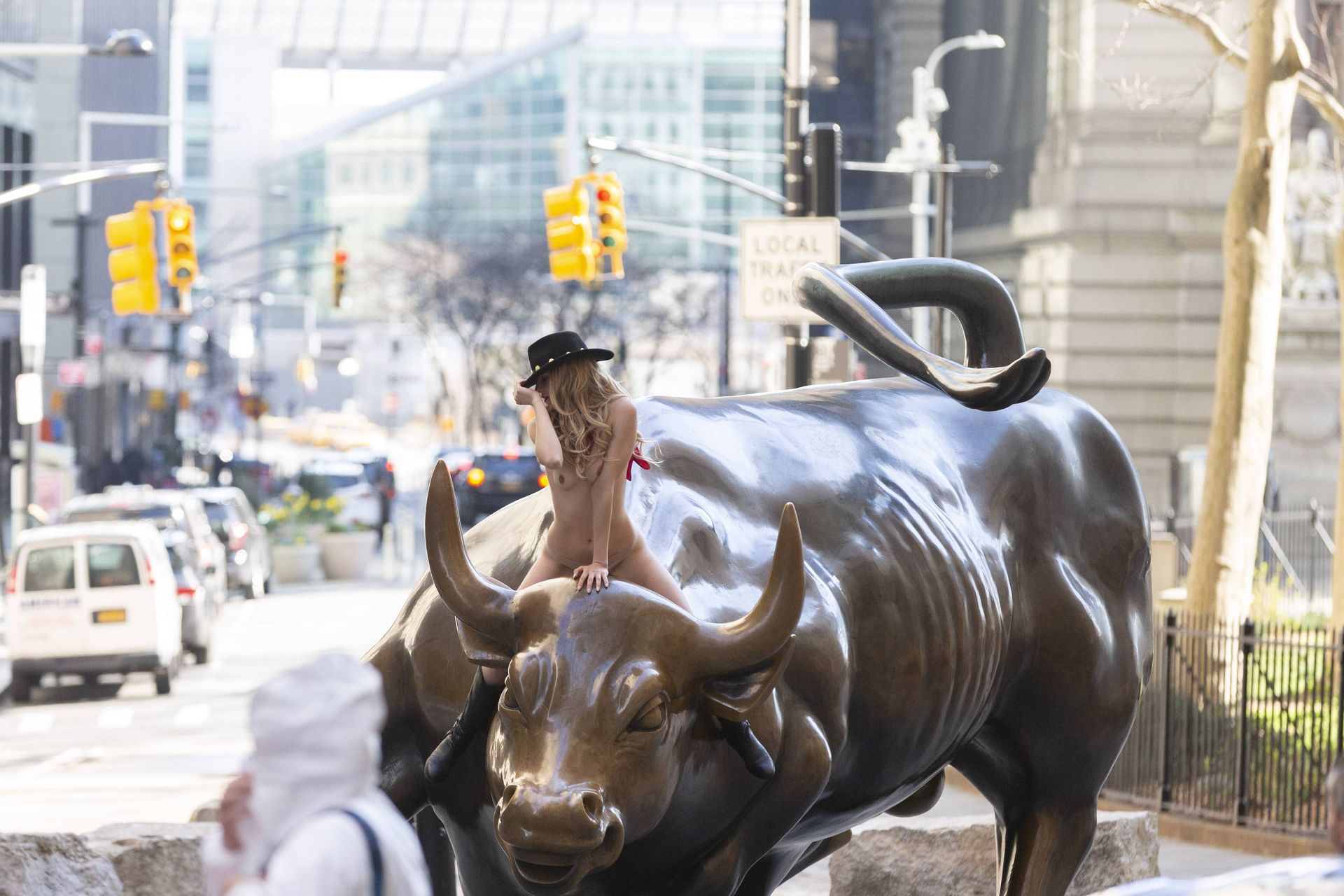 Обнажённая женщина игнорирует предупреждения о коронавирусе и сидит верхом на статуе Быка (14 фото)
