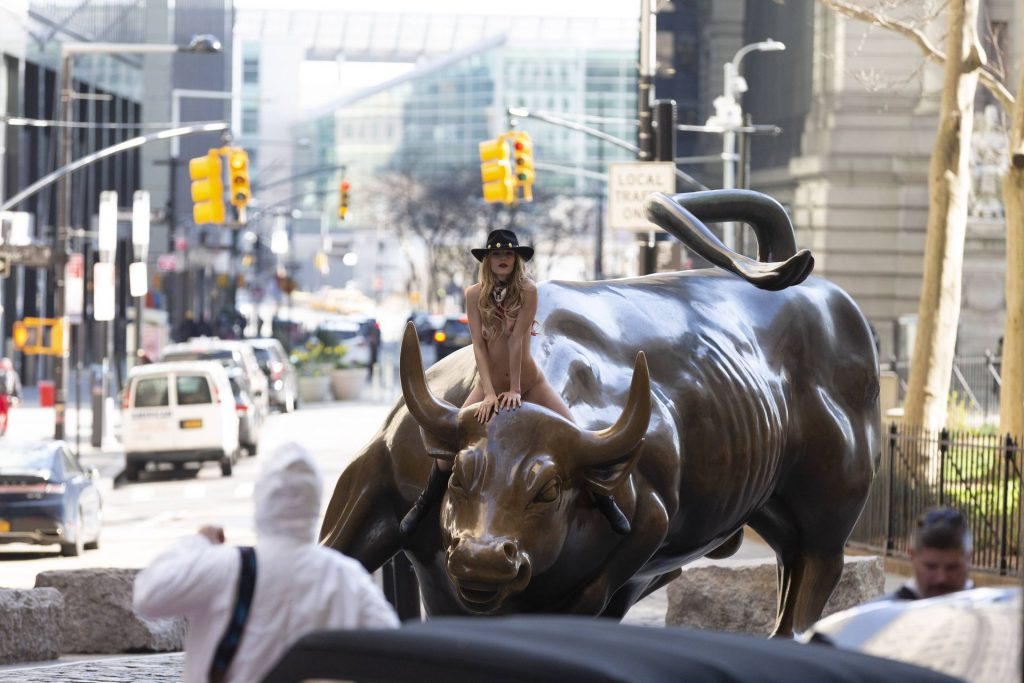 Эта блондинка осмелилась сесть верхом на статую “Быка, что мчится” обнажённой в четверг, нагло игнорируя все меры защиты от коронавируса, 26.03.2020.