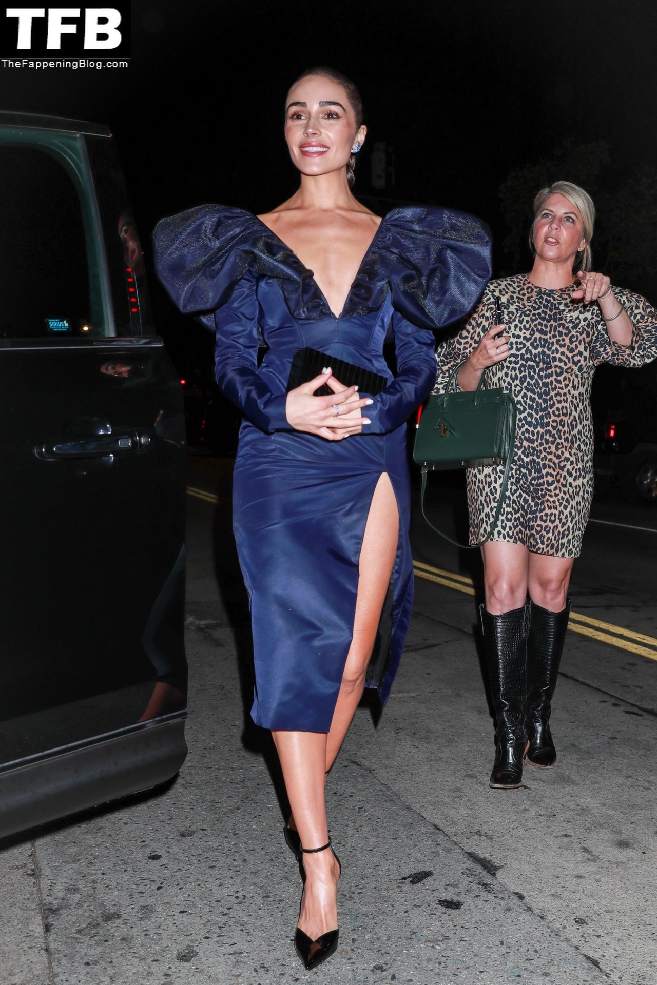 Модель Оливия Калпо немного слишком откровенно демонстрирует себя в платье с высоким разрезом, прибывая в ресторан Olivetta в Уэст-Голливуде, 24.03.2022.