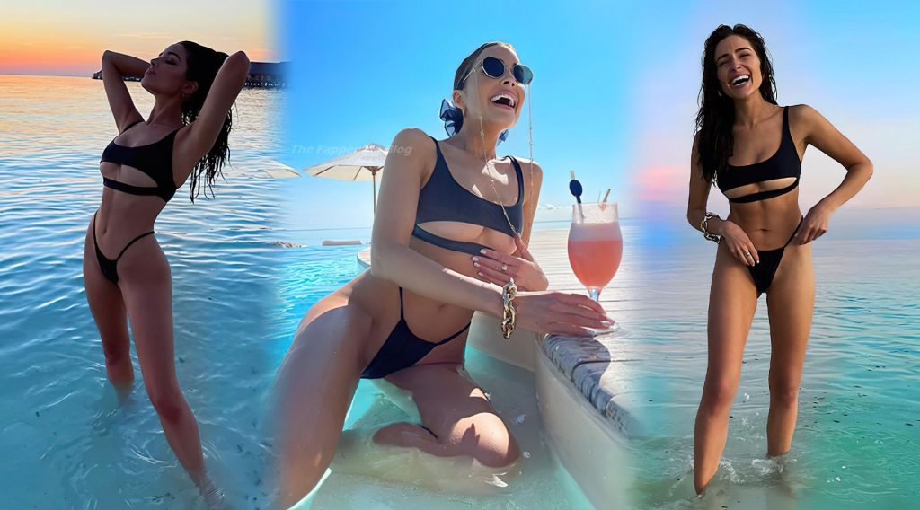 Оливия Калпо демонстрирует нижнюю часть груди и боковую часть груди, позируя в крошечном бикини и без бюстгальтера в сером платье во время идиллического отдыха на Мальдивах.