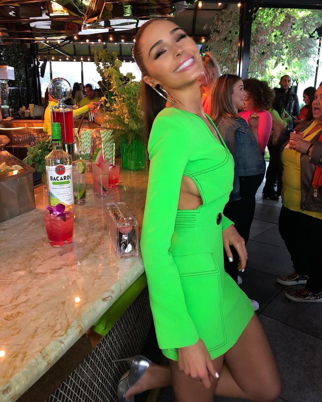 Длинноногая Оливия Калпо была замечена в салатовом платье David Koma, обуви Brian Atwood и серьгах Jennifer Fisher в Нью-Йорке, 26.04.2019.
