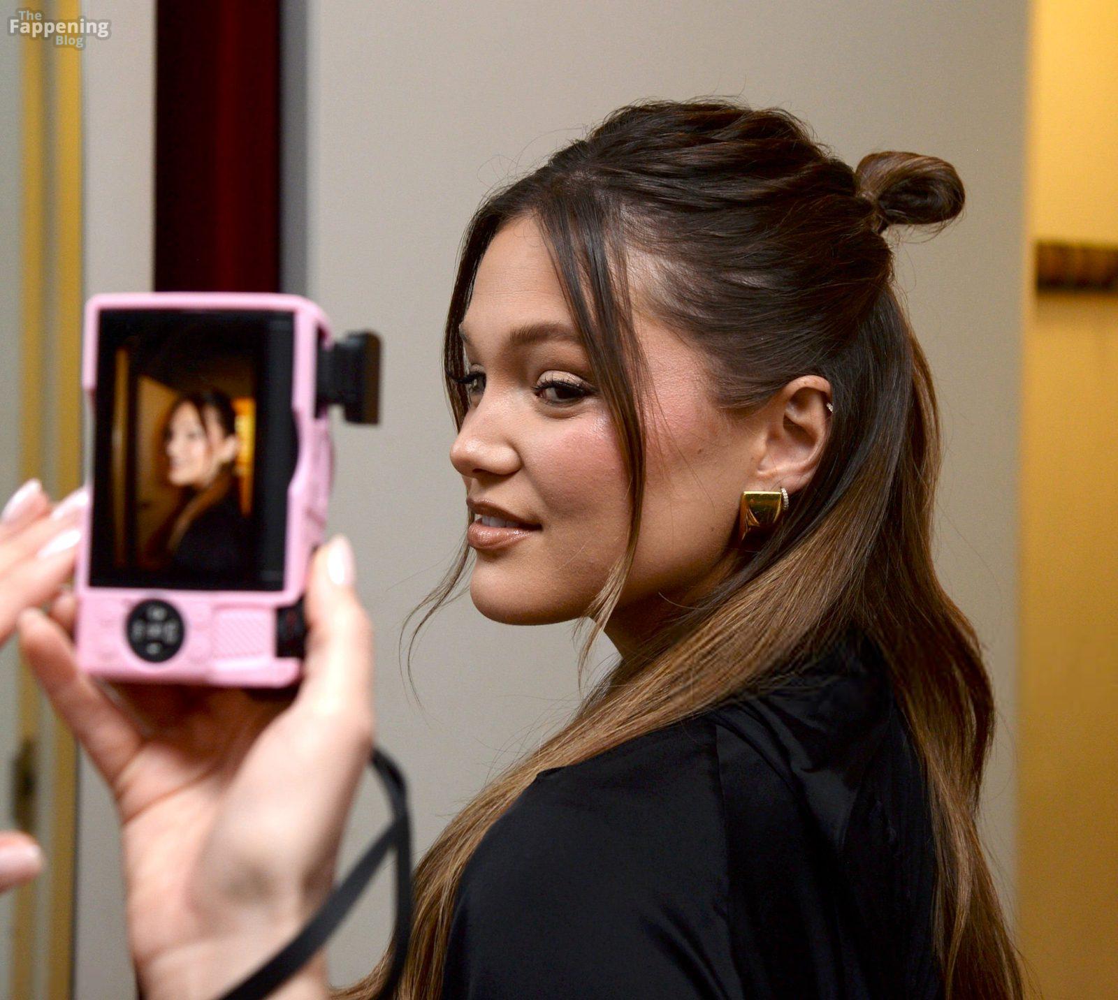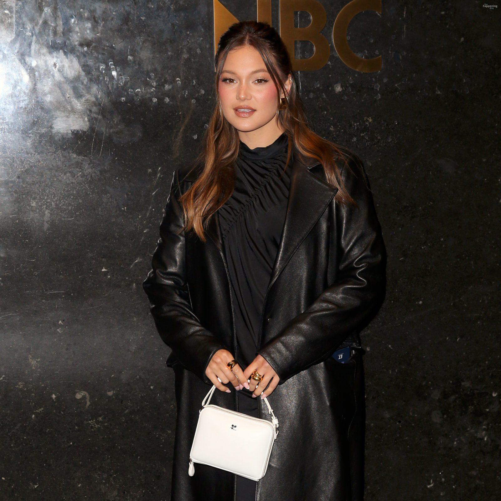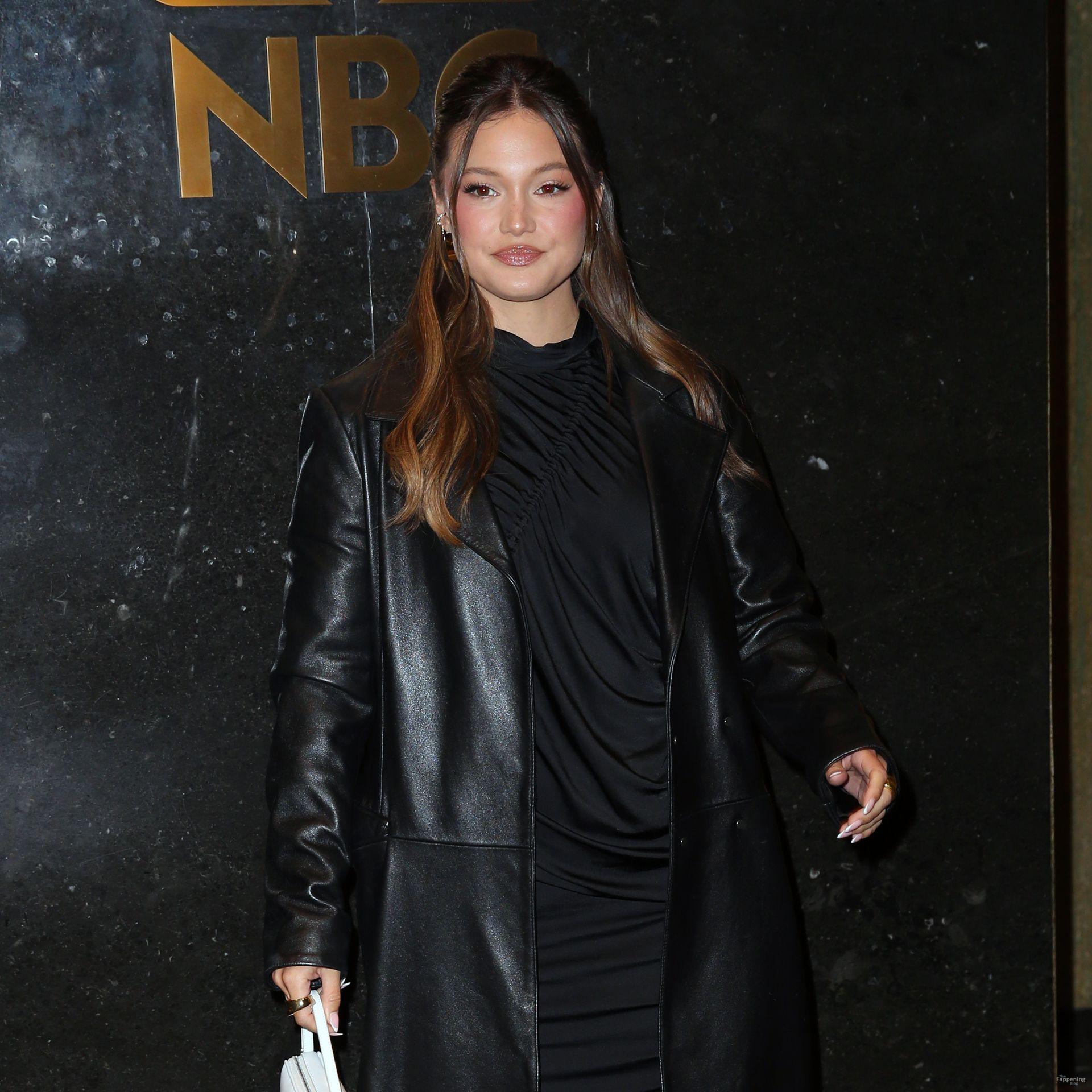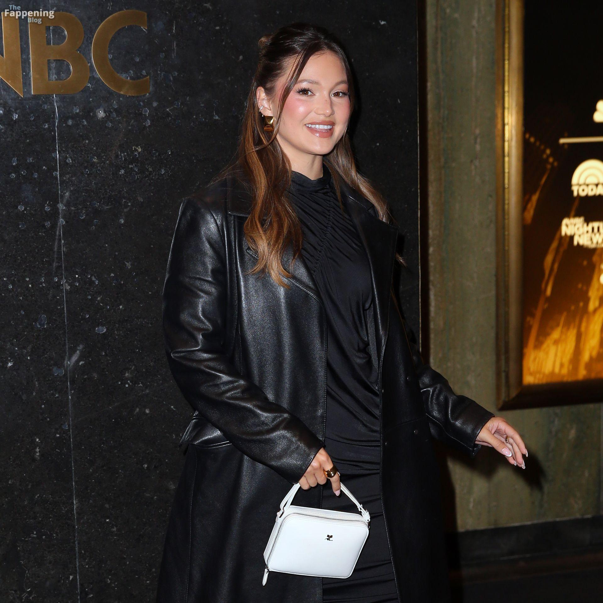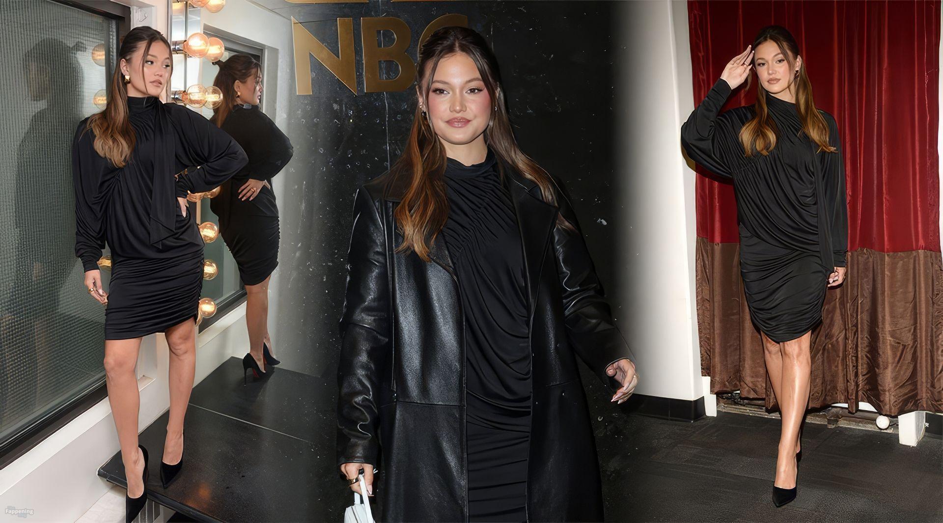 Olivia Holt демонстрирует свои ноги в черном кожаном пальто и черном платье, когда она приезжает на New York Live.