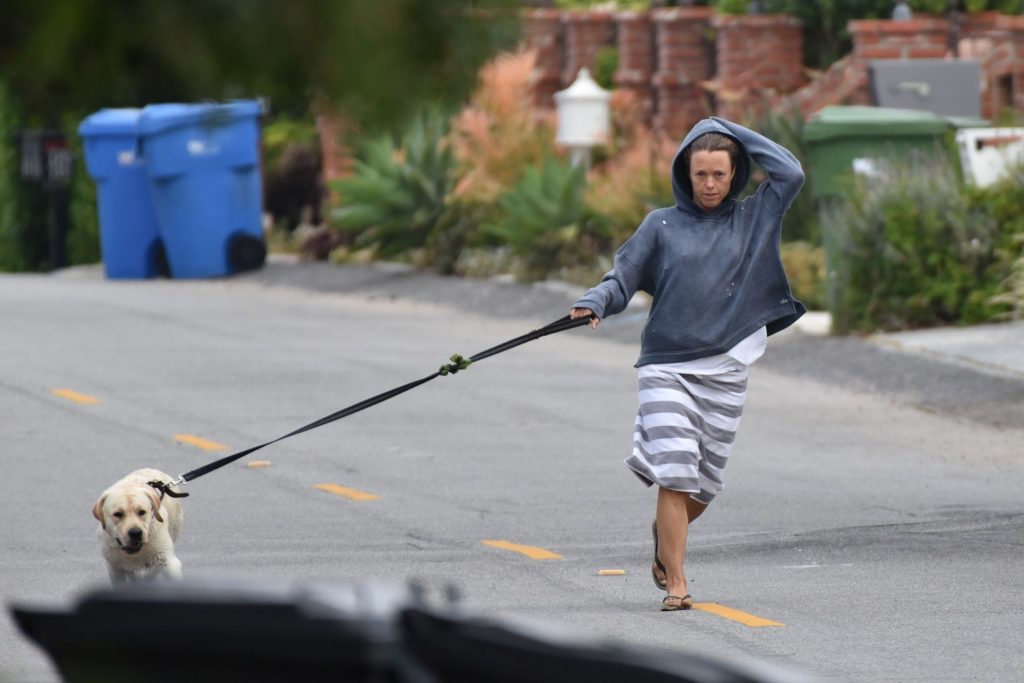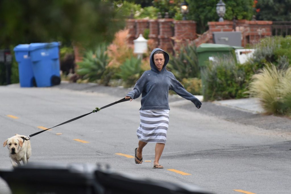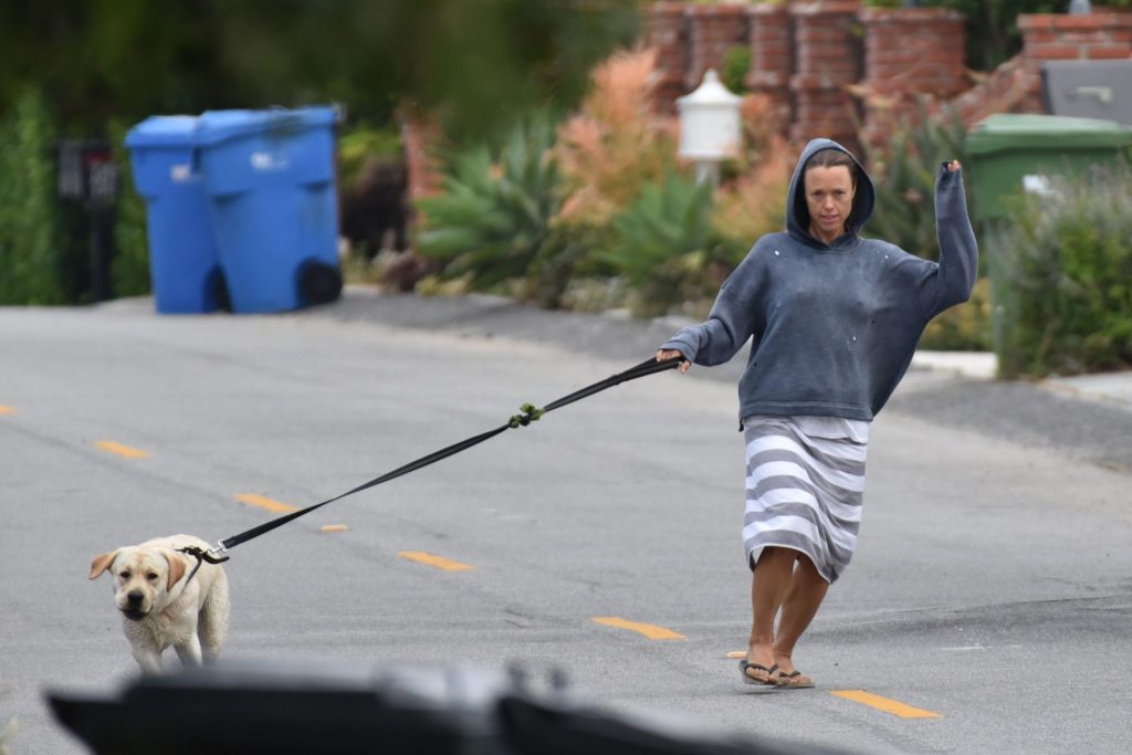 Оуэн Уилсон выгуливает свою собаку в сопровождении жены Кэролайн Линдквист, которая показывает свои груди в Малибу, 27.05.2020.