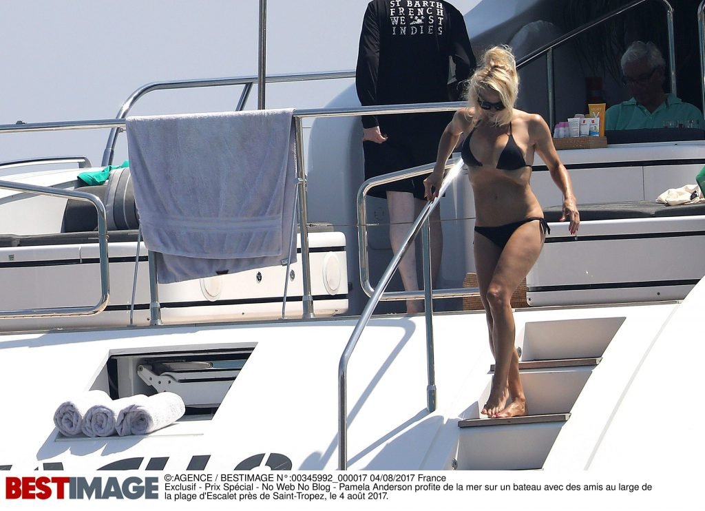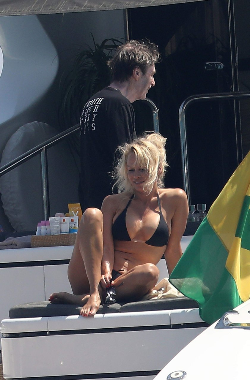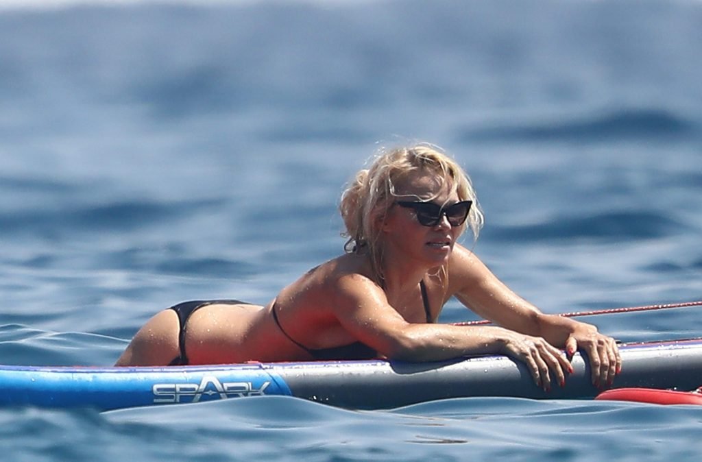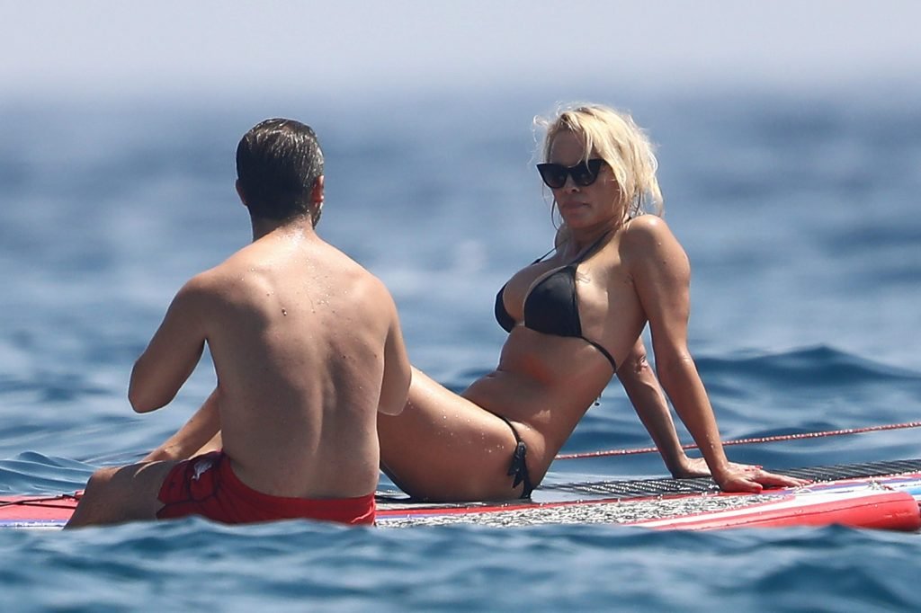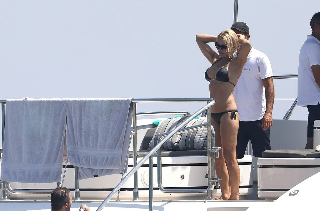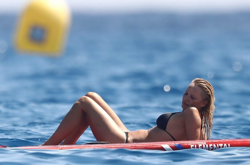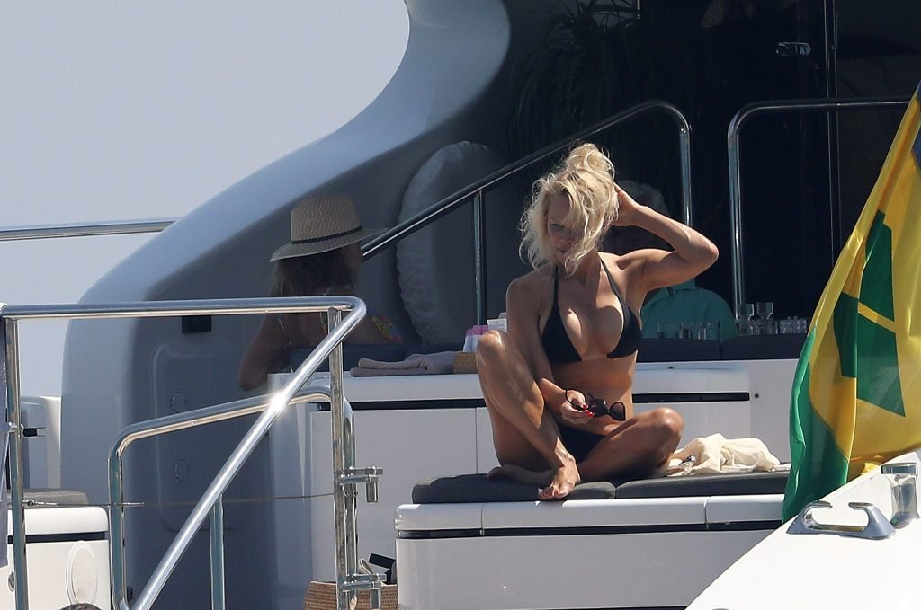 Pamela Anderson демонстрирует свое горячее тело в черном бикини на отдыхе во Франции, 04.08.2017. Памела Андерсон — канадско-американская актриса (Спасатели Малибу, 2017), модель, активистка. Возраст – 50.