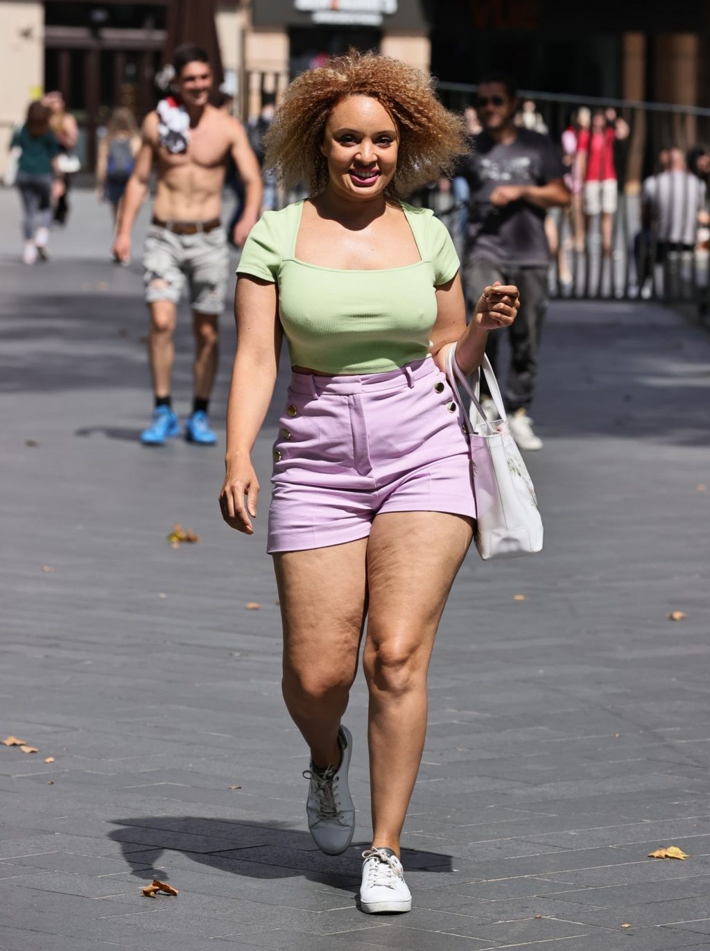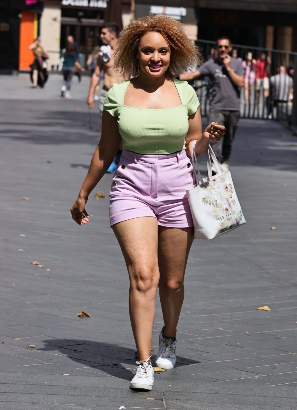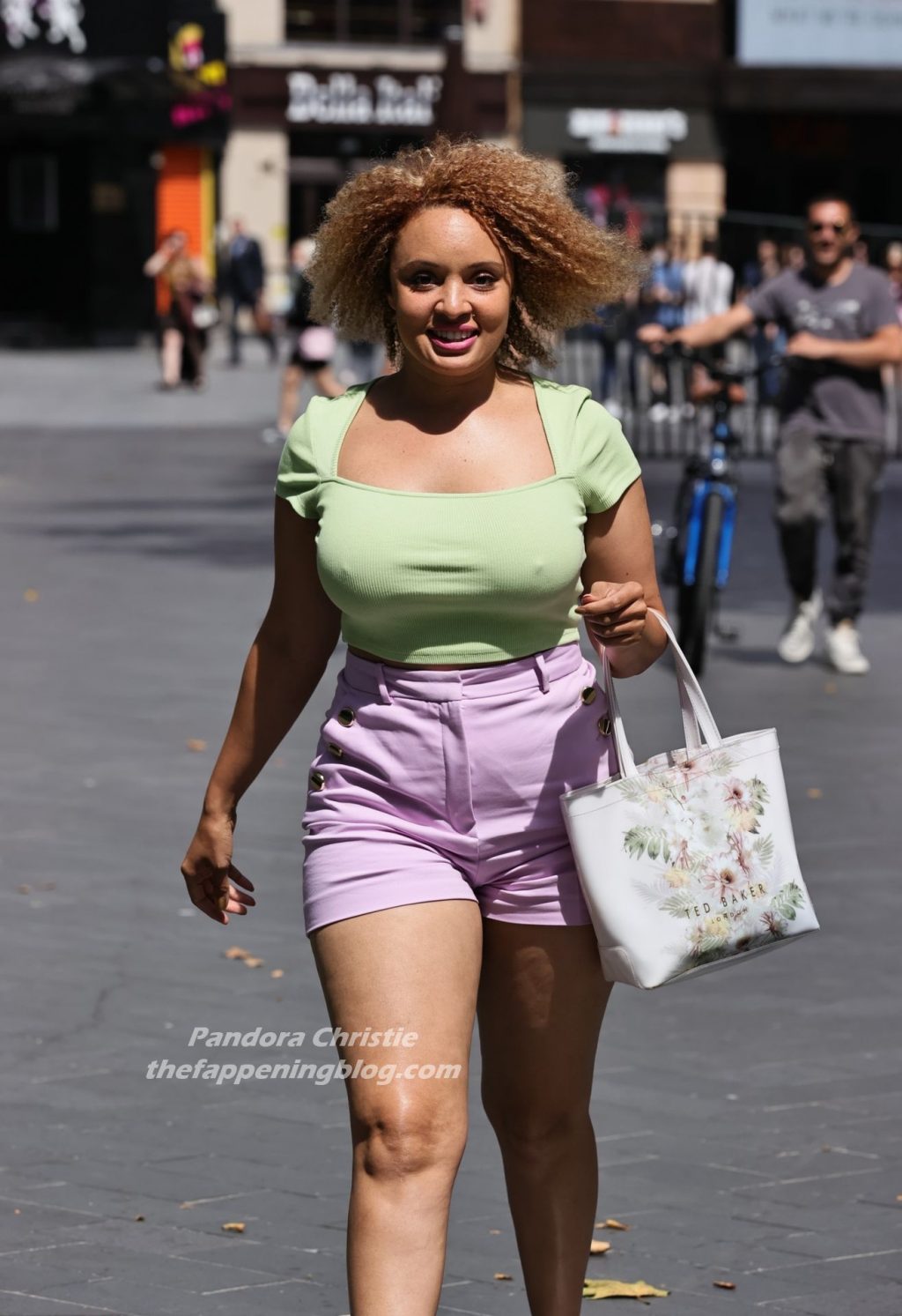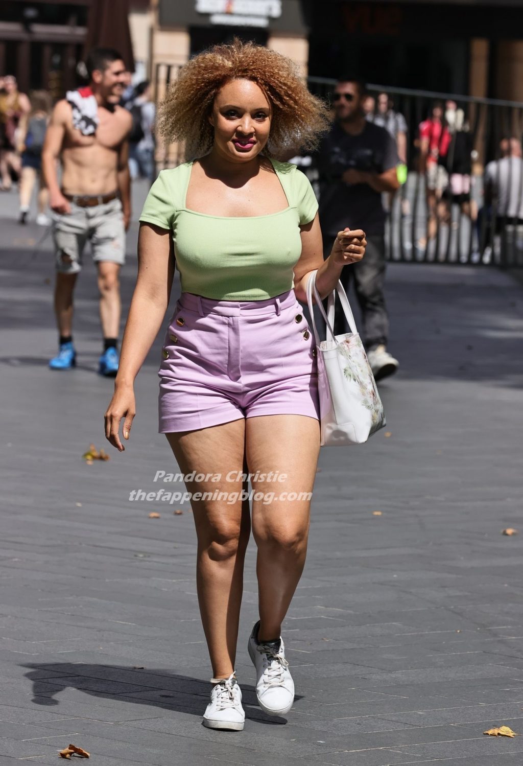 Пышногрудая бьюти-блогер и радиоведущая Пандора Кристи запечатлена в топе и шортах на радио Heart в Лондоне, 08/03/2020.