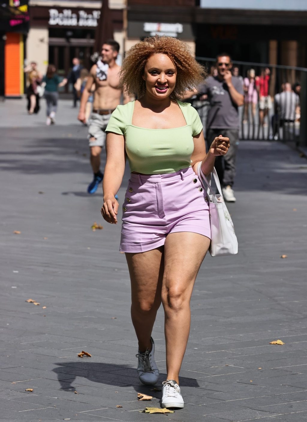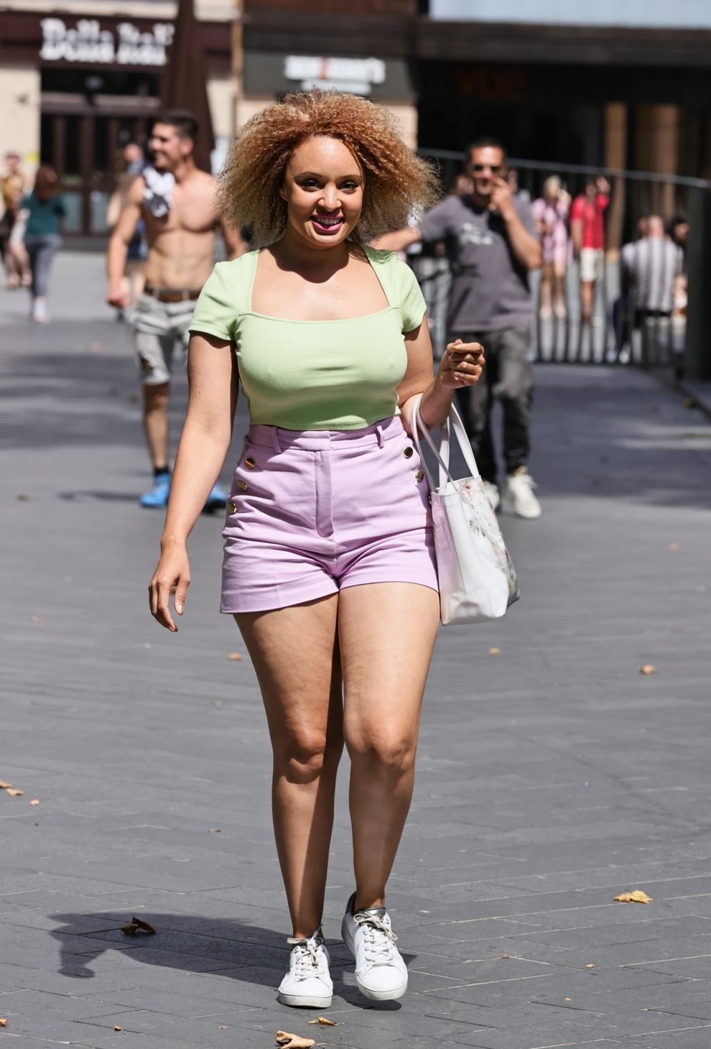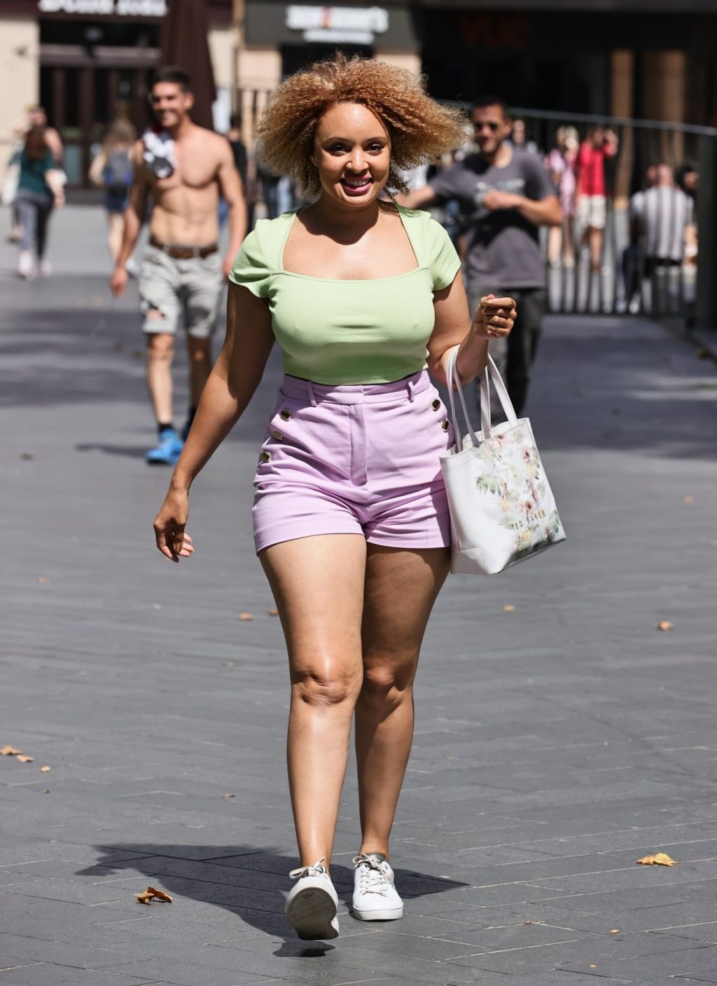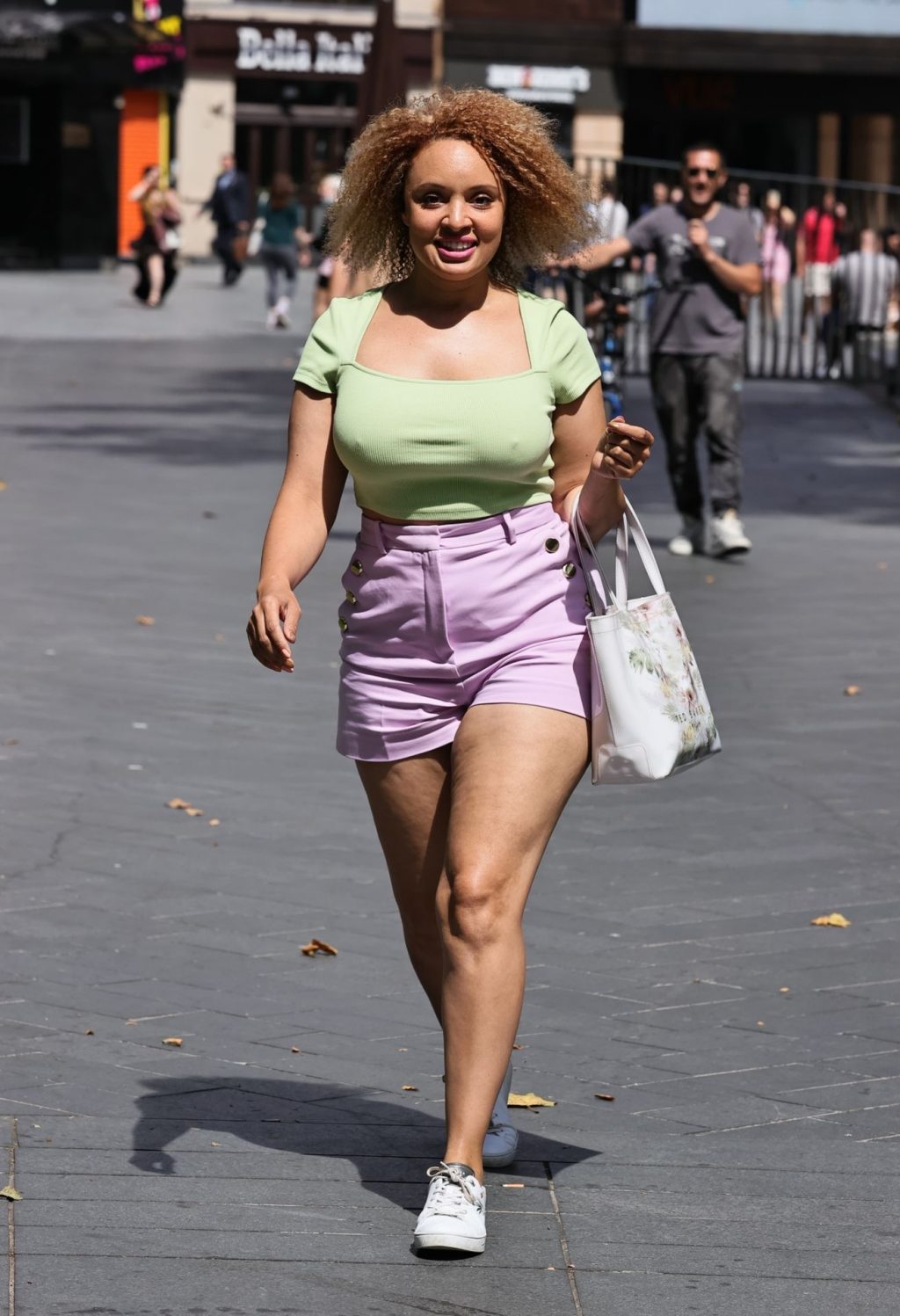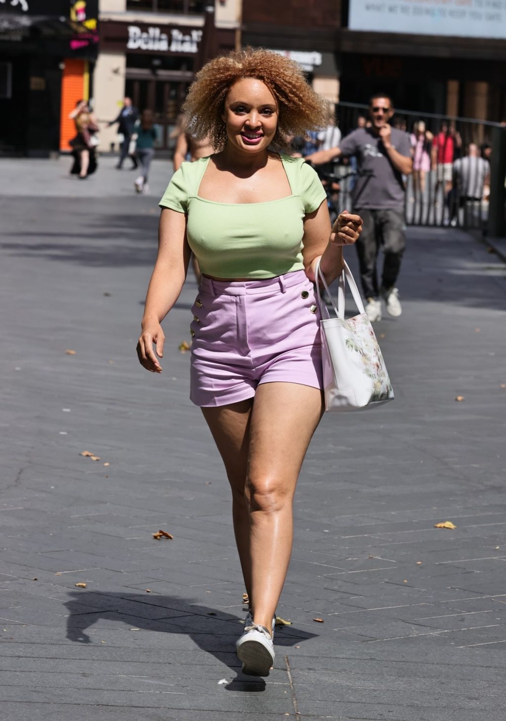 Пышногрудая бьюти-блогер и радиоведущая Пандора Кристи запечатлена в топе и шортах на радио Heart в Лондоне, 08/03/2020.