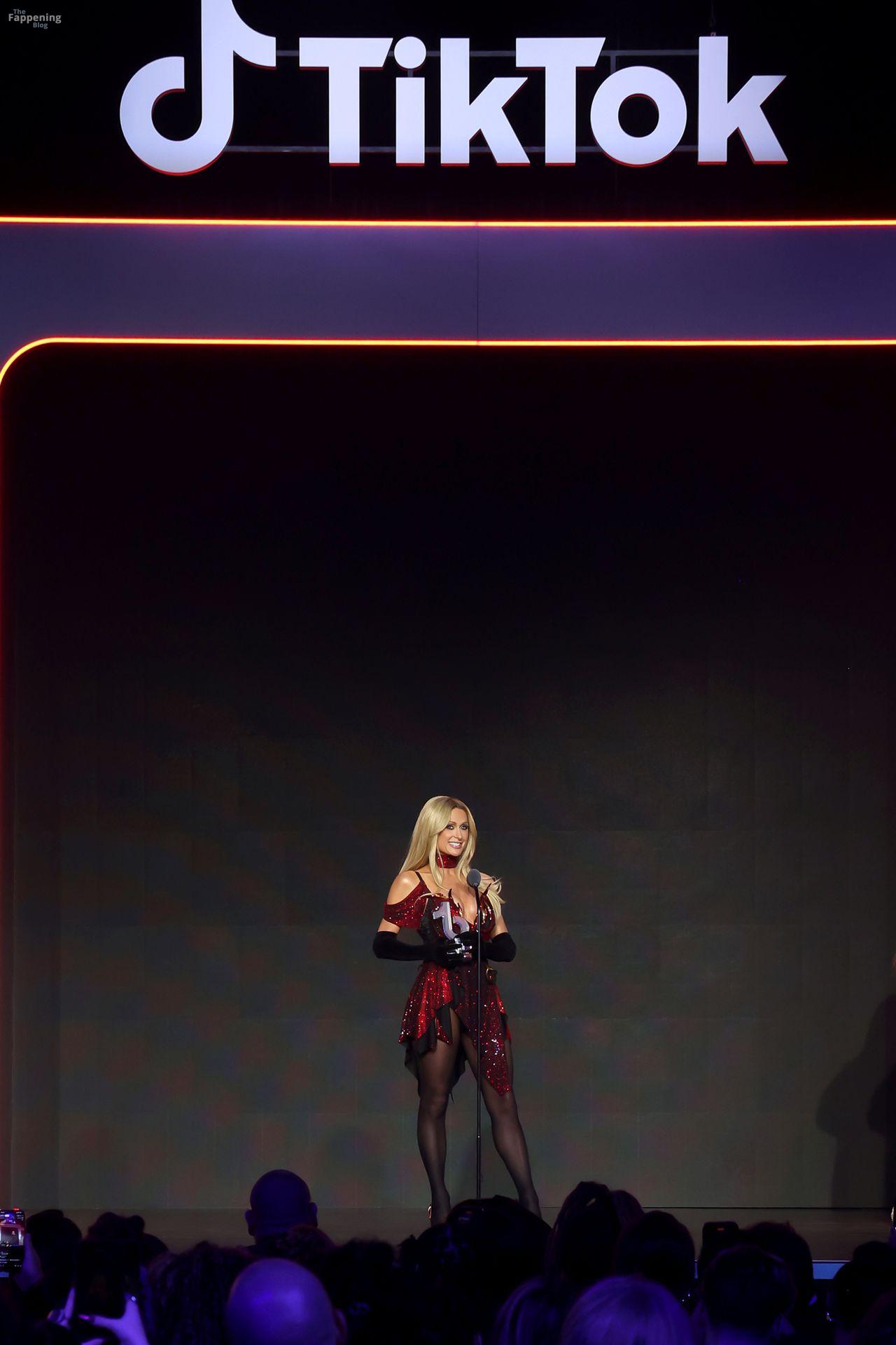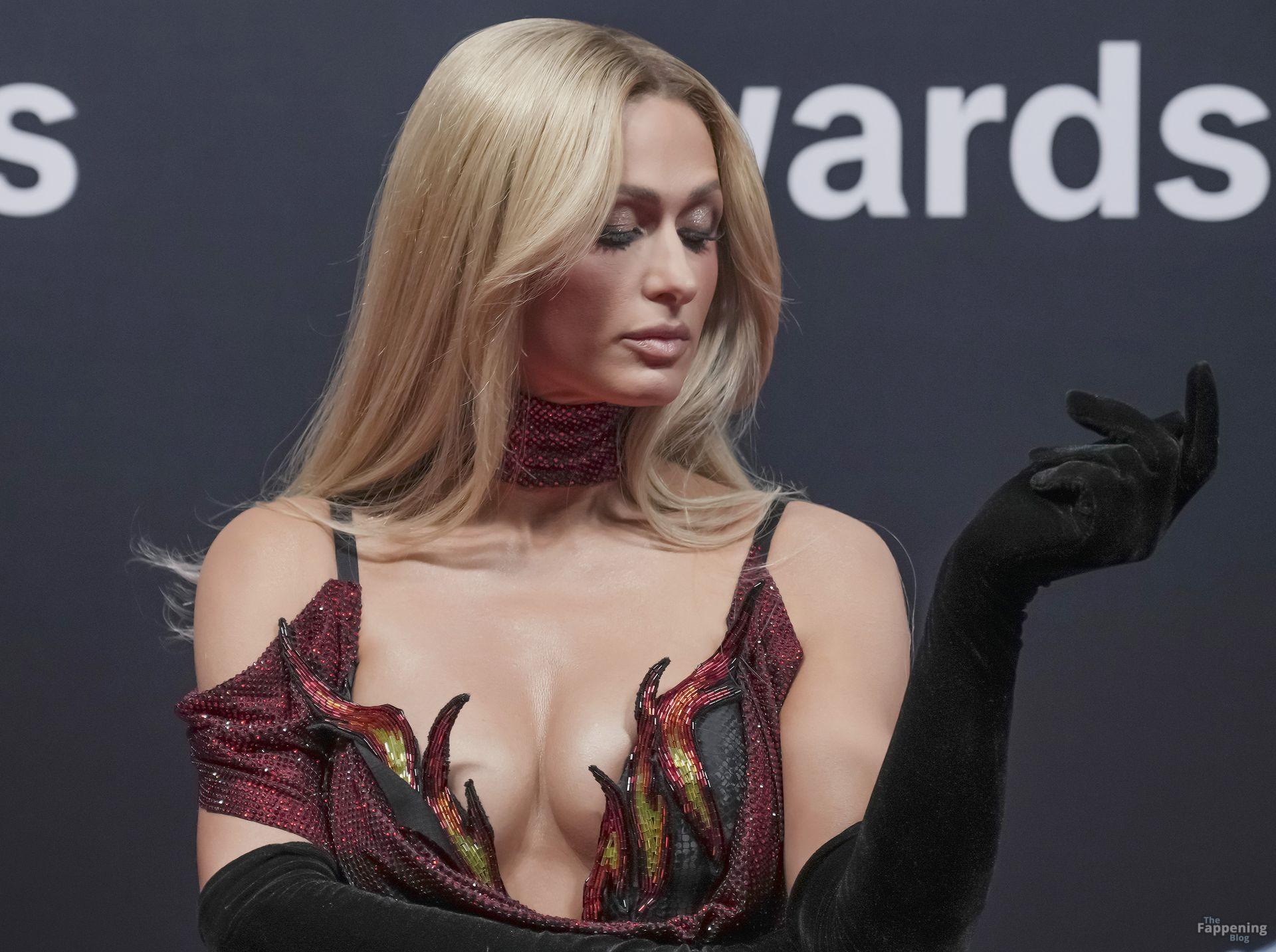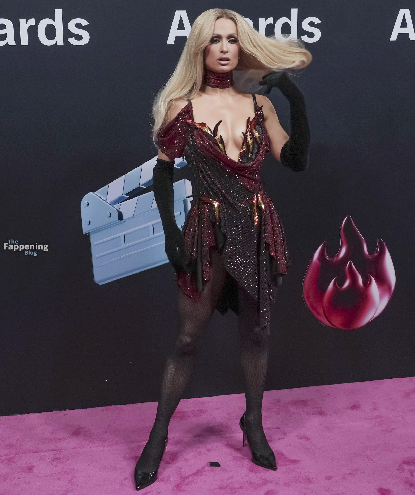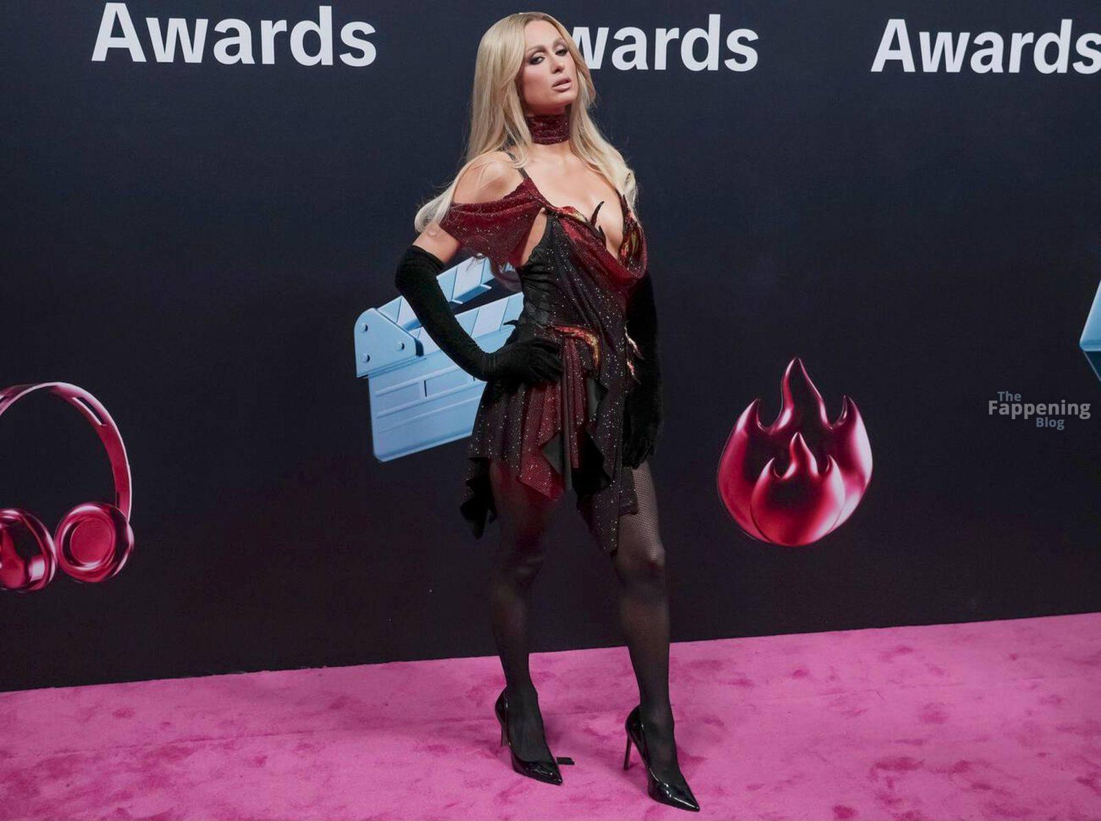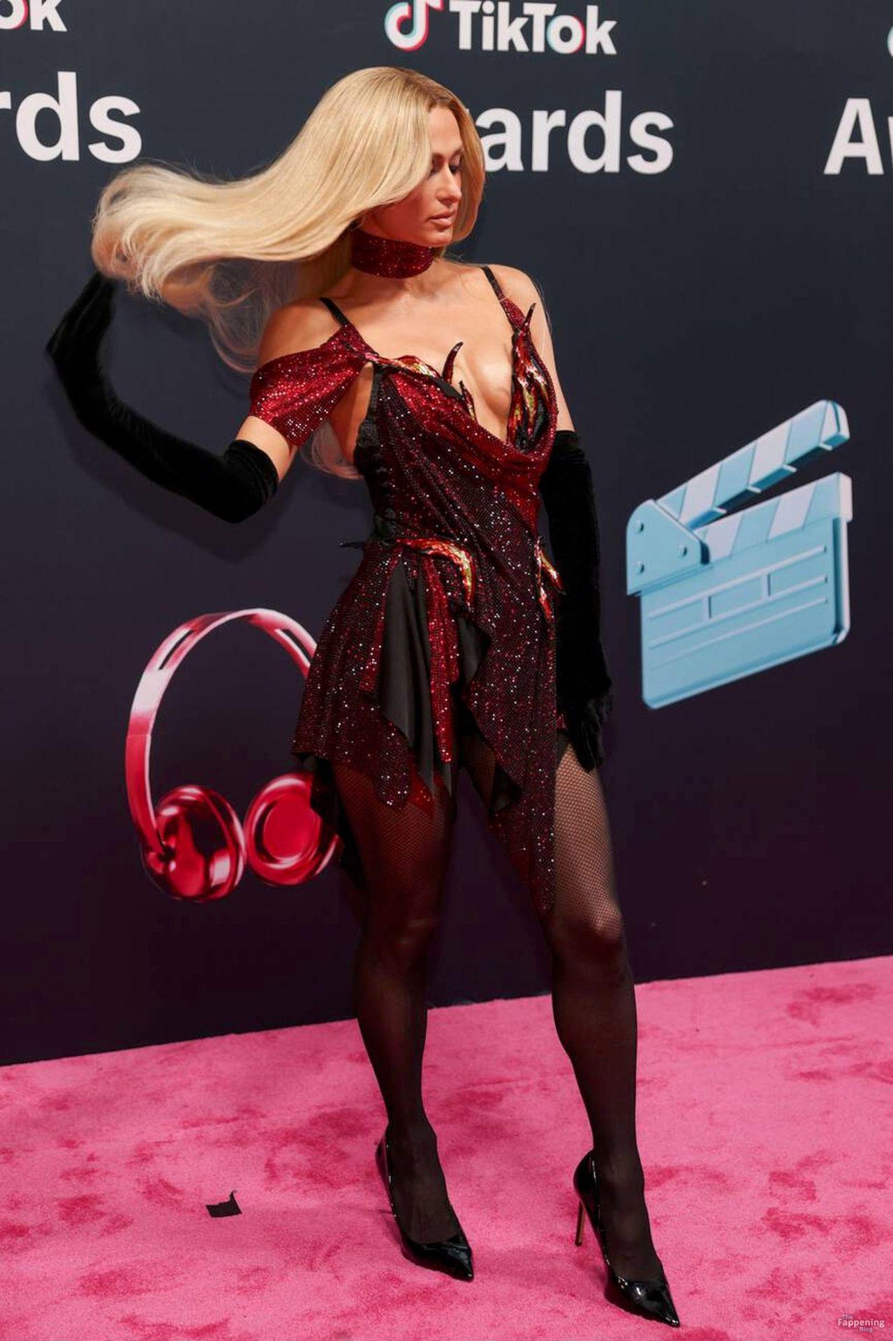 Пэрис Хилтон демонстрирует свои сексуальные ноги и грудь в огненно-красном платье на премии TikTok 2025.
