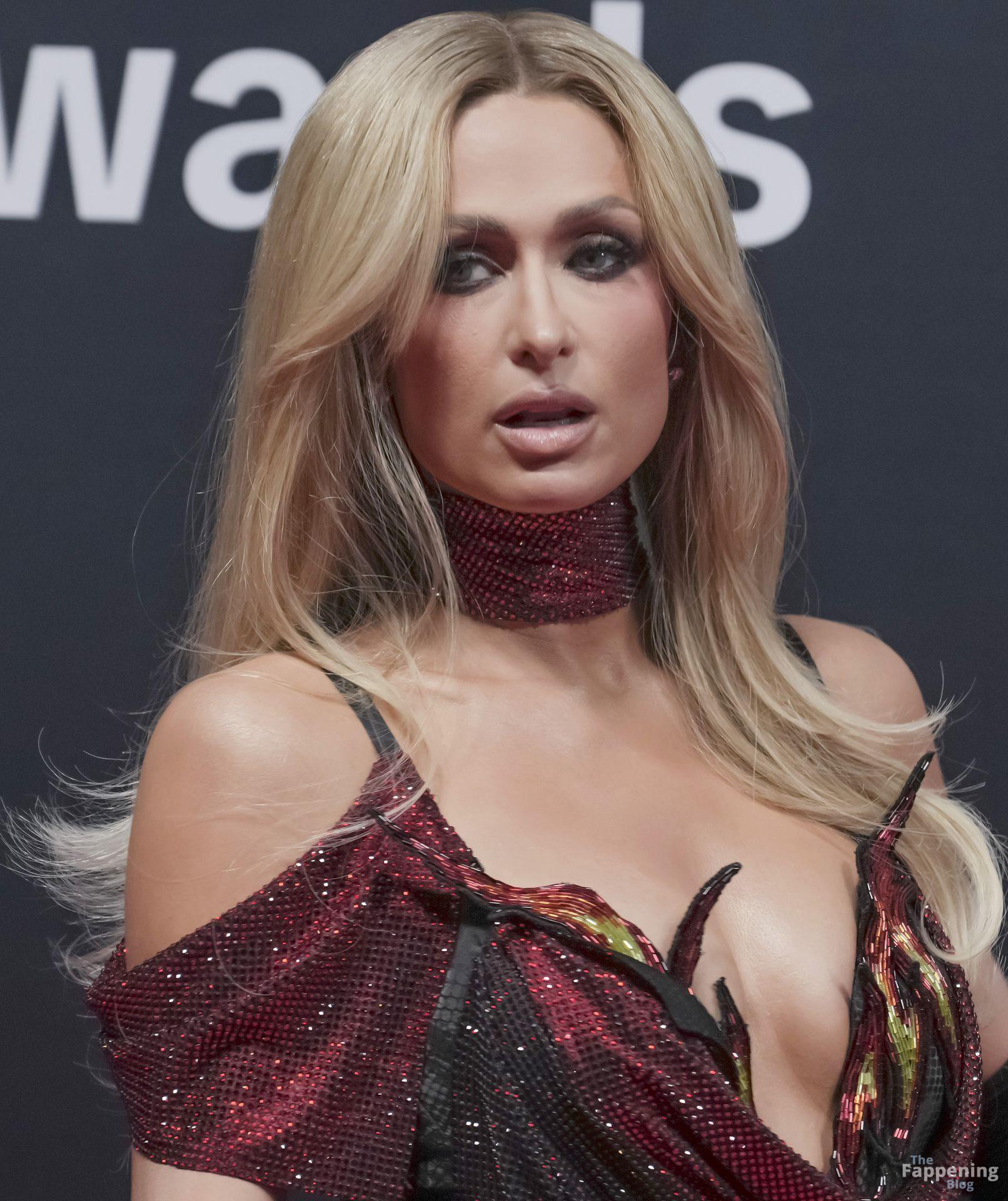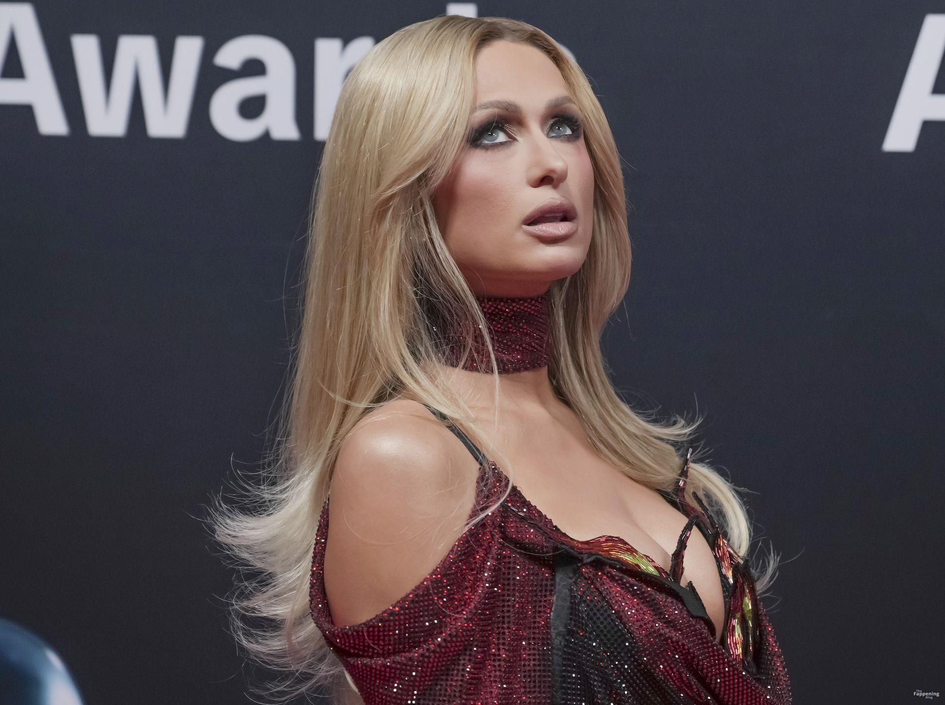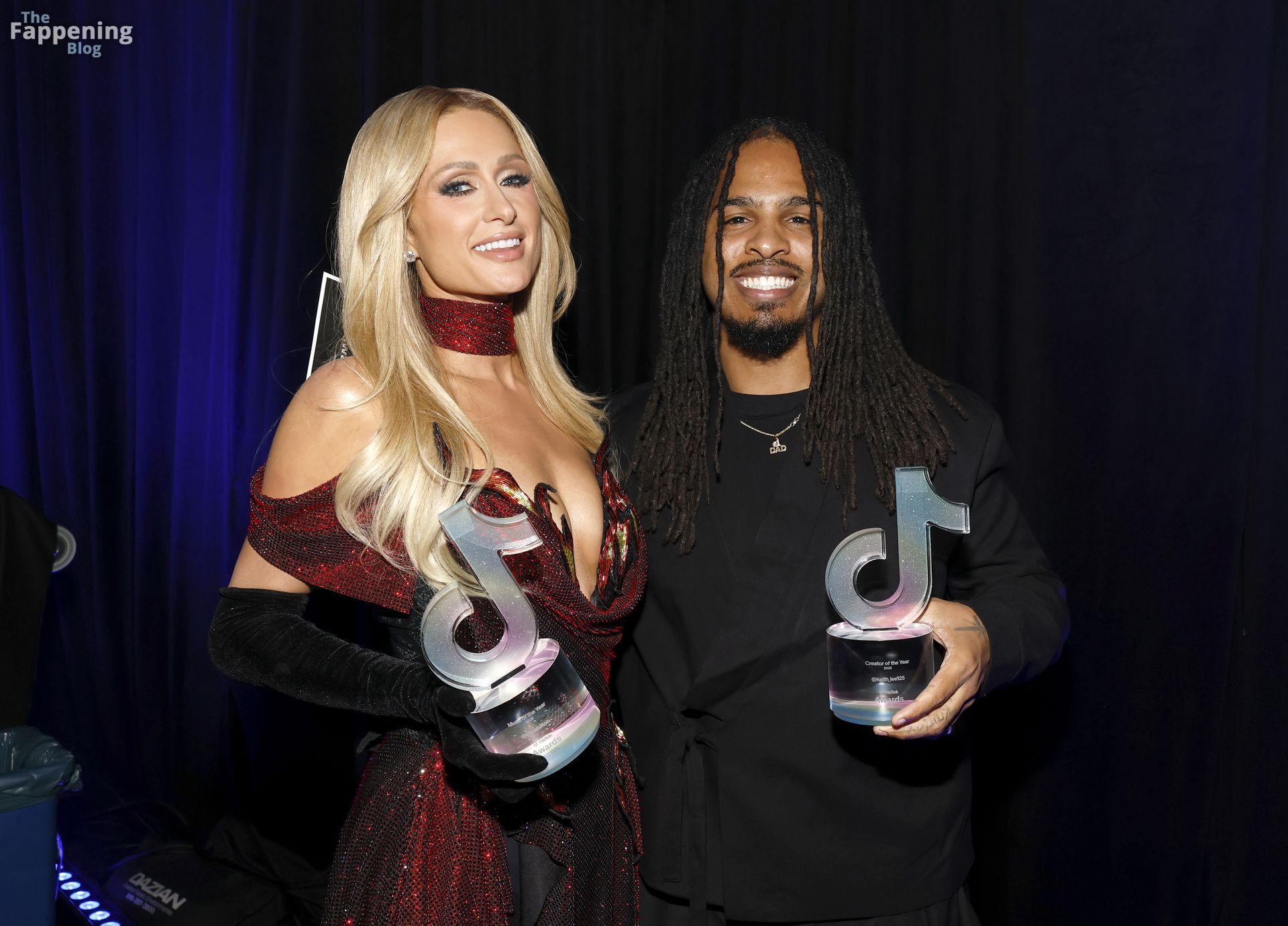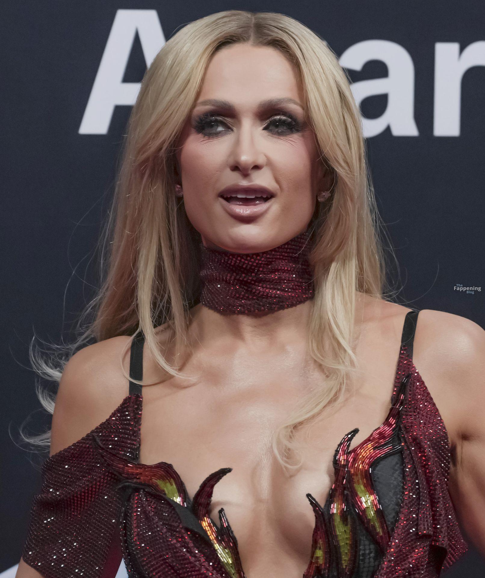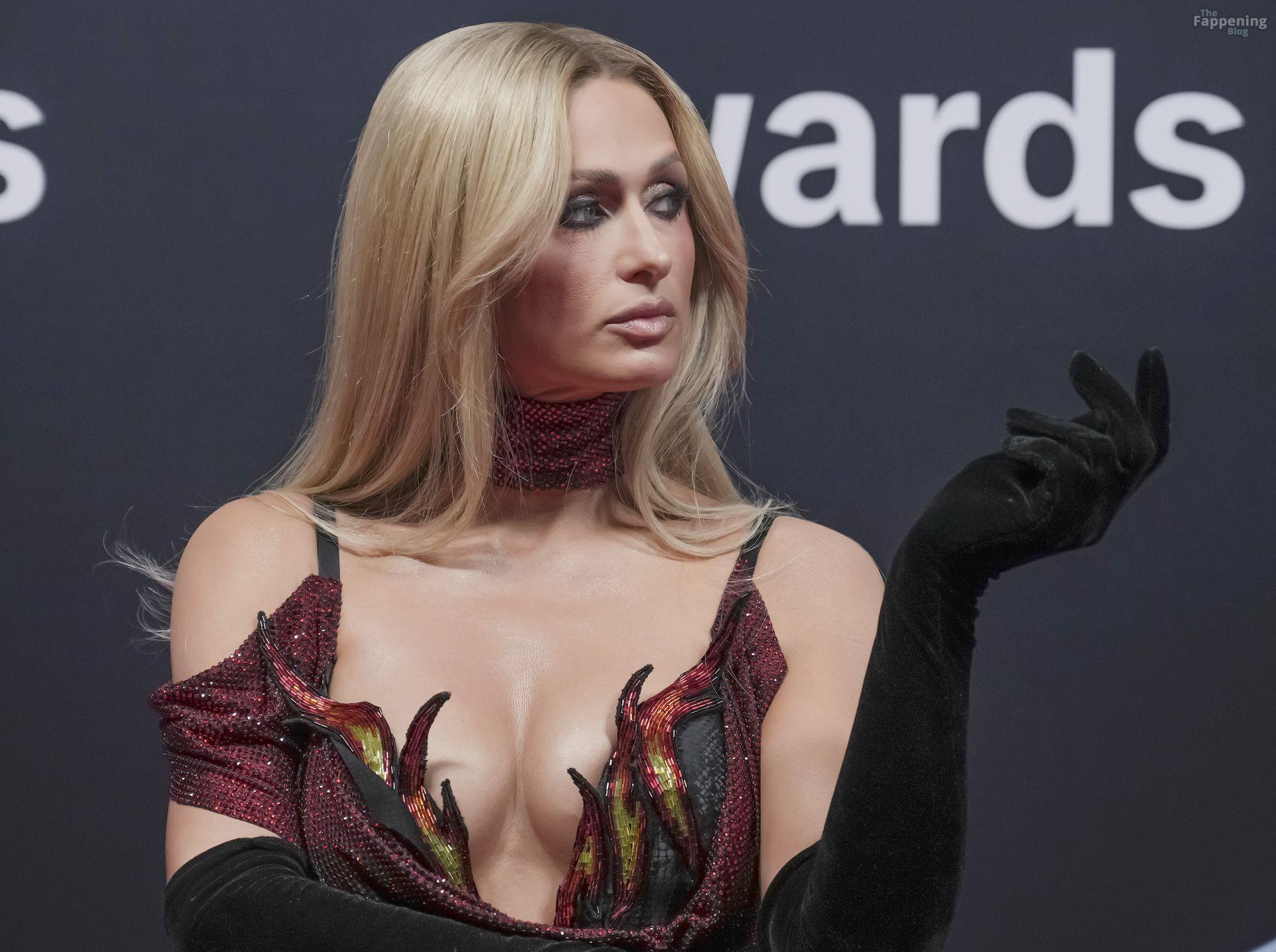 Пэрис Хилтон демонстрирует свои сексуальные ноги и грудь в огненно-красном платье на премии TikTok 2025.