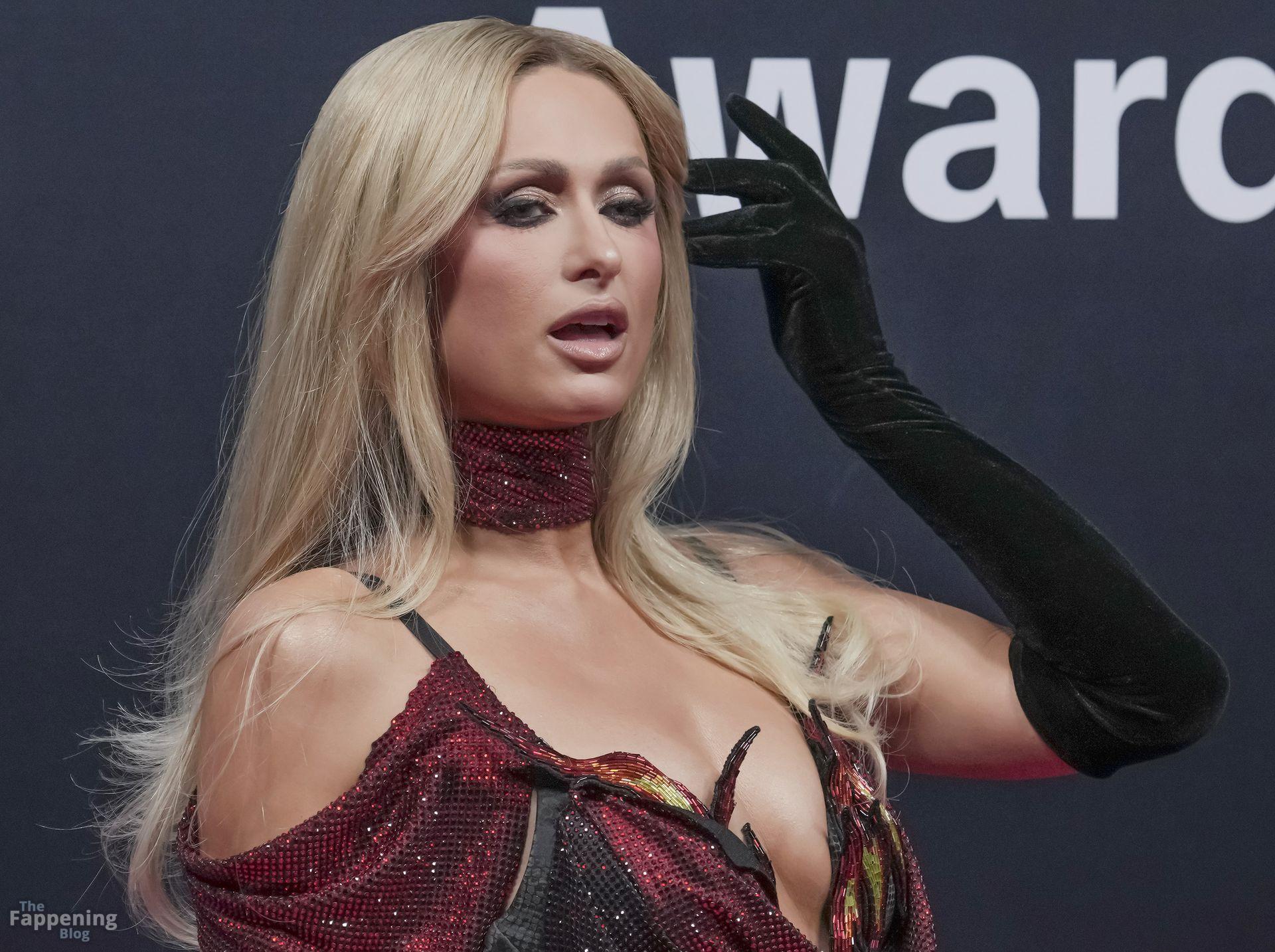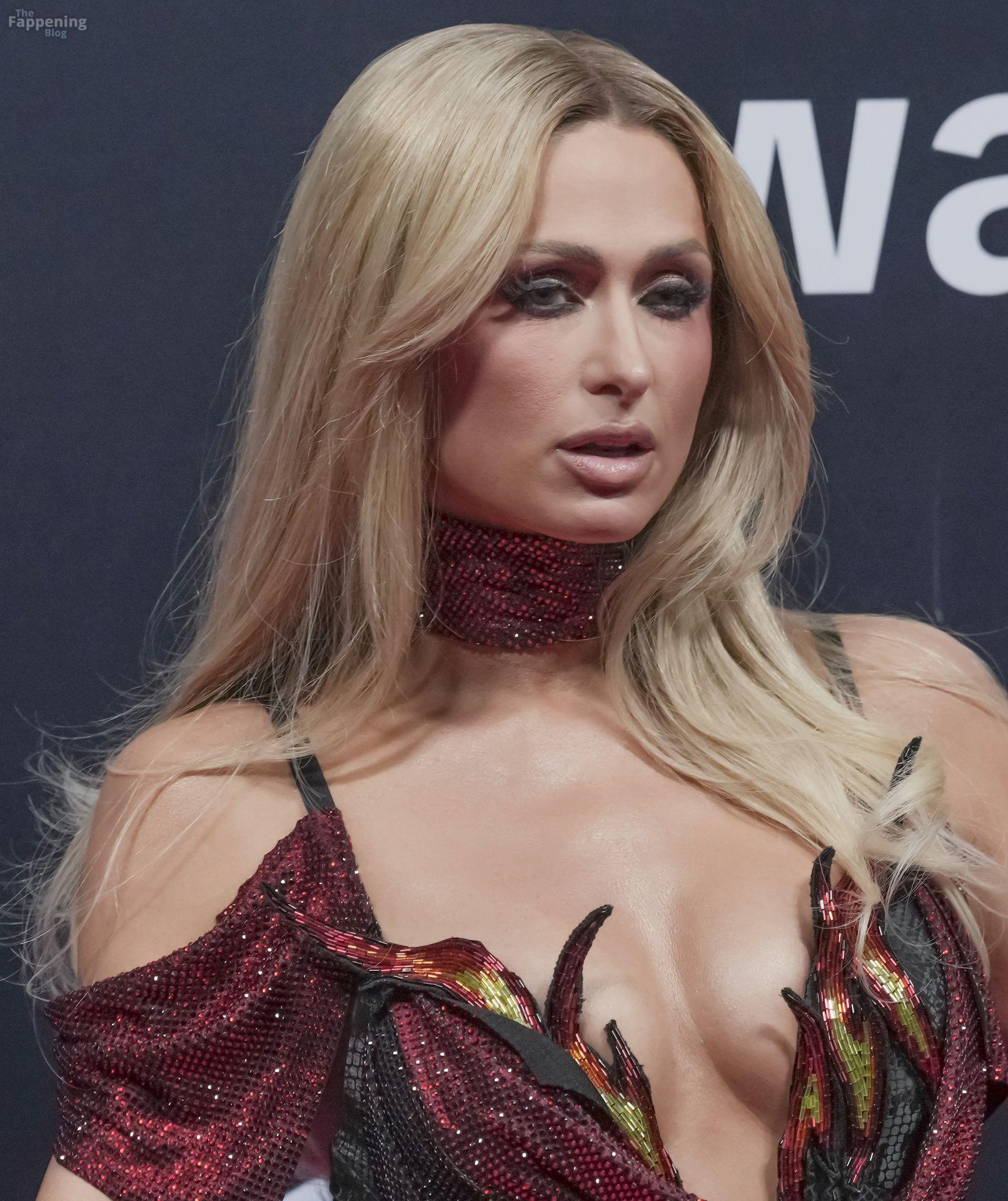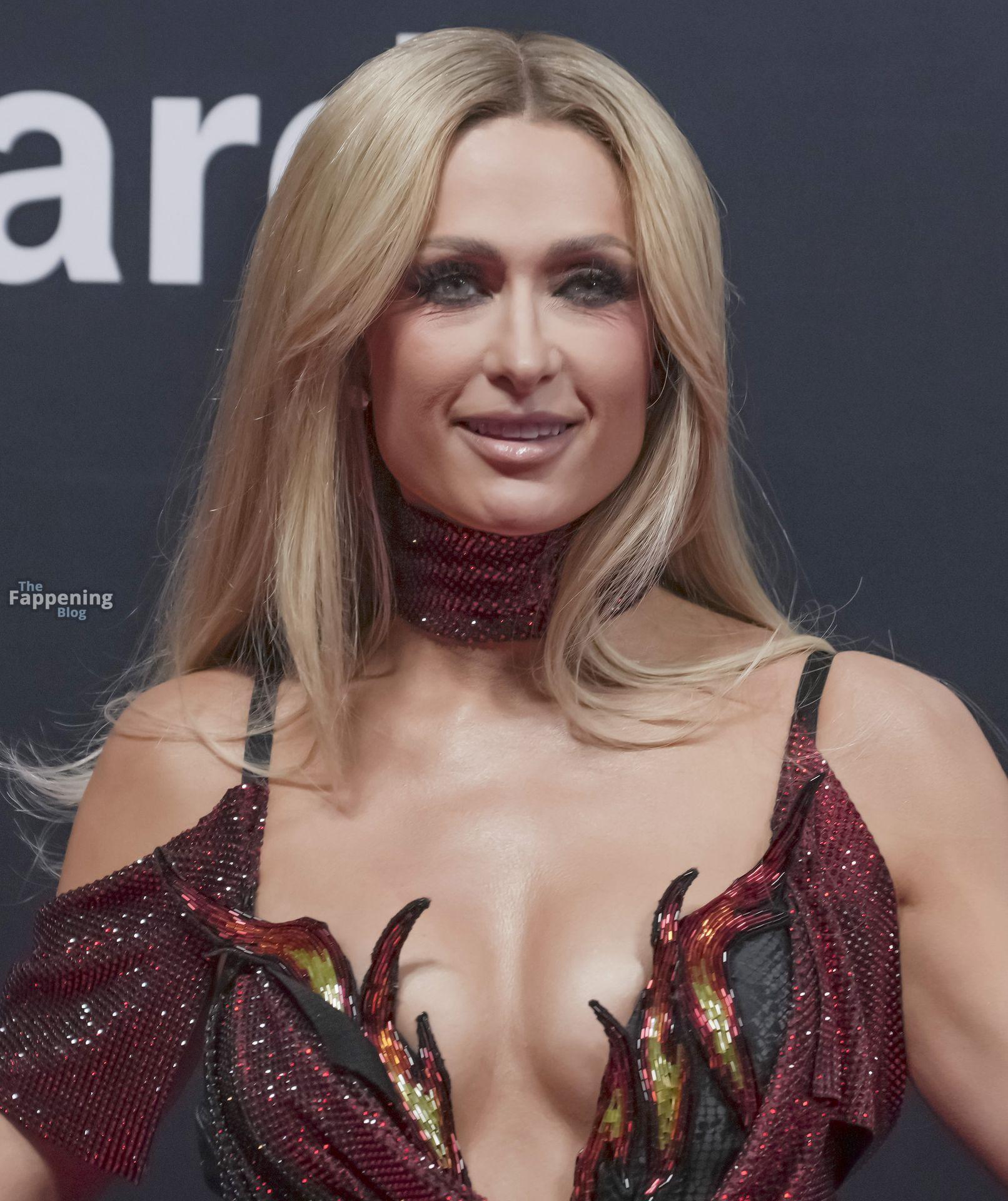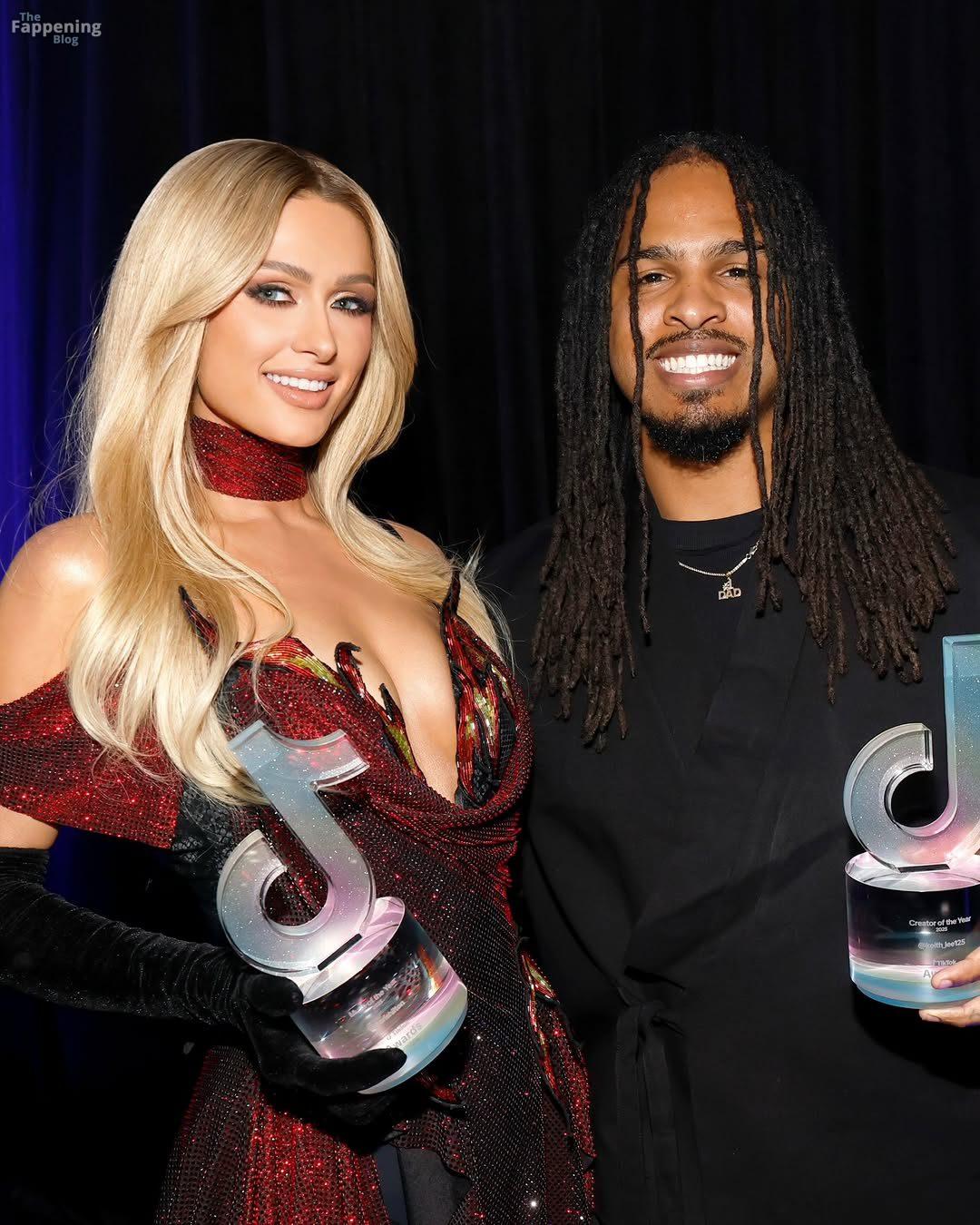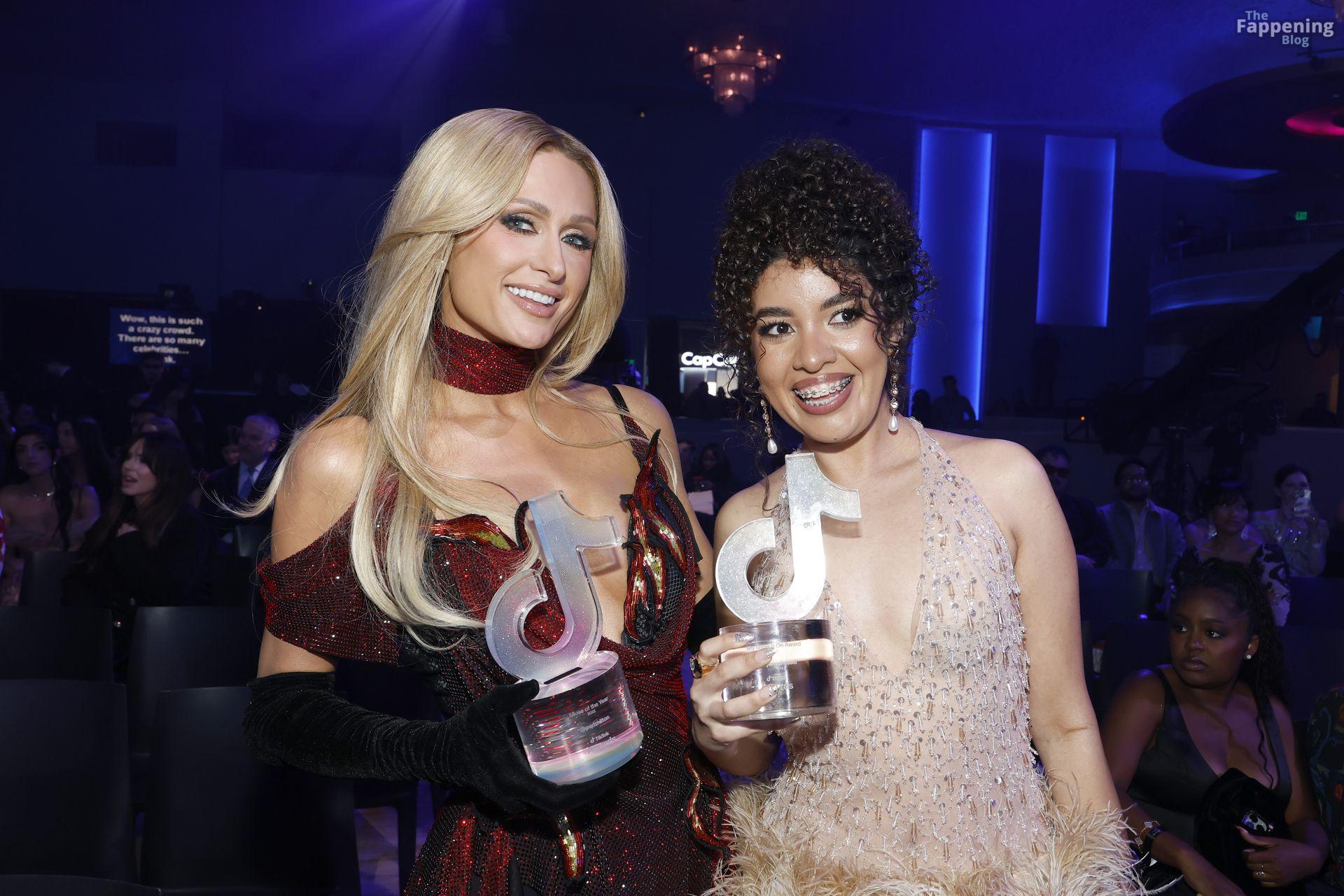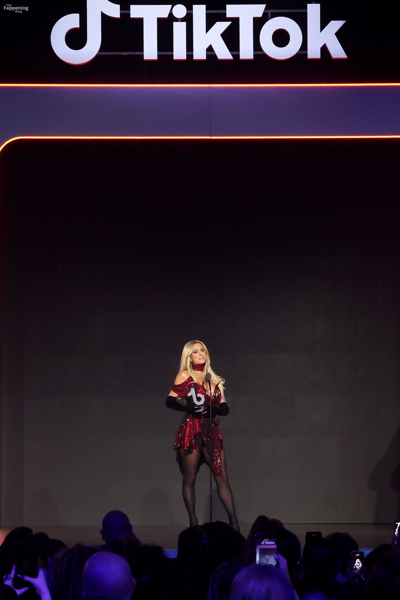 Пэрис Хилтон демонстрирует свои сексуальные ноги и грудь в огненно-красном платье на премии TikTok 2025.