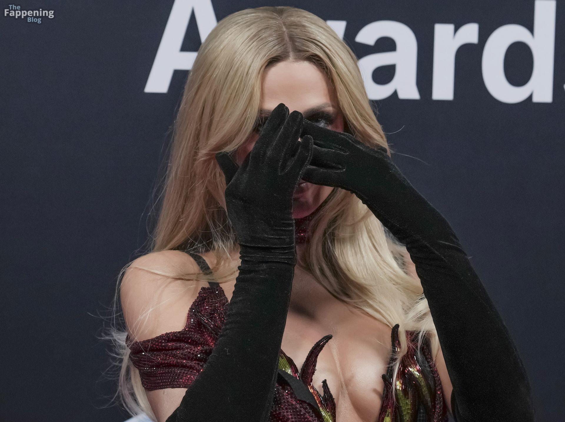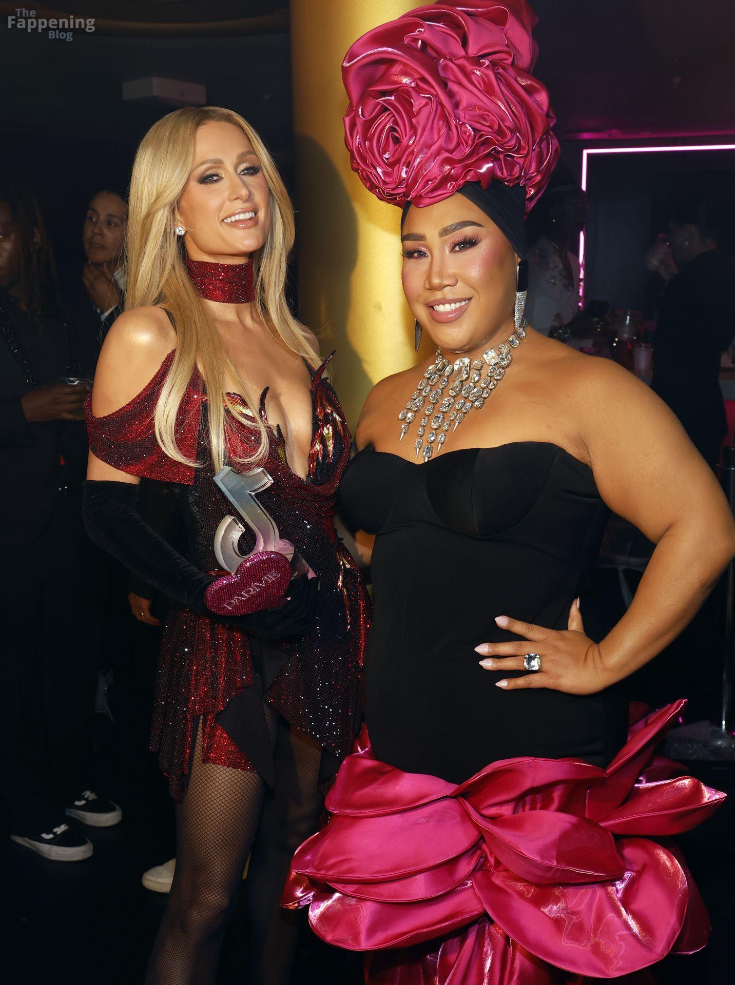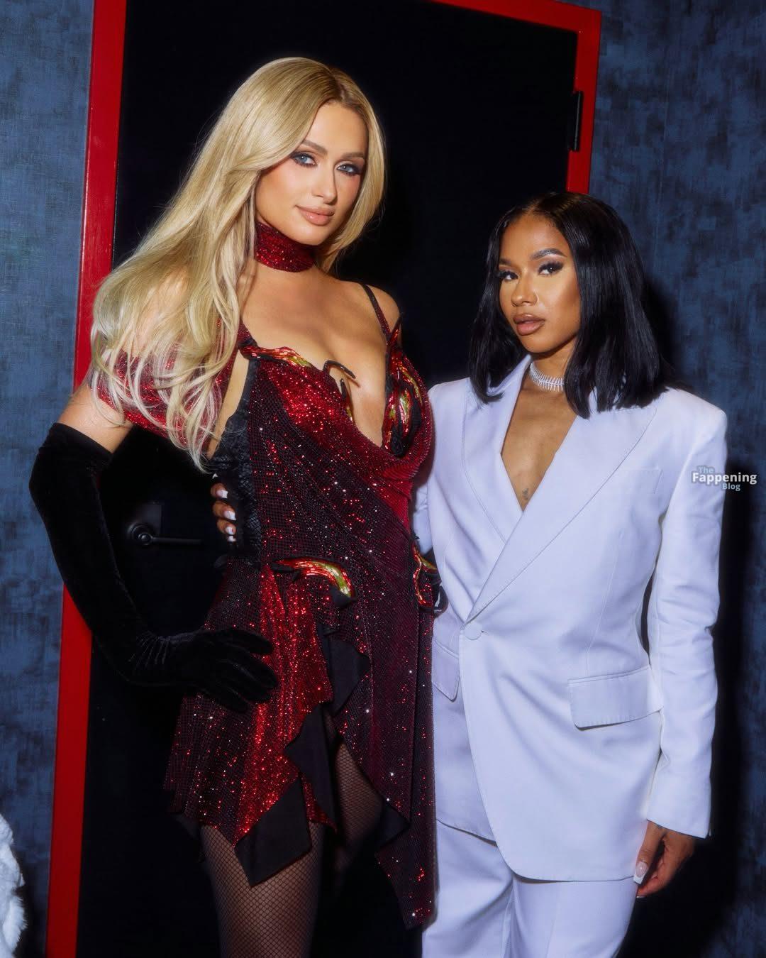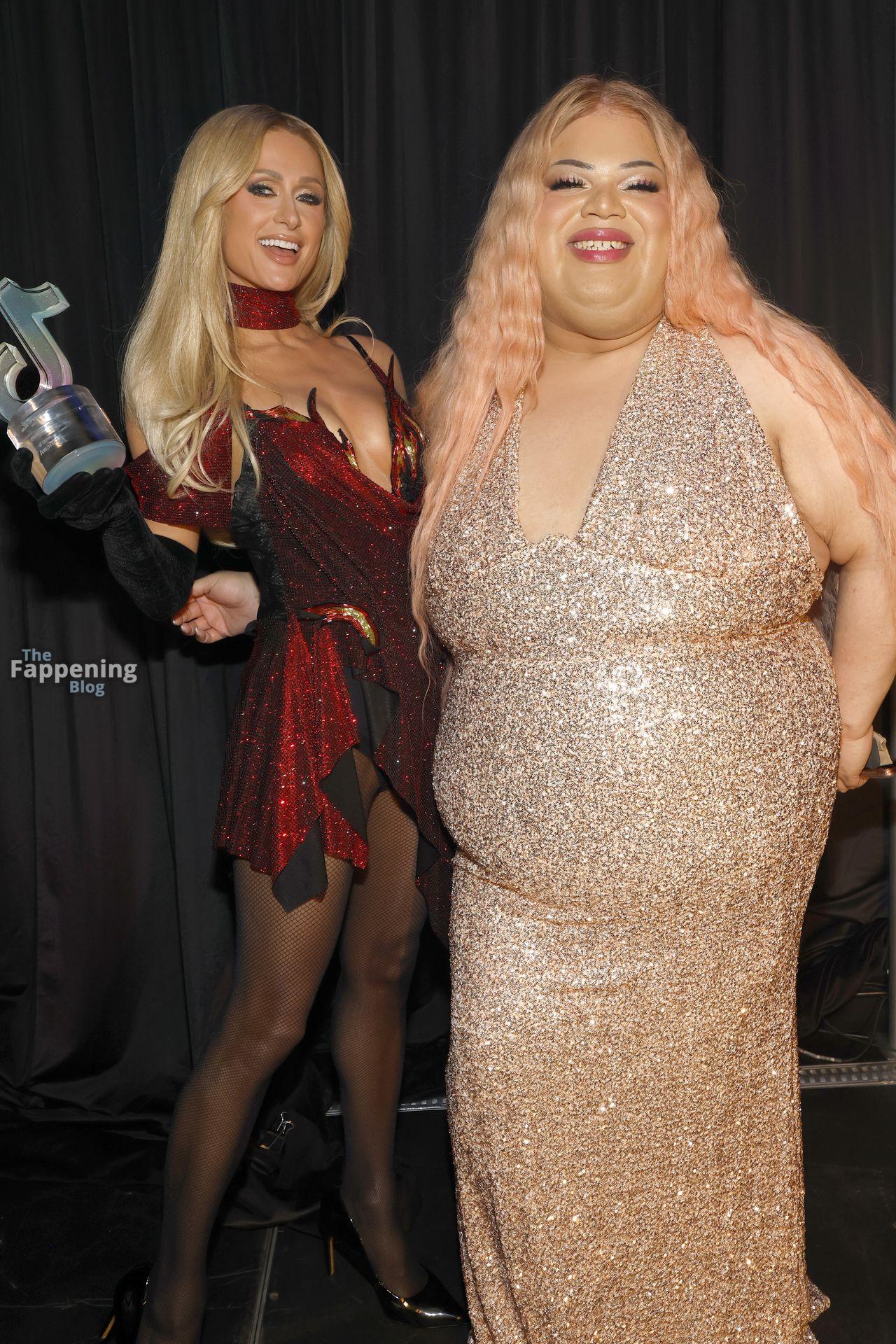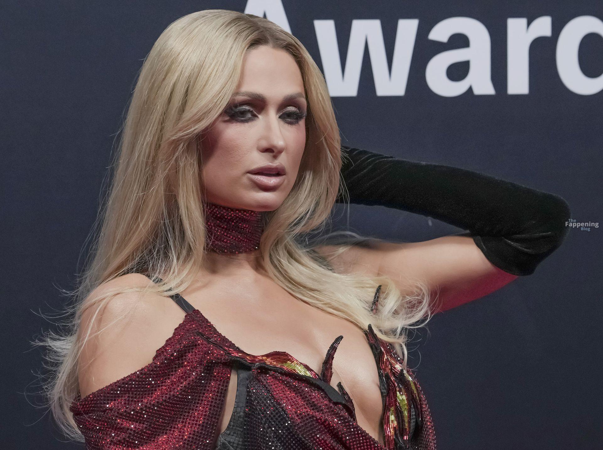 Пэрис Хилтон демонстрирует свои сексуальные ноги и грудь в огненно-красном платье на премии TikTok 2025.