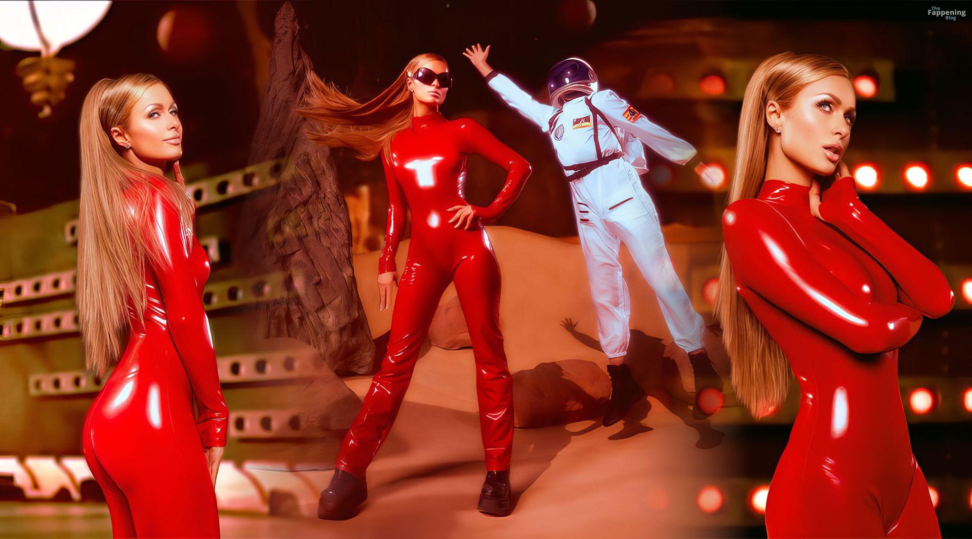 Пэрис Хилтон позирует в красном латексном наряде для съемки “Oops!… I Did It Again”.