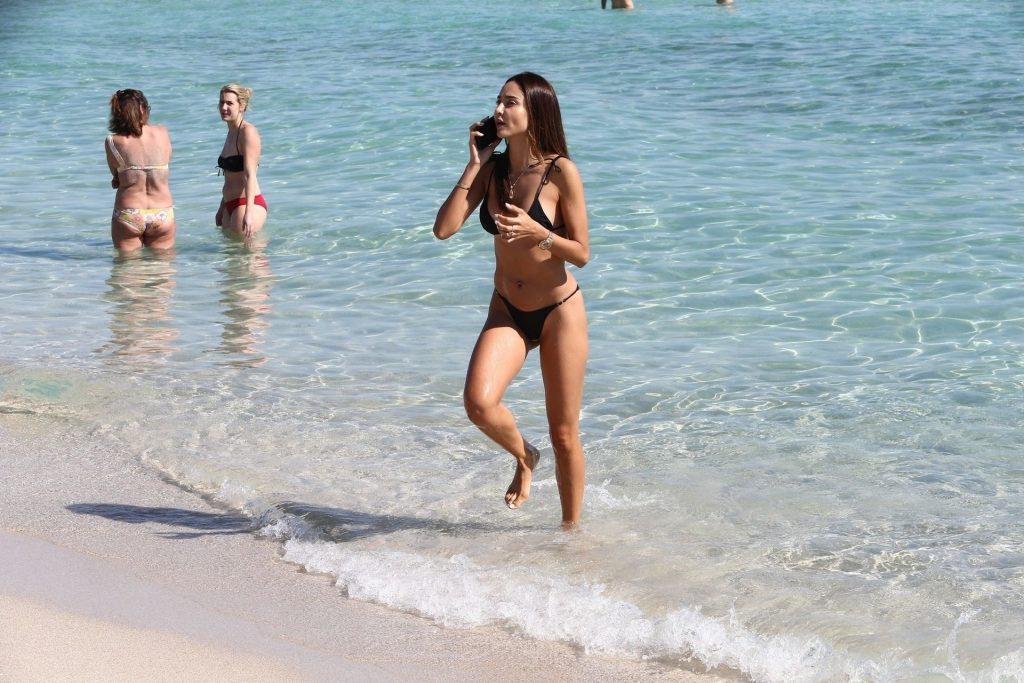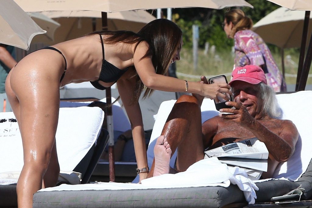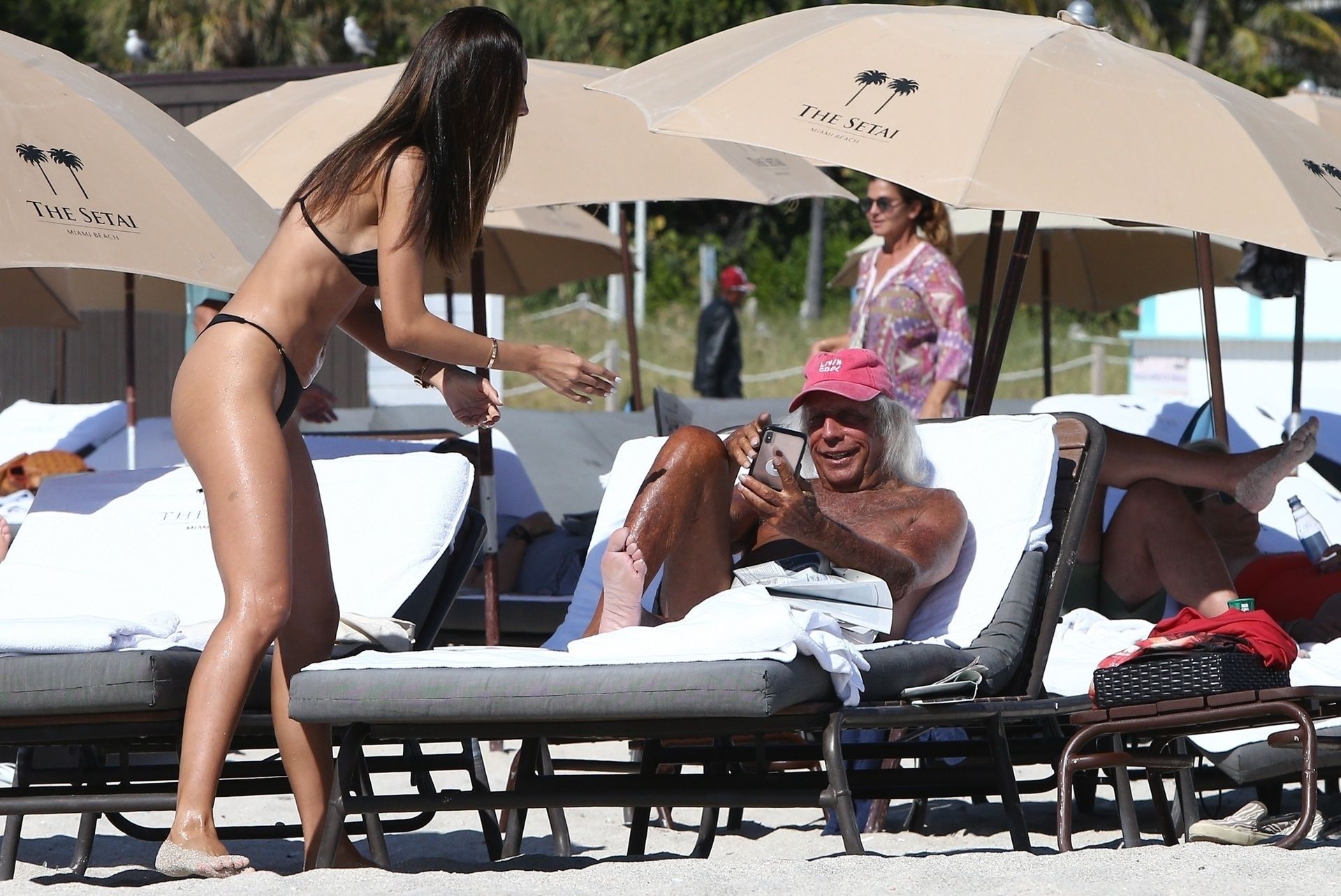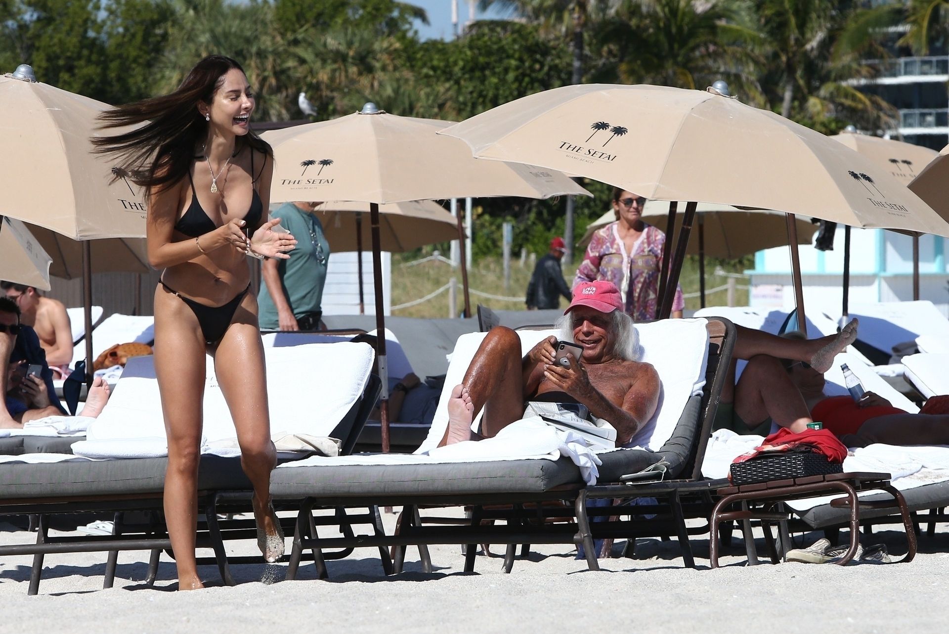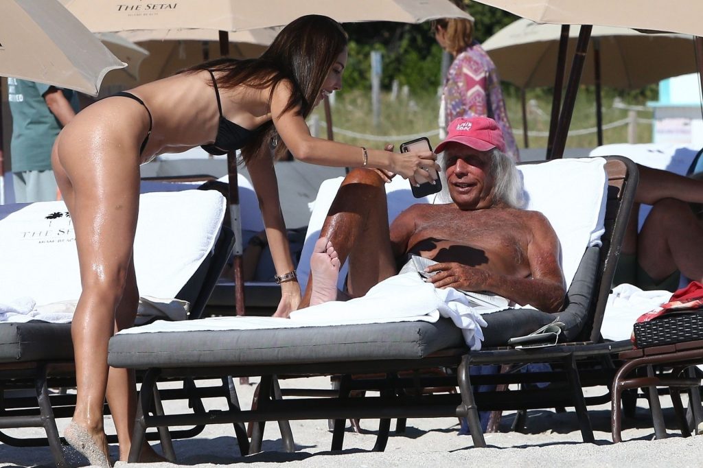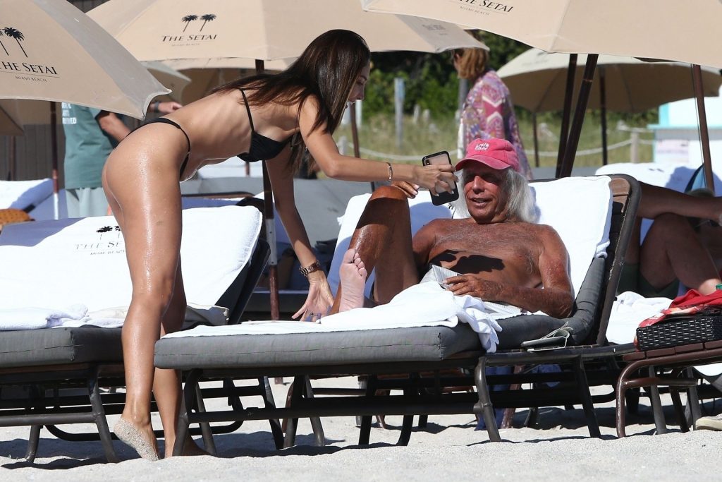Патрисия Контрерас быстро окунается в воду на пляже вместе с “суперфаном НБА” Джеймсом Голдстайном, который отдыхает в пляжном кресле – Майами, 12/07/2019.