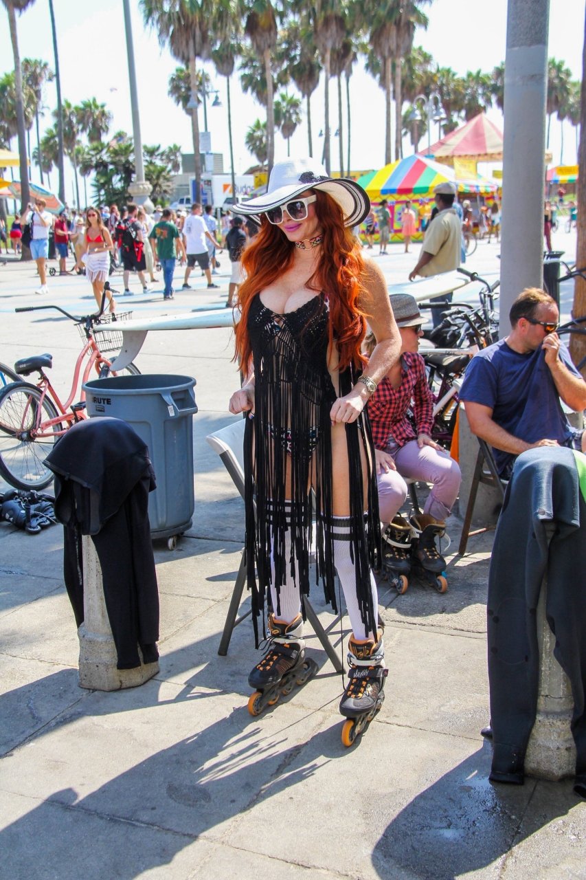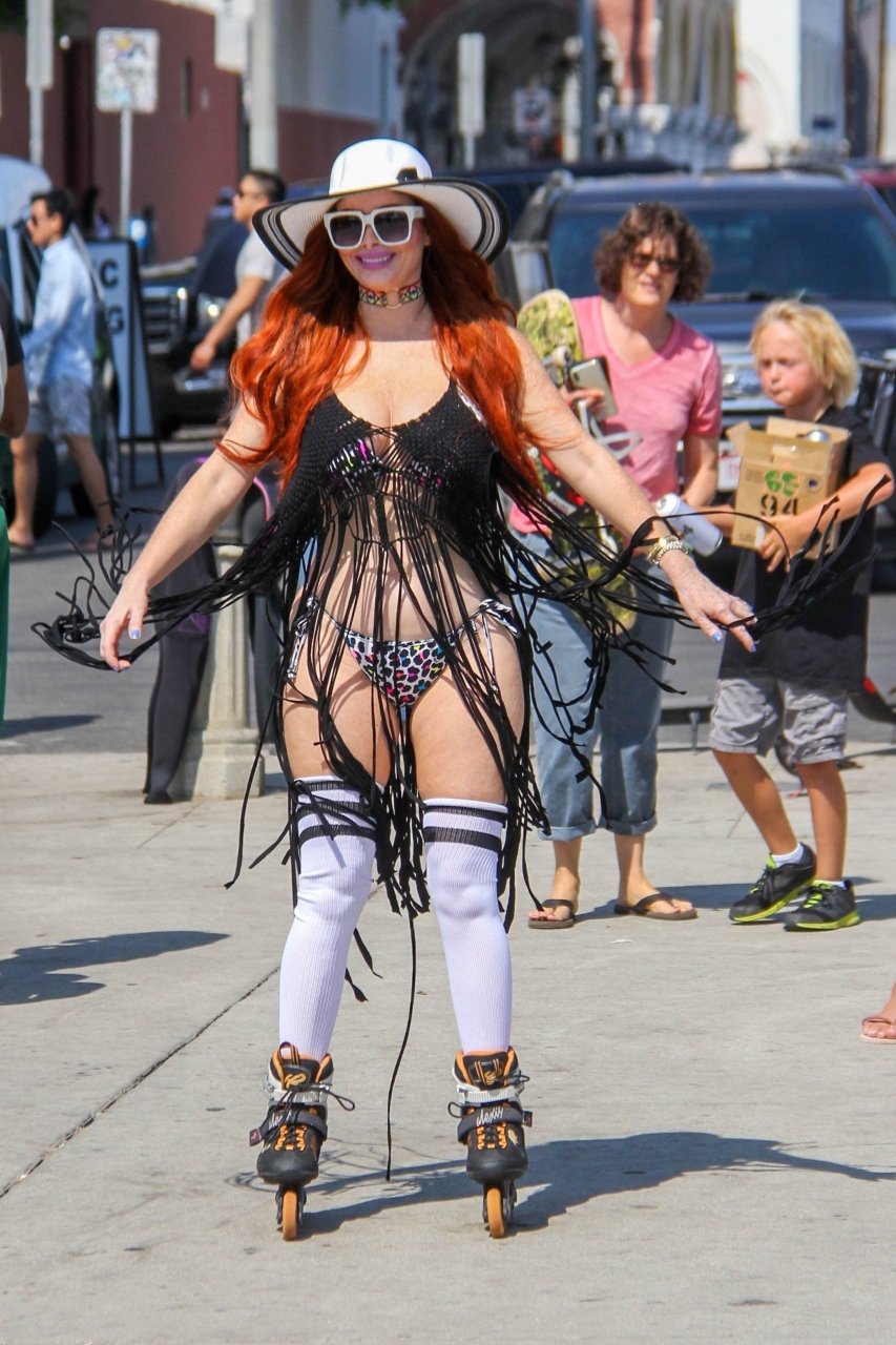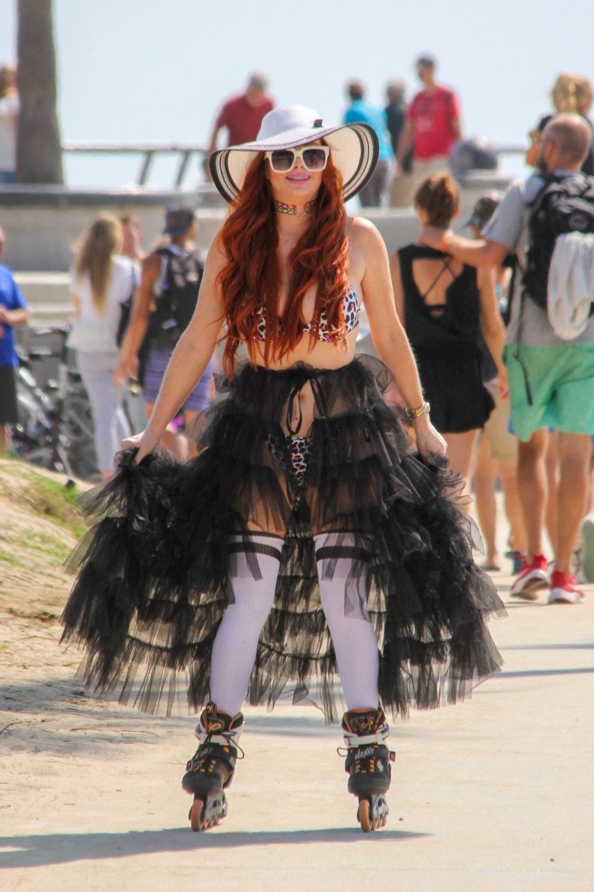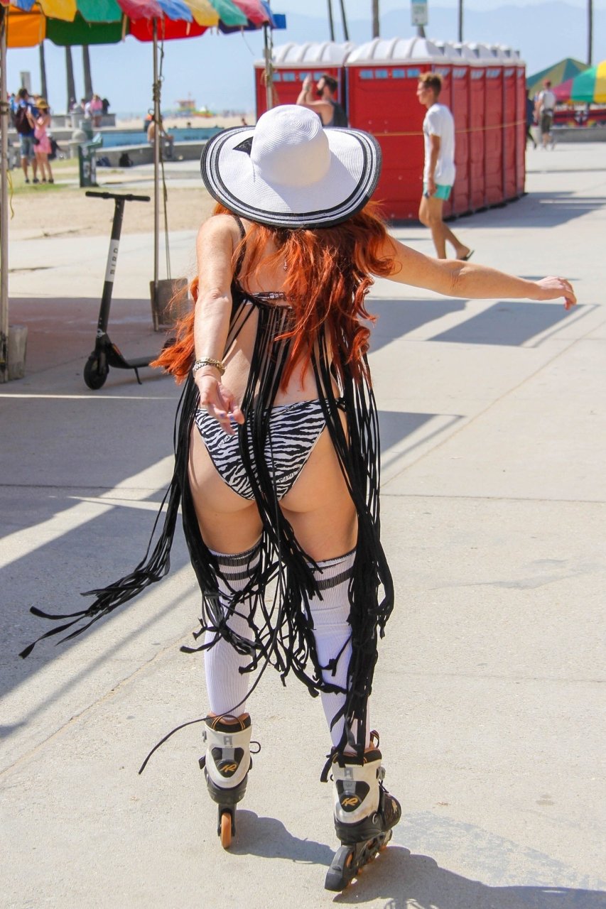 Бывшая актриса Фиби Прайс (45) надевает яркий бикини с леопардовым принтом, катаясь на роликах в Венеции, 08/05/2018. Пытаясь позировать для камеры, она падает и пытается сделать вид, что ничего не произошло.