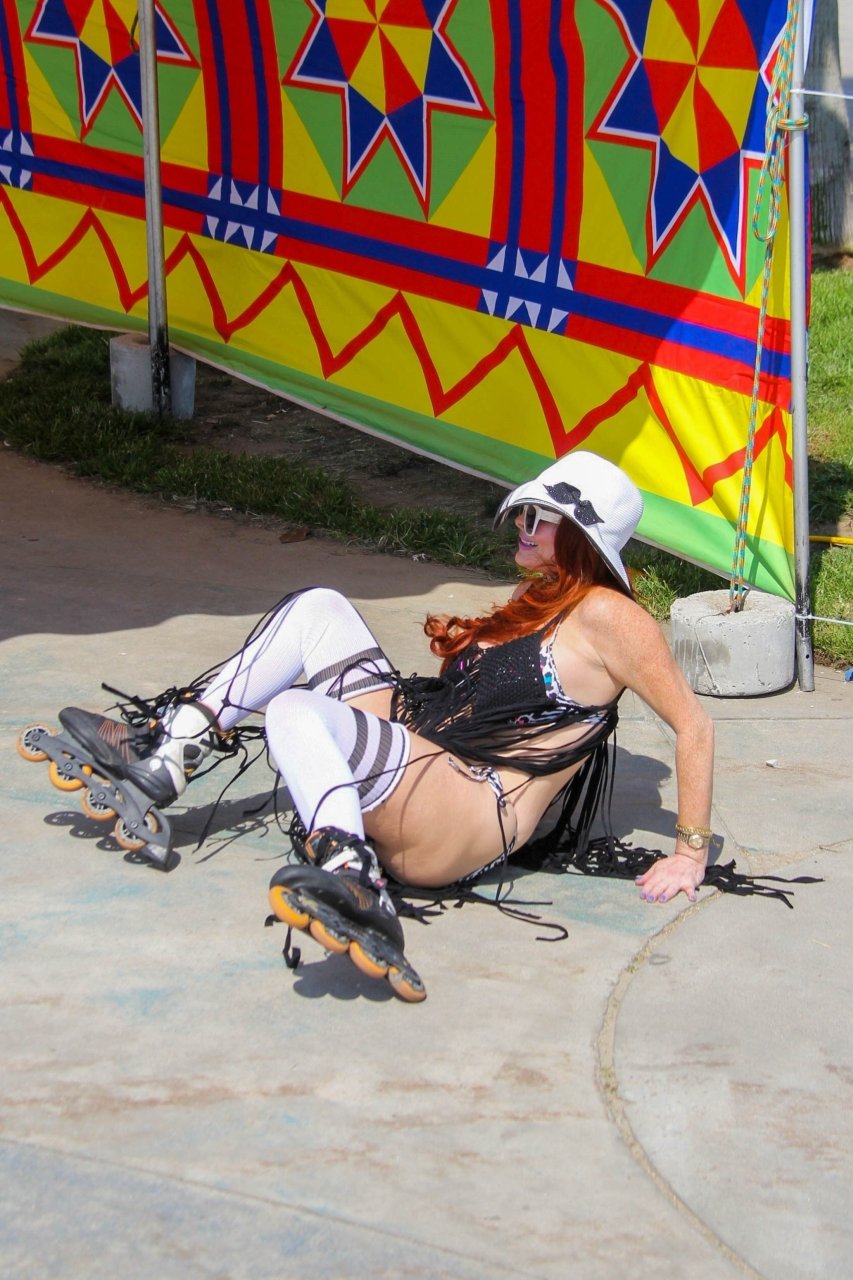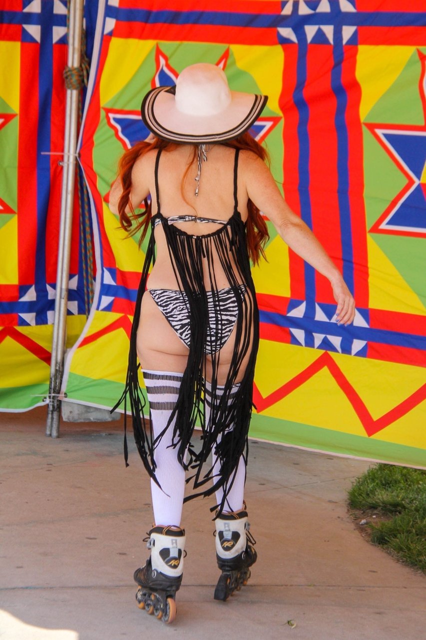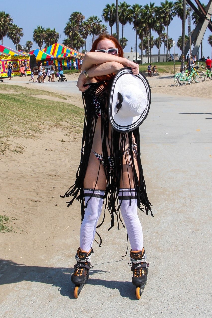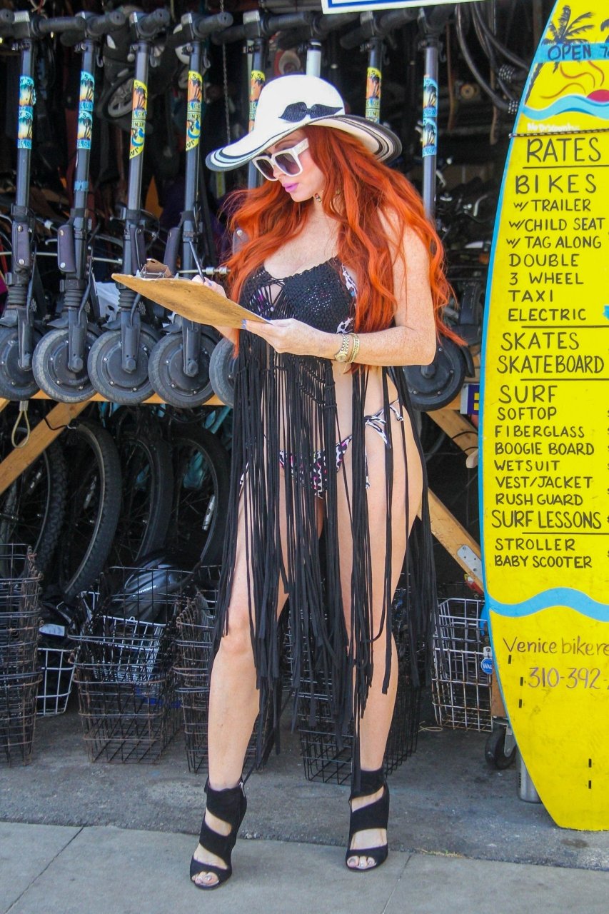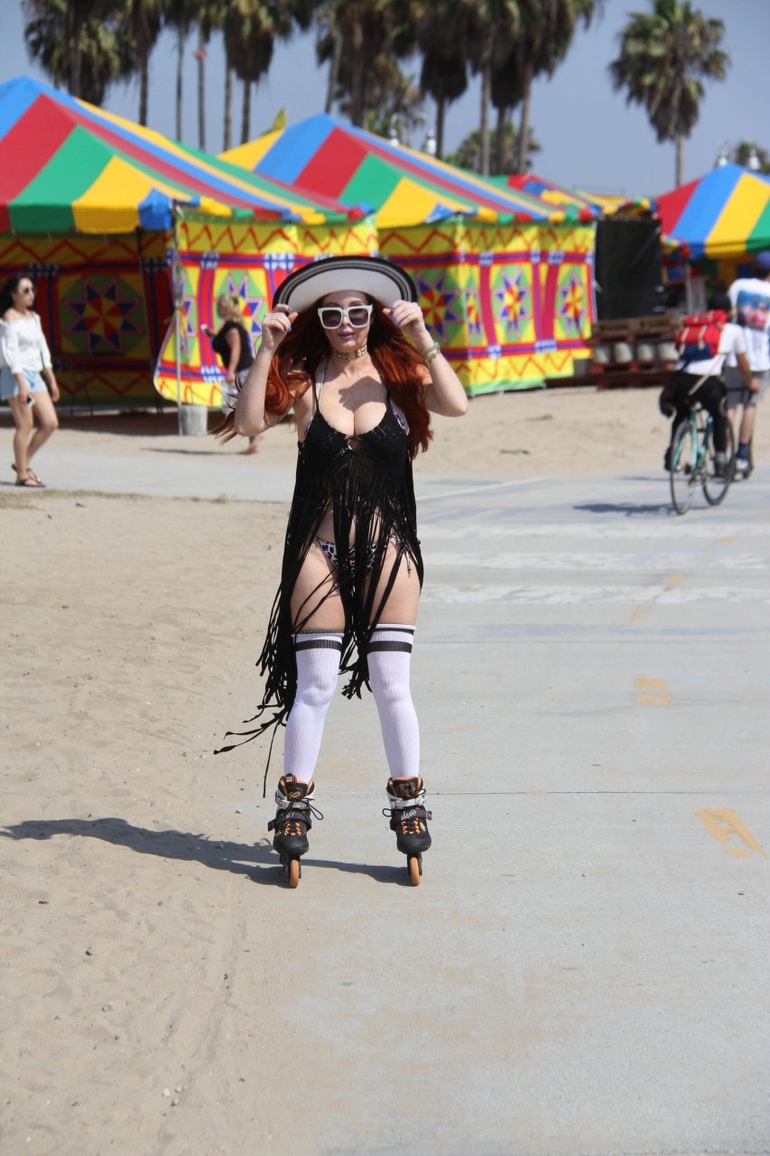Бывшая актриса Фиби Прайс (45) надевает яркий бикини с леопардовым принтом, катаясь на роликах в Венеции, 08/05/2018. Пытаясь позировать для камеры, она падает и пытается сделать вид, что ничего не произошло.