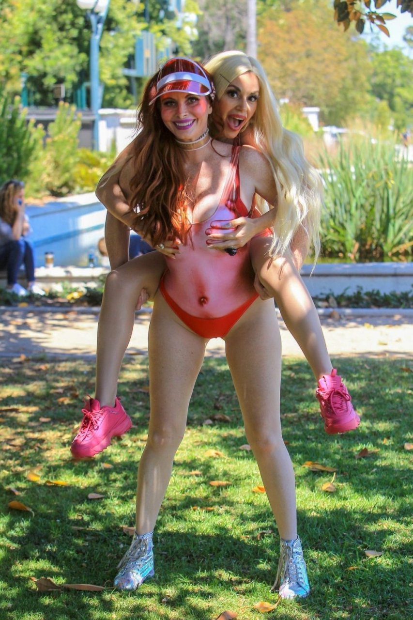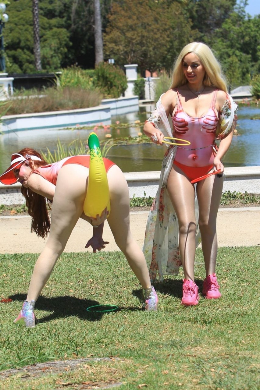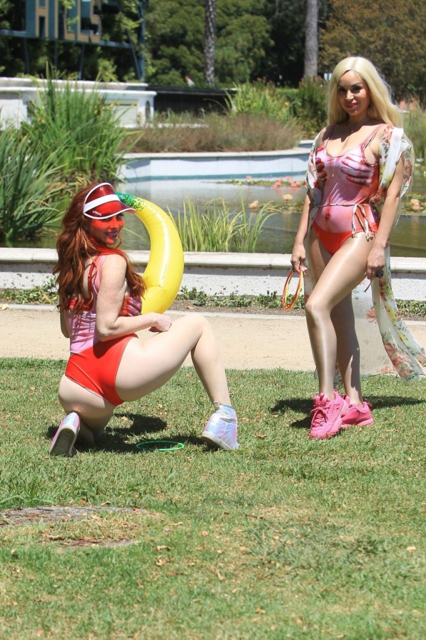 Фиби Прайс и Марсела Иглесиас весело проводят время в парке в Беверли-Хиллз и демонстрируют смелый образ в красных боди, 15.08.2019. Фиби, пора поиграть с “обычным” бананом!