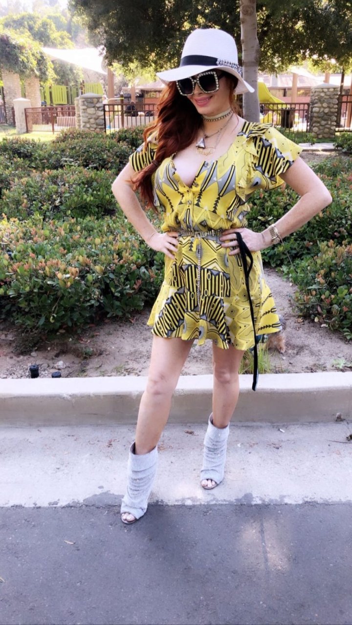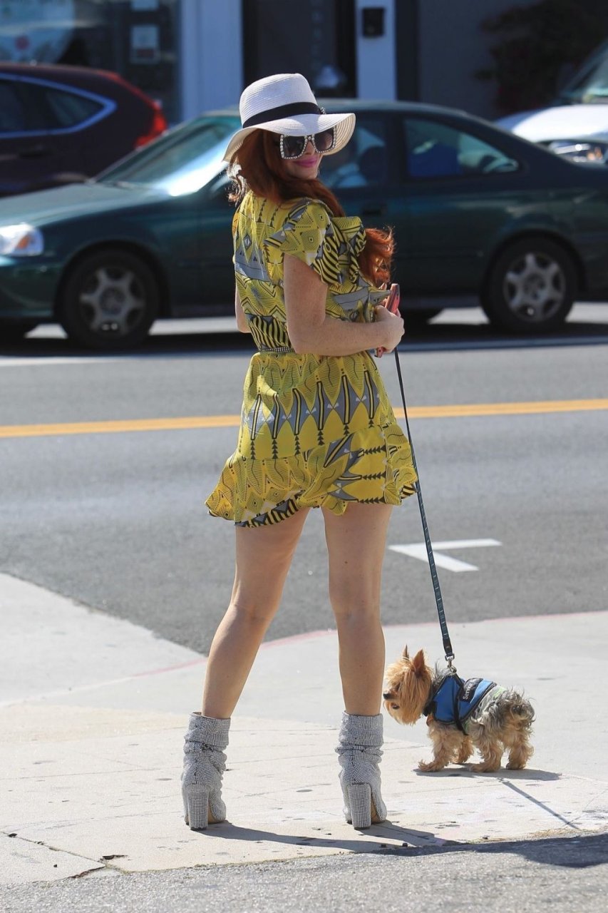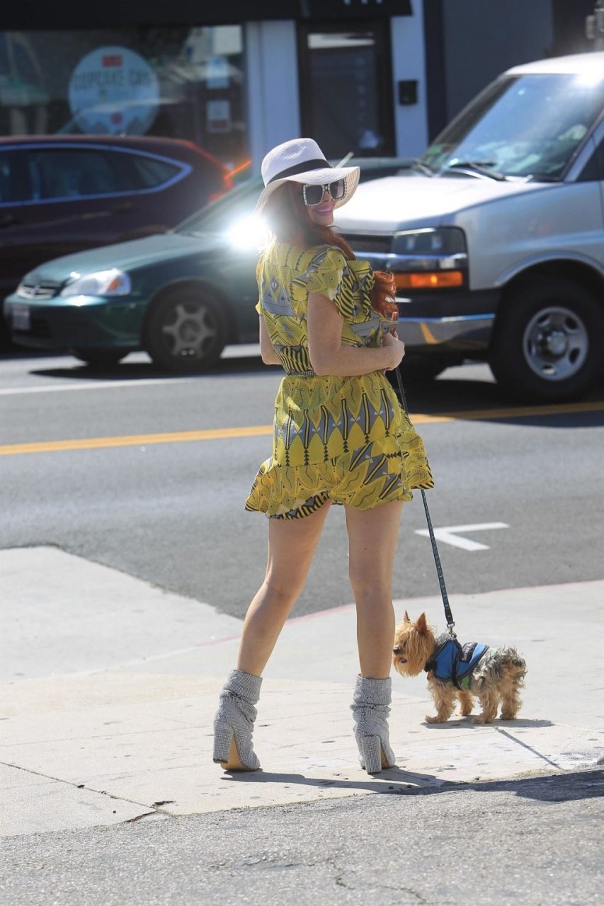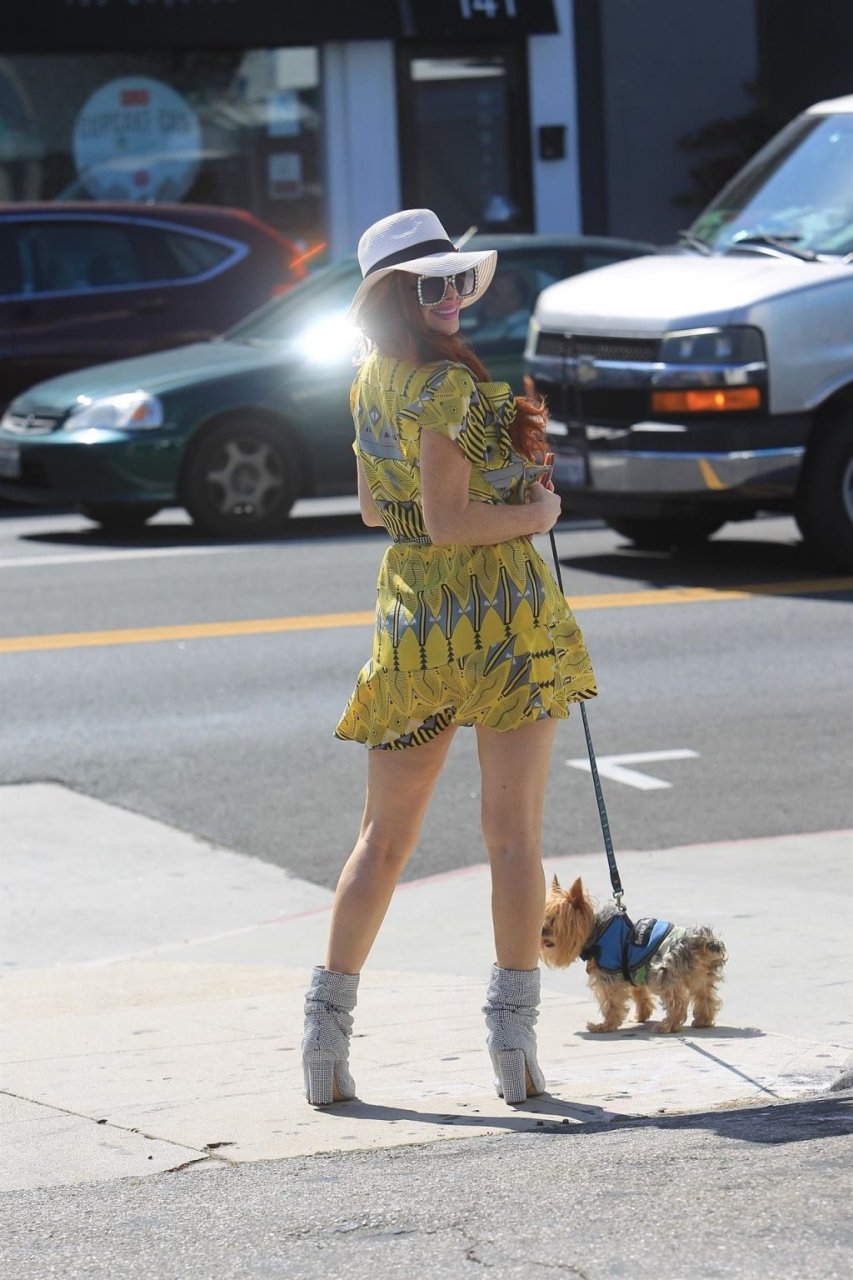 Phoebe Price (46) идет за покупками с собакой в Голливуде в крошечном желтом платье, демонстрируя свою знаменитую грудь, 27.06.2019.