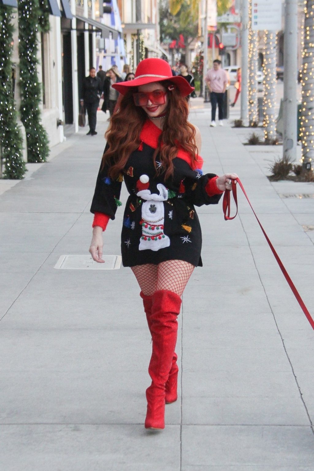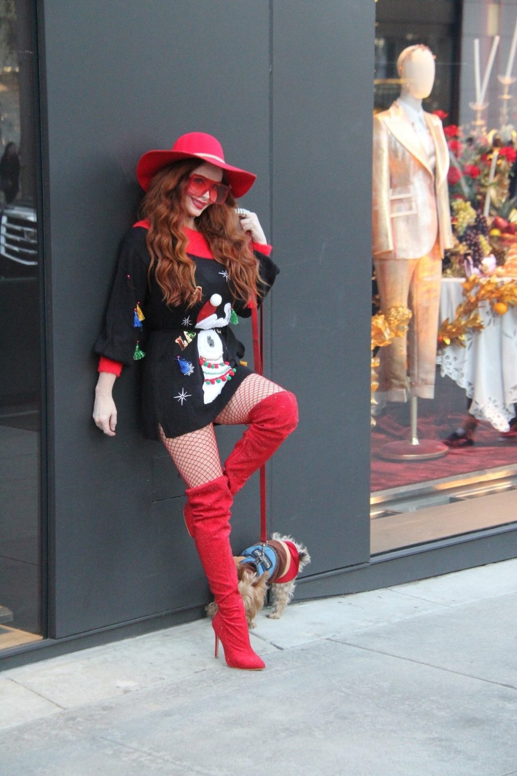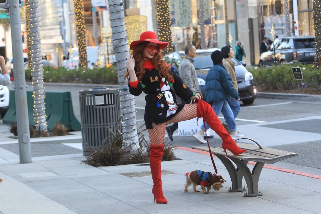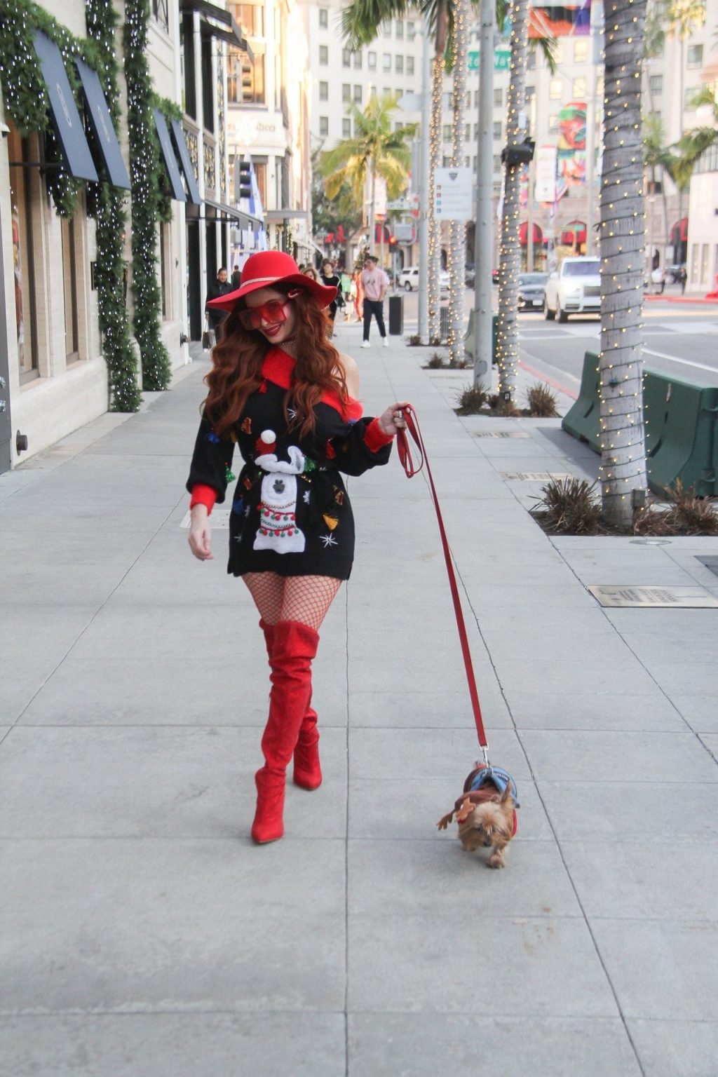 Phoebe Price shows off her ugly Christmas sweater while holiday shopping with her dog in Beverly Hills.