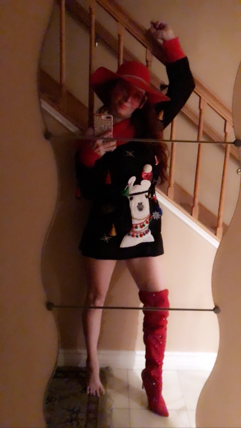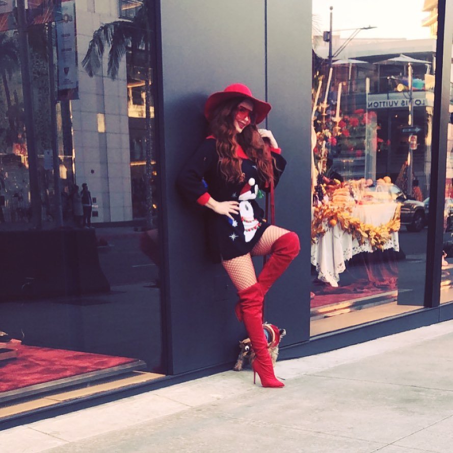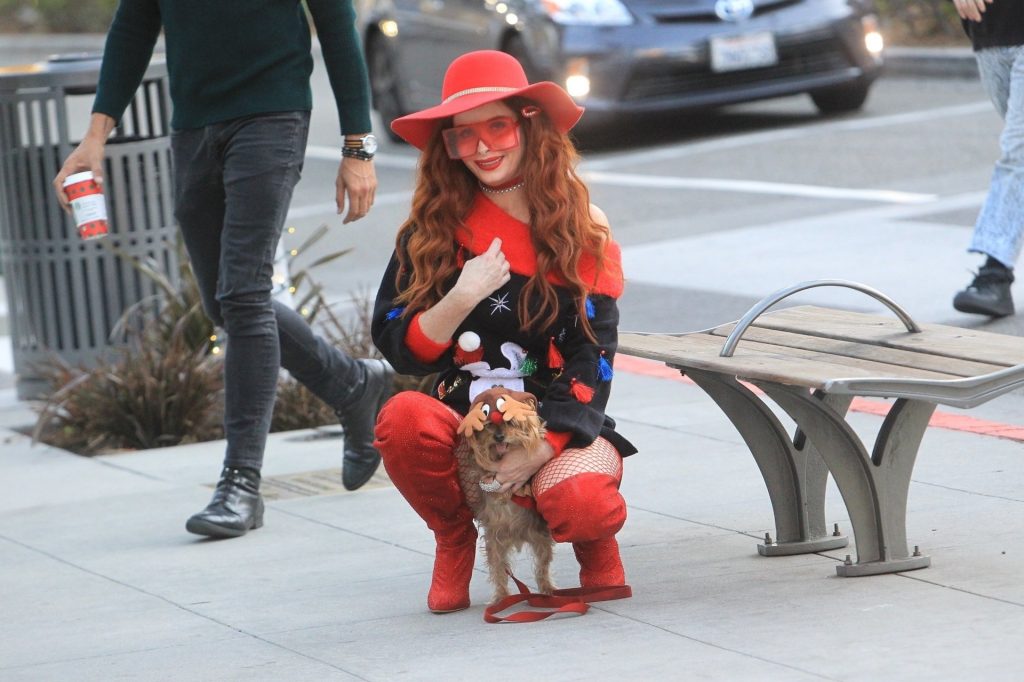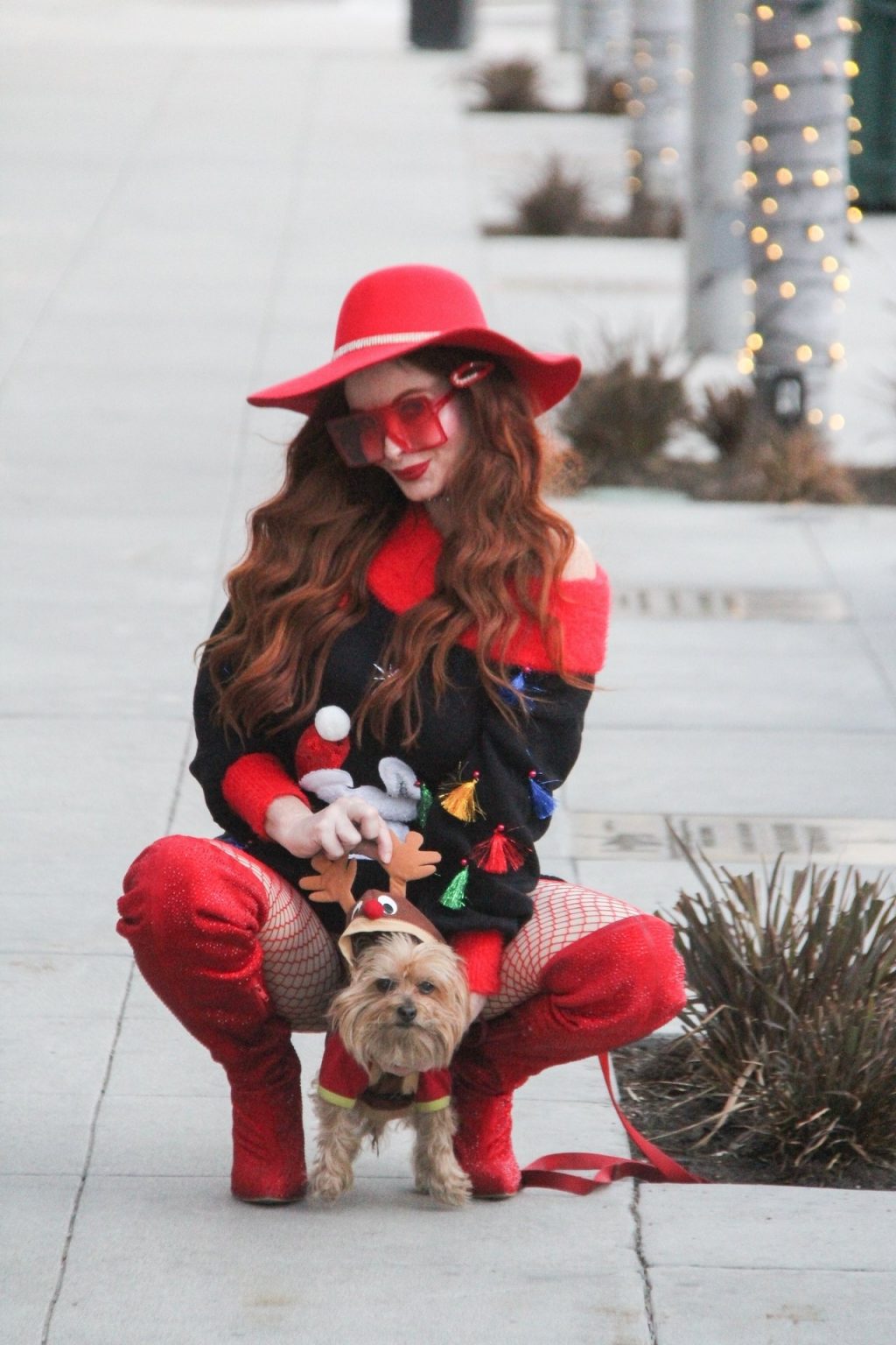 Phoebe Price shows off her ugly Christmas sweater while holiday shopping with her dog in Beverly Hills.